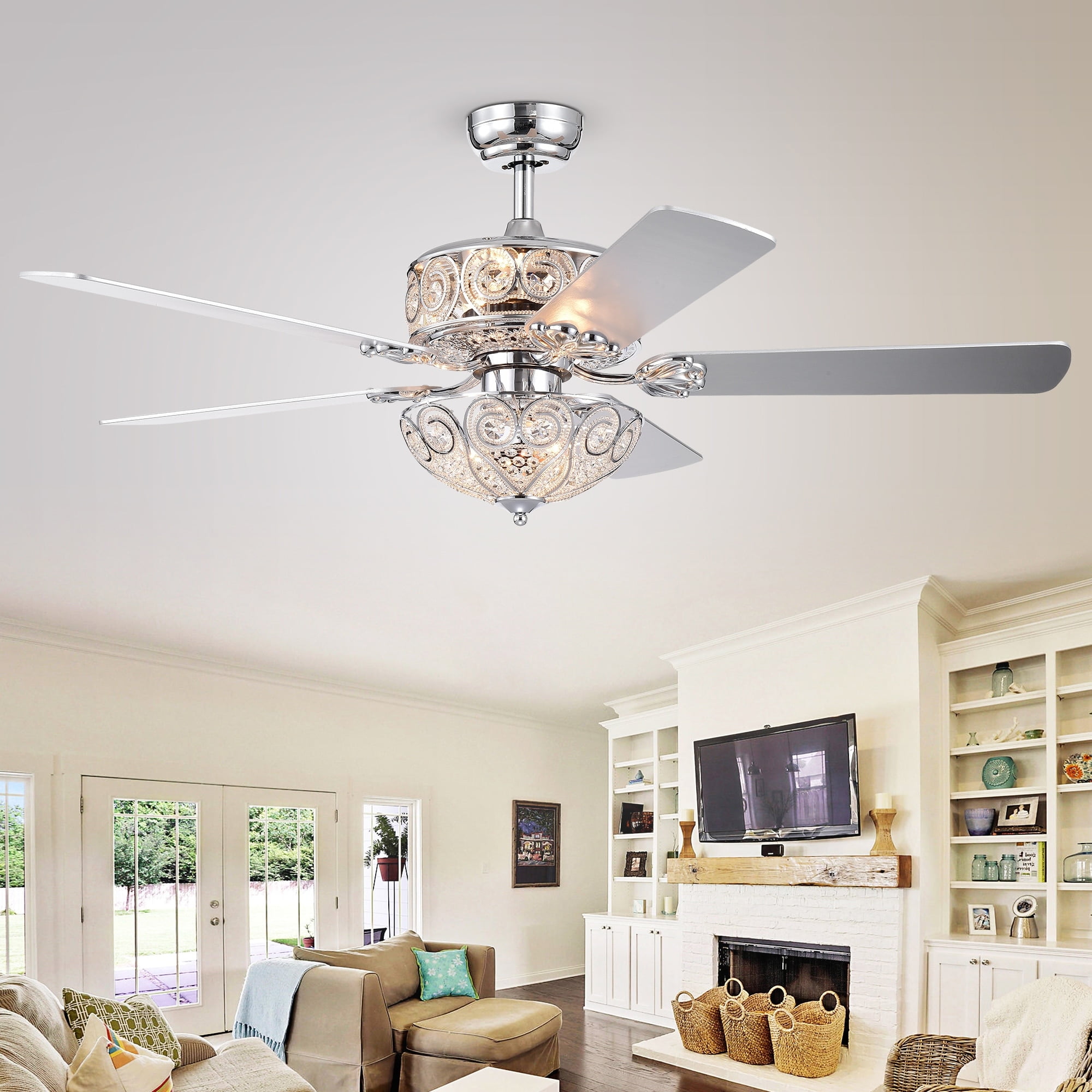 Bring both comfort and luxury to your home with the Catalina Chrome 5-blade 52-inch Crystal Ceiling Fan. The gleaming chrome finish and sparkling crystals make this fixture a statement piece in any room. With a reversible motor and three speed options, this fan is perfect for any climate. Easy and convenient operation is made possible with the included remote control. Features: Glamorous crystal chandelier ceiling fan Five wood blades Six lights with upper and lower bulbs (not included) Reversible motor with line switch operation CSA, ETL, and UL listed for safety and quality assurance