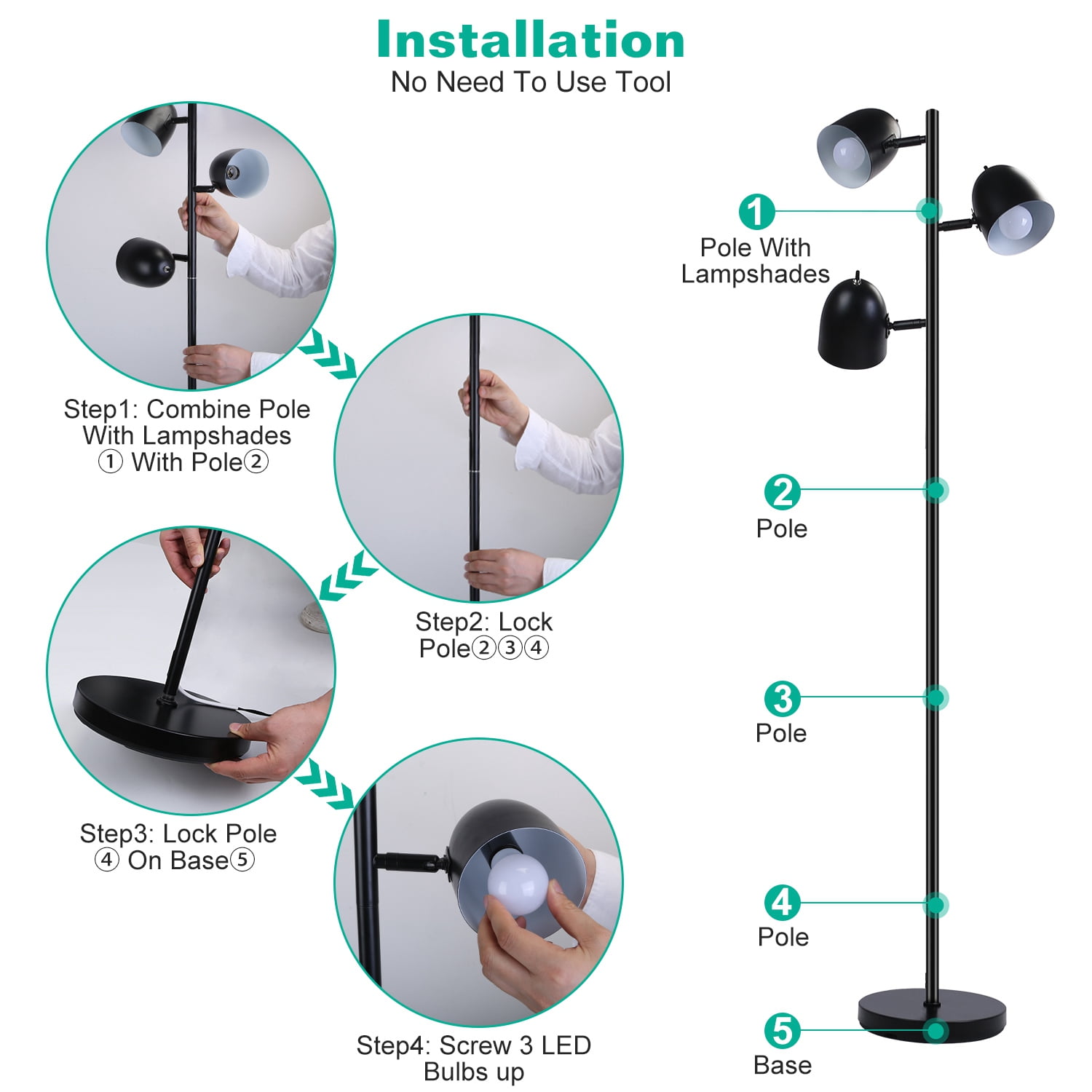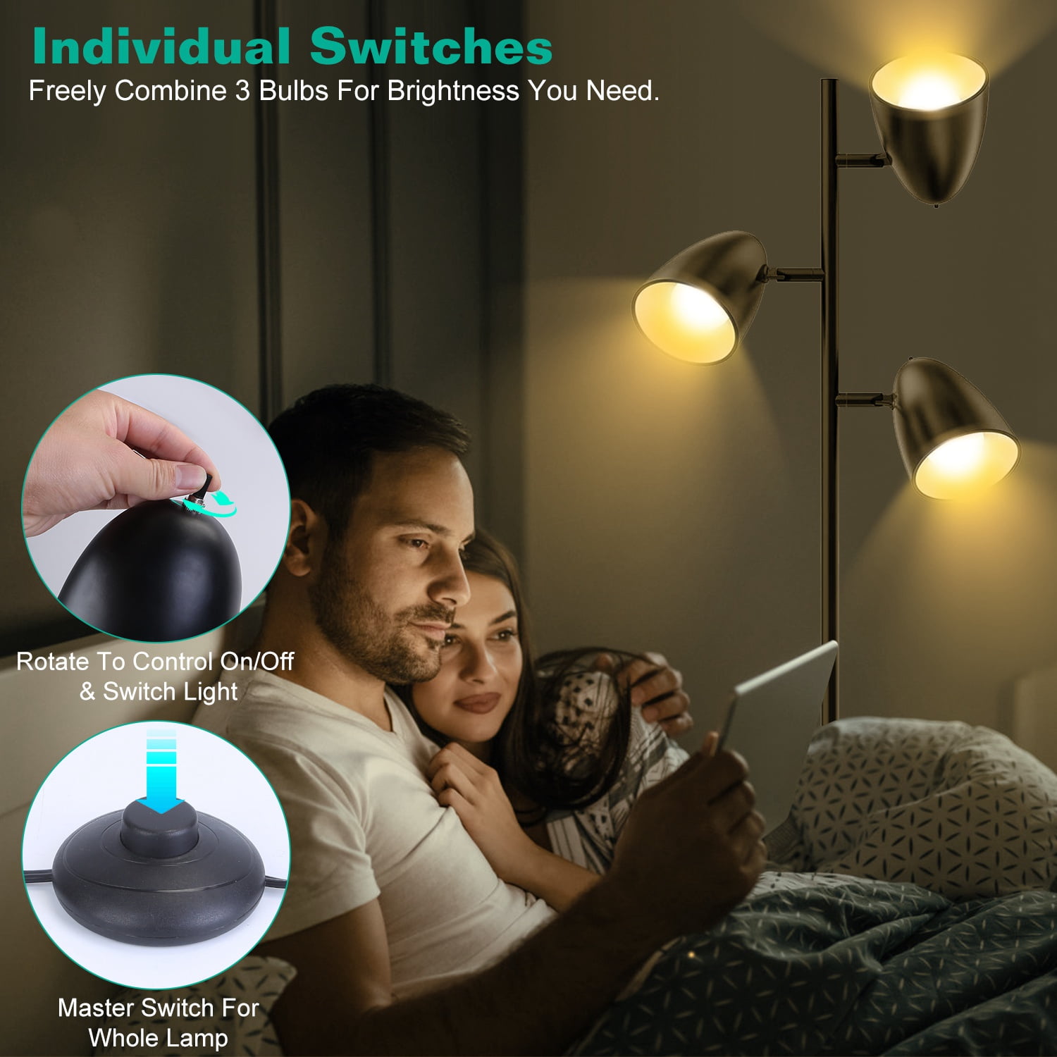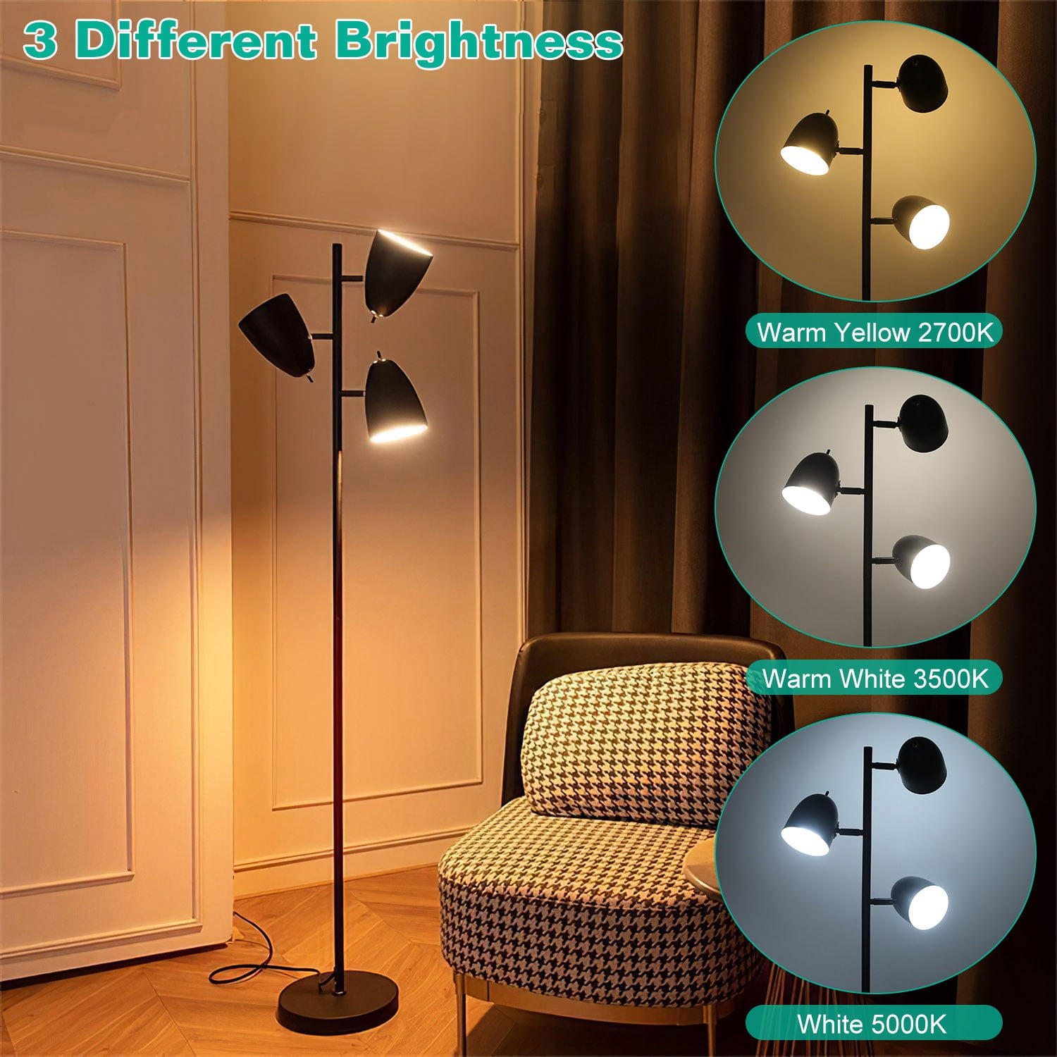 【360° Adjustable Light Arms】To avoid discomfort caused by direct light exposure to the eyes, this standing lamp offers 360° adjustable arms and 180° flexible heads, the material of the lampshade is also metal. Choose the perfect direction to meet your needs. 【3 Light Temperatures】This tree floor lamp comes with 3 LED bulbs, each bulb performs 3 different light colors. Soft warm yellow light is suitable for night stand lamp, creates a cozy atmosphere while drinking coffee or watching movies. 3 light colors provide you comfortable lighting atmosphere and meet your various brightness needs. 【Individual Rotate Switches】Considering the personal usage habit of daily life, each top of the lampshades has individual knob to control power. You can freely combine these 3 bulbs for the brightness you want. Turn on all the bulbs for bright lighting or only 1 bulb for easeful sleeping. 【Sturdy Base】Our floor lamp adopts a stable metal base and weighted, making it sturdy and safe when children and pets run around. Without occupying too much space, rounded base slides inconspicuously into narrow corners. 【Easy To Install】No need to use any tools, follow the installation guide can easily install this tree lamp in few minutes. Not only a lamp, but also an excellent decoration suits diverse decor styles, like classic, traditional, contemporary, minimalist decor styles, etc… Specification: Brand: TeqHome Product Type: Tree Floor Lamp Material: Metal+LED Color: Black/Silver/Gold Light Color: Warm Yellow, Warm White, White Lifespan:20000H Power Controller Type: Button Control Individual Bulb Controller Type: Knob Control Power Source: Corded Electric Color Temperature: Warm Yellow(2700K), Warm White(3500K), White(5000K) LED Bulb: 3Pcs Bulb: A19 Lumen: 480lm/Bulb LED Bulb Power:6W Voltage:110V Plug: US Power Cord Length: 217cm/85.4in Lampshade Size: 15x10cm/5.9×3.9in LED Bulb Package Size: 5x5x9cm/1.9×1.9×3.5in Item Size: 163×24.8×24.8cm/64.1×9.7×9.7in Item Weight: 4.7kg/10.3lbs Package Size: 44*33*19cm/17.32*12.99*7.48in Package Weight: 5.2kg/11.46lbs Package Contents: 3x LED Bulbs 3x Normal Poles 1x Pole With Lampshades 1x Base Tree Floor Lamp; Living Room Standing Light; Metal Rotatable Lamp; Bedroom Reading Lamp; Modern Style; Adjustable Arms; Individual Rotate Switch; 3 Lighting Temperature