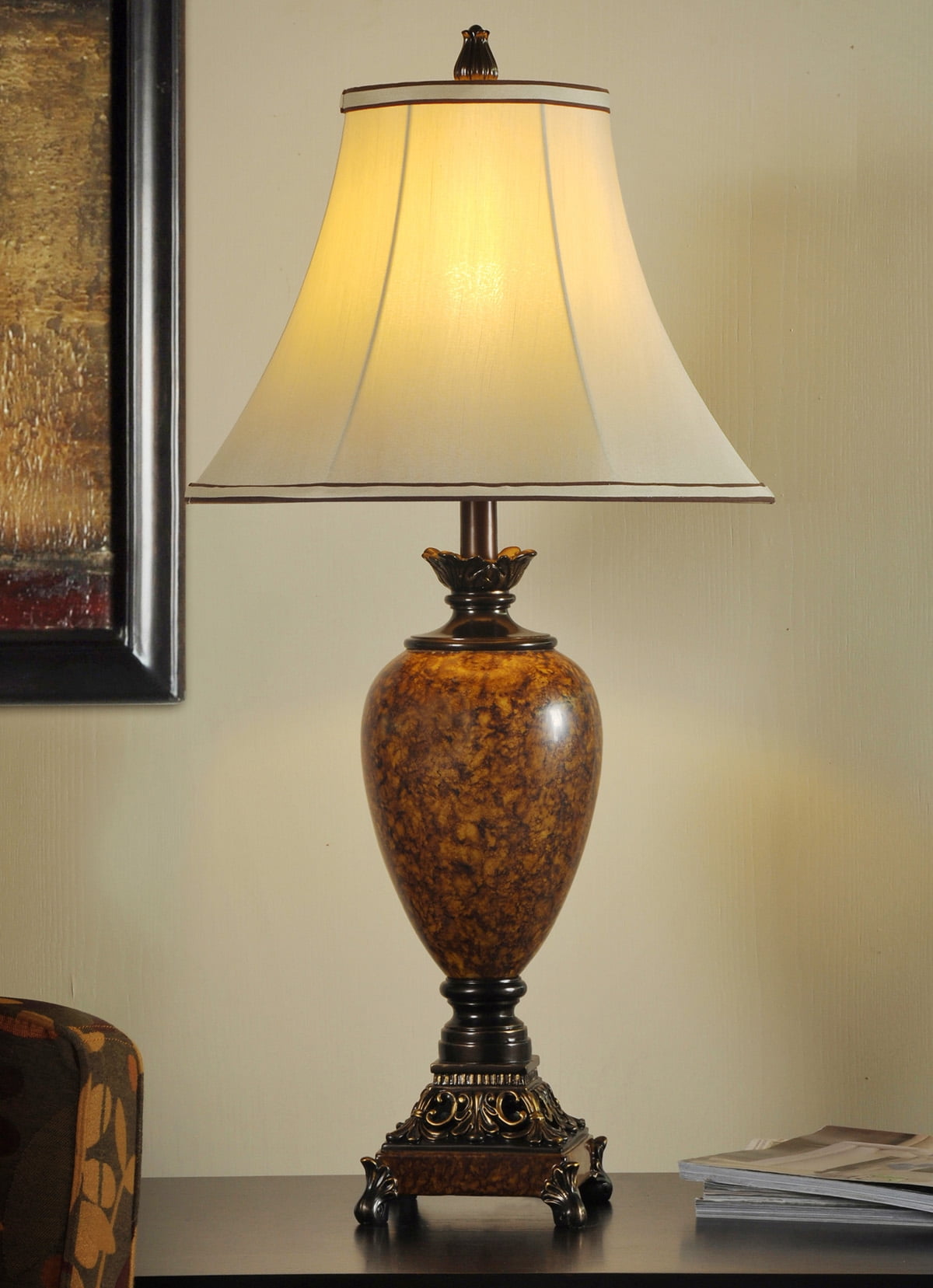 This lovely brown table lamp has an embellished base and a matching finial. The gleaming marble finish on the frame highlights each detail of the ornate design. A taupe fabric shade with dark brown details is the final touch that makes this elegant table lamp ideally suited for an office, bedroom, living room, hallway, or dining room.