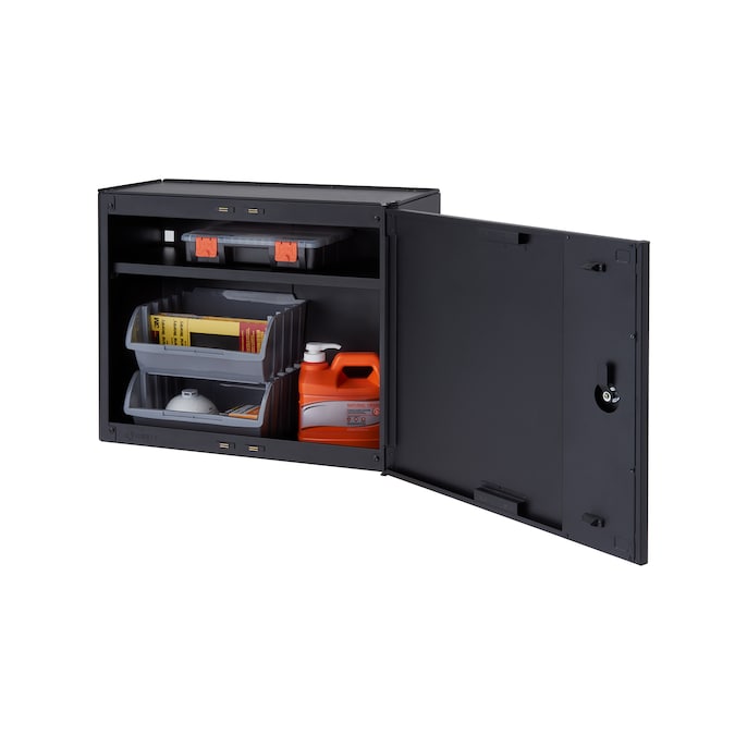 TRINITY’s 24 in. textured black wall cabinet is perfect for all your garage, basement, or mudroom storage needs. The cabinet door can be mounted to open either left or right to fit your preference, and includes an adjustable shelf for more storage options. Designed with our quick assembly system, you can have this unit set up in 30 minutes or less!