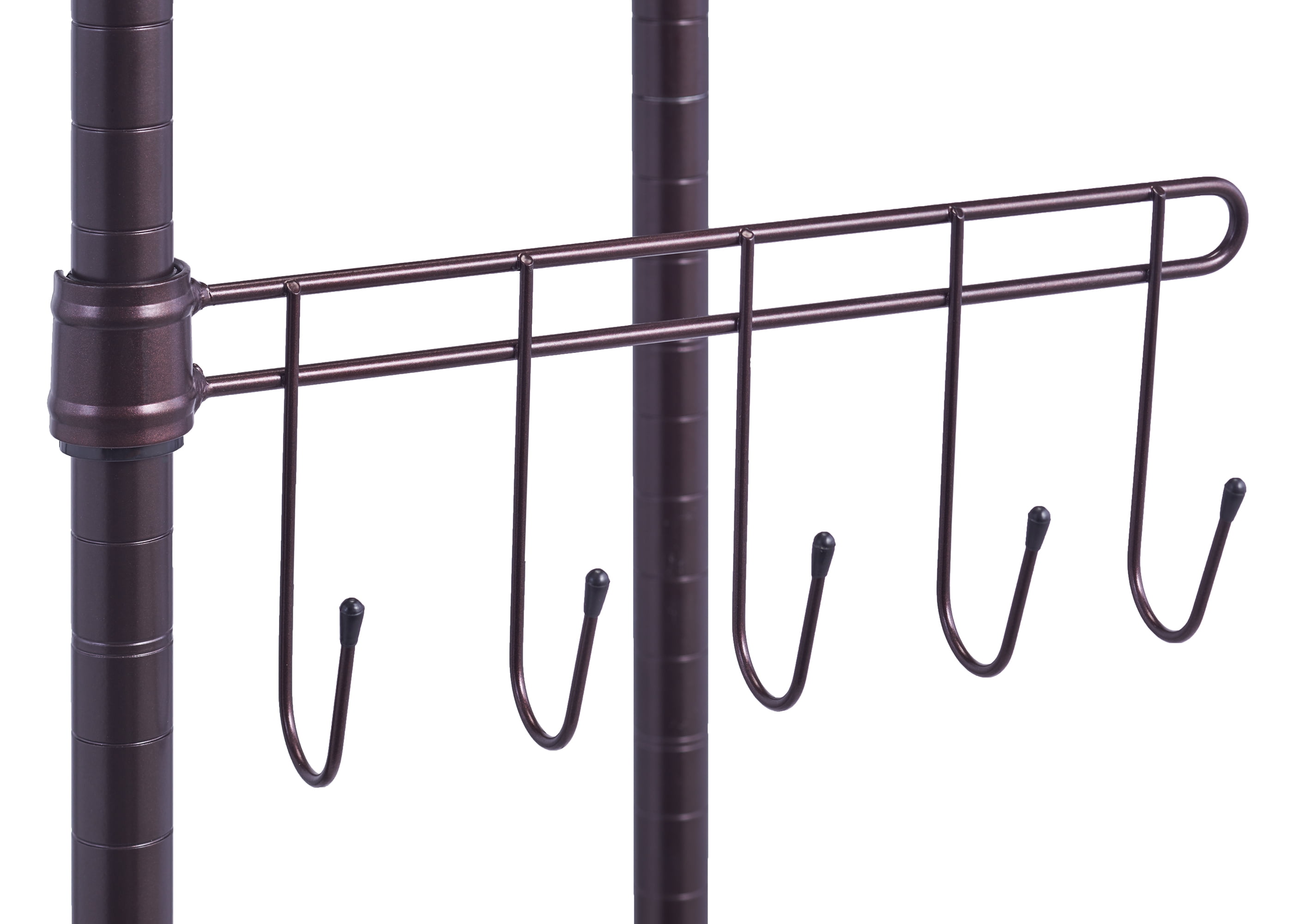 Dark bronze powder coated finish (2) 41″ W x 14″ D shelves – 60 lbs. per shelf (1) 28″ W x 14″ D shelves – 40 lbs. per shelf (2) 14″ W x 14″ D shelves – 25 lbs. per shelf (2) Hanging rods – 40 lbs. per hanging rod (1) Sidebar w/ hooks – 10 lbs. total weight capacity 300 lbs. total weight capacity (6) 3″ x 1″ swivel wheels – (2) locking, (4) non-locking Shelves and sidebar adjustable in 1″ increments Easy, no-tool assembly
