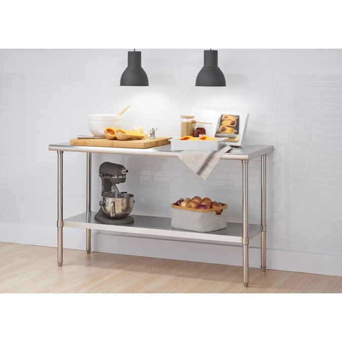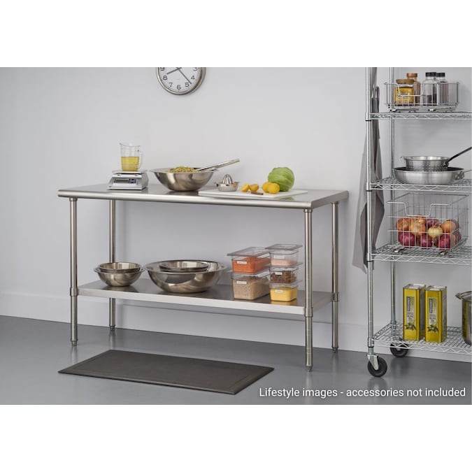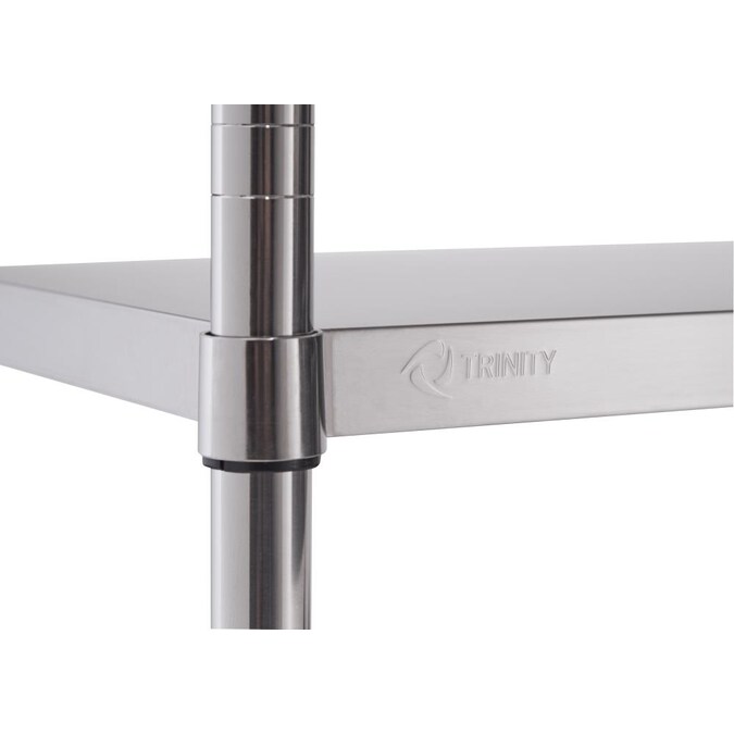 TRINITY PRO all stainless steel commercial table is great for any restaurant, garage, or food processing operation. Heavy duty and NSF certified, the durable 18-gauge 60″W x 24″D stainless steel top is reinforced to handle the toughest tasks. The bottom shelf can be adjusted in 1″ increments, and the table is designed with rounded edges and corners for safety. Easy, no tool assembly!