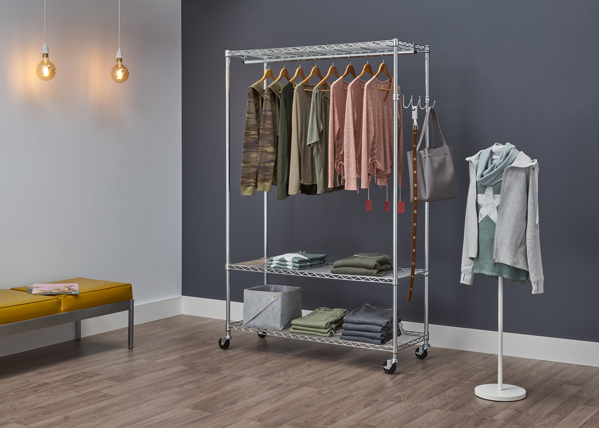 Chrome color EcoStorage® finish represents eco-friendly production: no toxic chromium is released into the environment during the production of this product Clothing storage for living areas with limited closet space