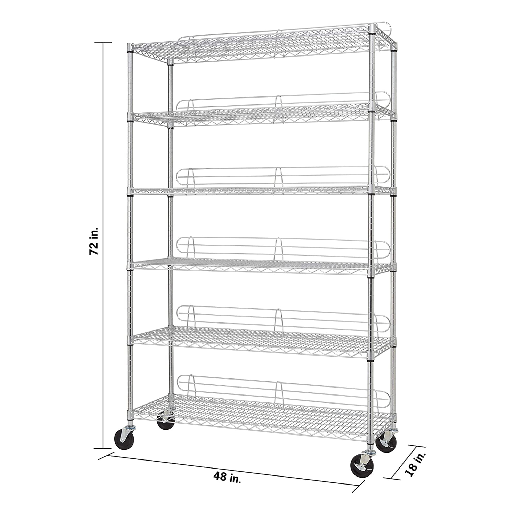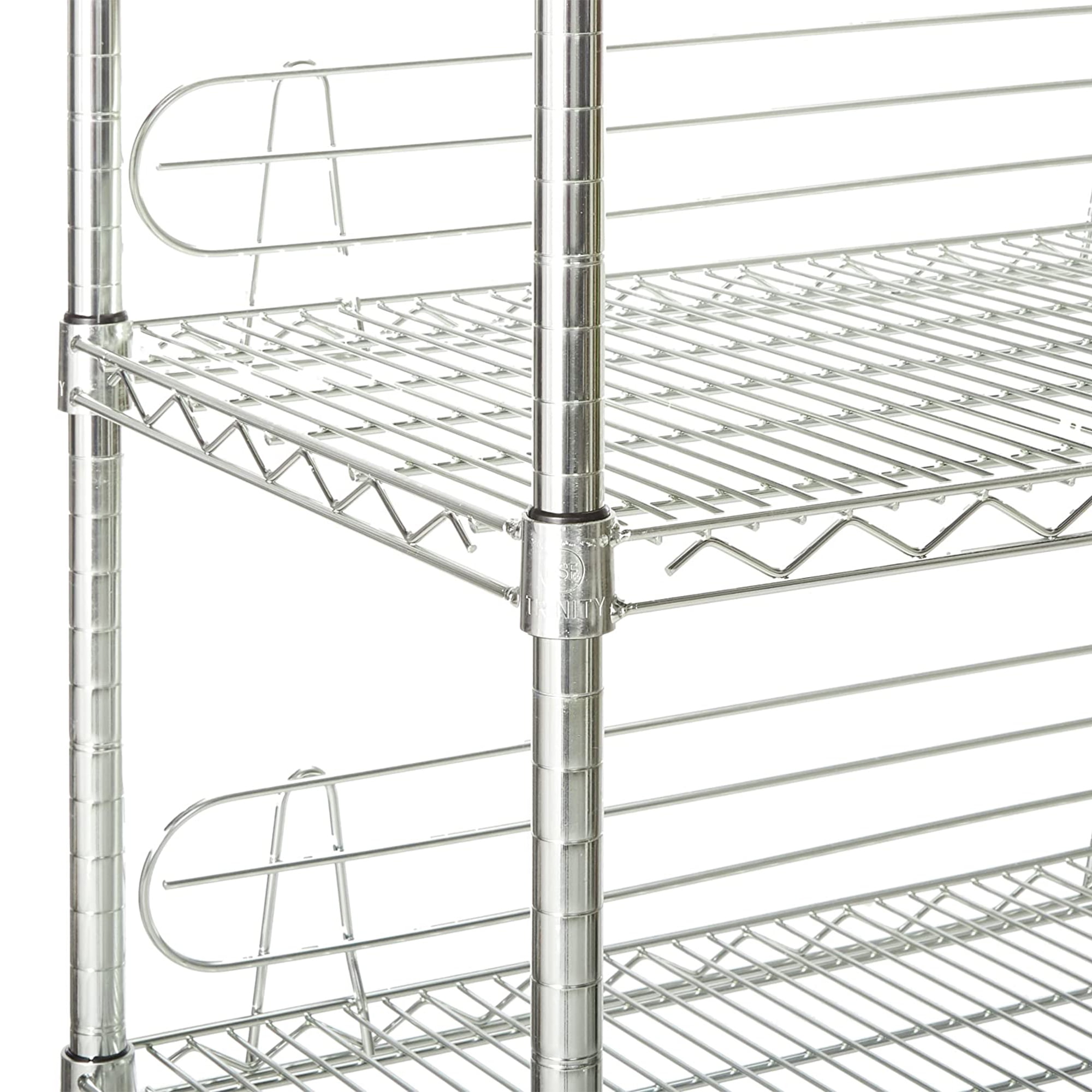 TRINITY EcoStorage 6-tier wire shelving rack with mobile and stationary options is ideal for business, home, garage, or kitchen use Heavy-duty tiers each hold 800 pounds on feet levelers and 133 pounds on wheels for storage of heavy boxes, oversized items, and everything in between Assembly requires no tools and uses a slip-sleeve locking system that adjusts shelves in 1-inch increments Mobile and stationary options with (2) locking, and (2) non-locking wheels for easy mobility of your stored items On feet levelers this heavy-duty shelving rack has a total weight capacity of 4,800 pounds; 800 pounds on wheels Material: Metal Color: Silver Dimensions (L x W x H): 48 x 18 x 72 inches Weight: 84.3 pounds Manufacturer’s warranty: 1-year limited warranty