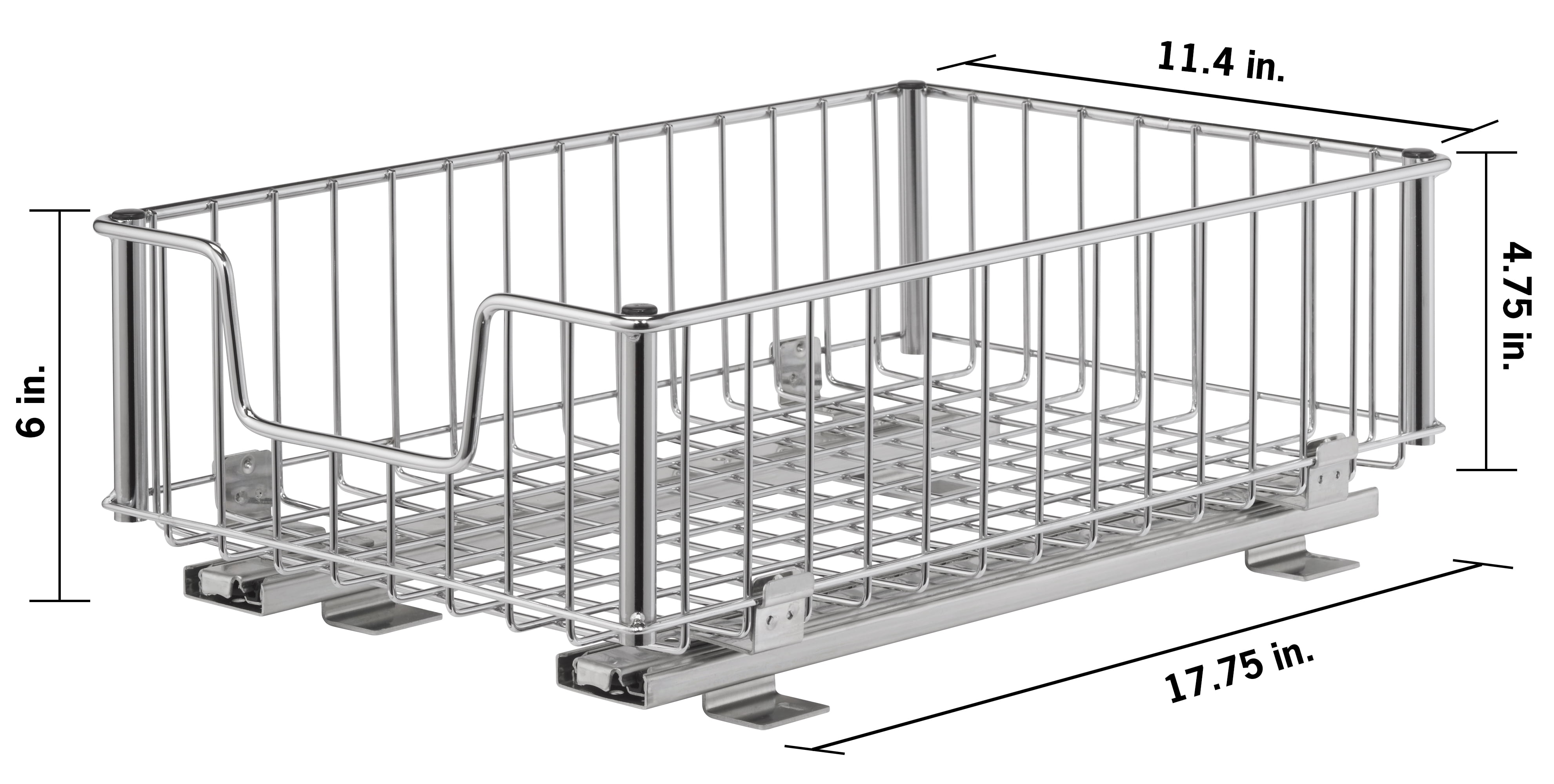 Chrome Drawers can be attached to cabinets (both kitchen and bath) 13″ or wider Drawers can be attached to wire shelving 18″ deep 50 lb total weight capacity Mounting hardware included Sliding drawers (2-pack) – Includes (2) drawers, (2) pairs of slides