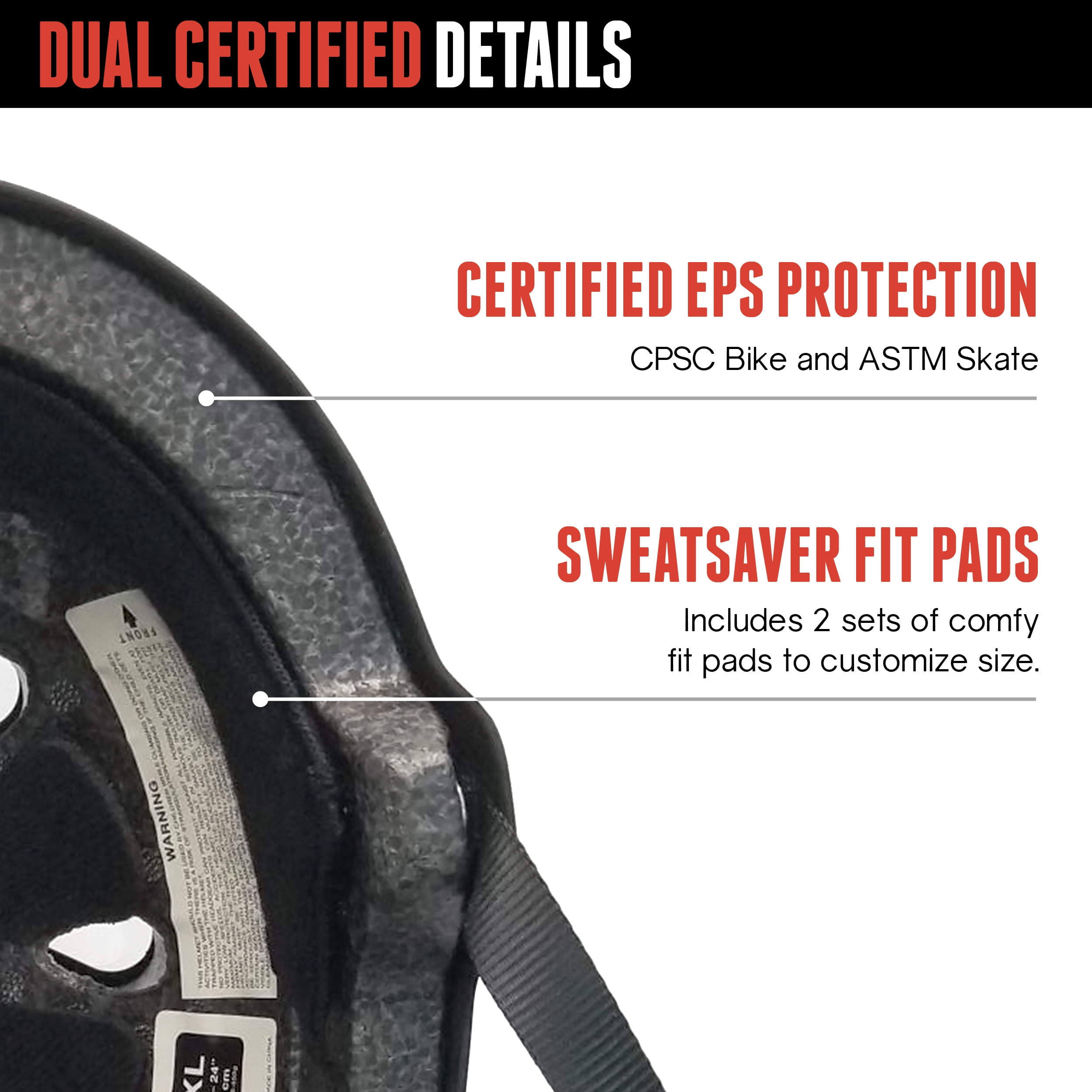 Triple Eight Dual Certified Bike Skateboard and Roller Skating Helmet is the perfect blend of classic Triple Eight style, with unparalleled fit and protection. Dual-certified for both bike and skate, its ABS shell with impact-absorbing EPS foam liner is engineered for a close fit and low profile. Ideal for biking, skateboarding, scooters, BMX, roller derby, and commuting, the helmet complies with U.S. The Triple 8 Dual Certified Bike and Skateboard Helmet includes two different sets of removable Sweat saver Fit Pads to customize fit, and has an adjustable chin strap with side release buckle.