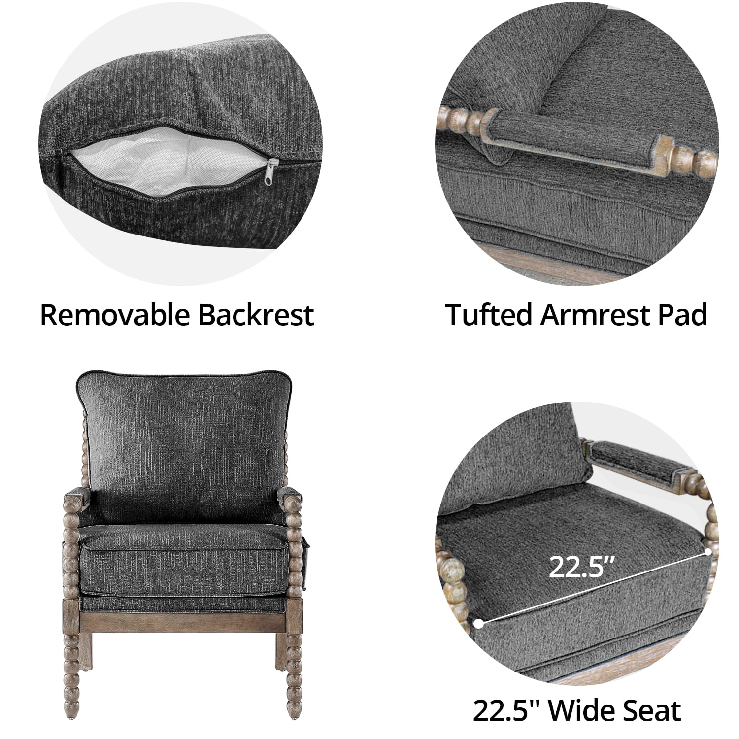 Triple Tree Stylish RUBBER WOOD FABRIC Armchair with Cushion, Black Features a vintage spindle design and elegant wood finish, adding retro chic visuals to enhance any living room, bedroom, reading room, or office Equipped with cylindrical springs, serpentine springs, and dense foam in the seat cushion for enhanced support, elasticity, and comfort Overall dimensions of 26.5” x 30.75” x 35.5” with a seat size of 22.5” x 25.5” x 5.5” offer more space Constructed from durable natural rubber wood, ensuring longevity and resistance to deformation, with a maximum weight capacity of 330 lbs Includes a removable backrest with a zipper for easy cleaning, padded armrests for added comfort, and anti-slip pads to protect your floor from scratches