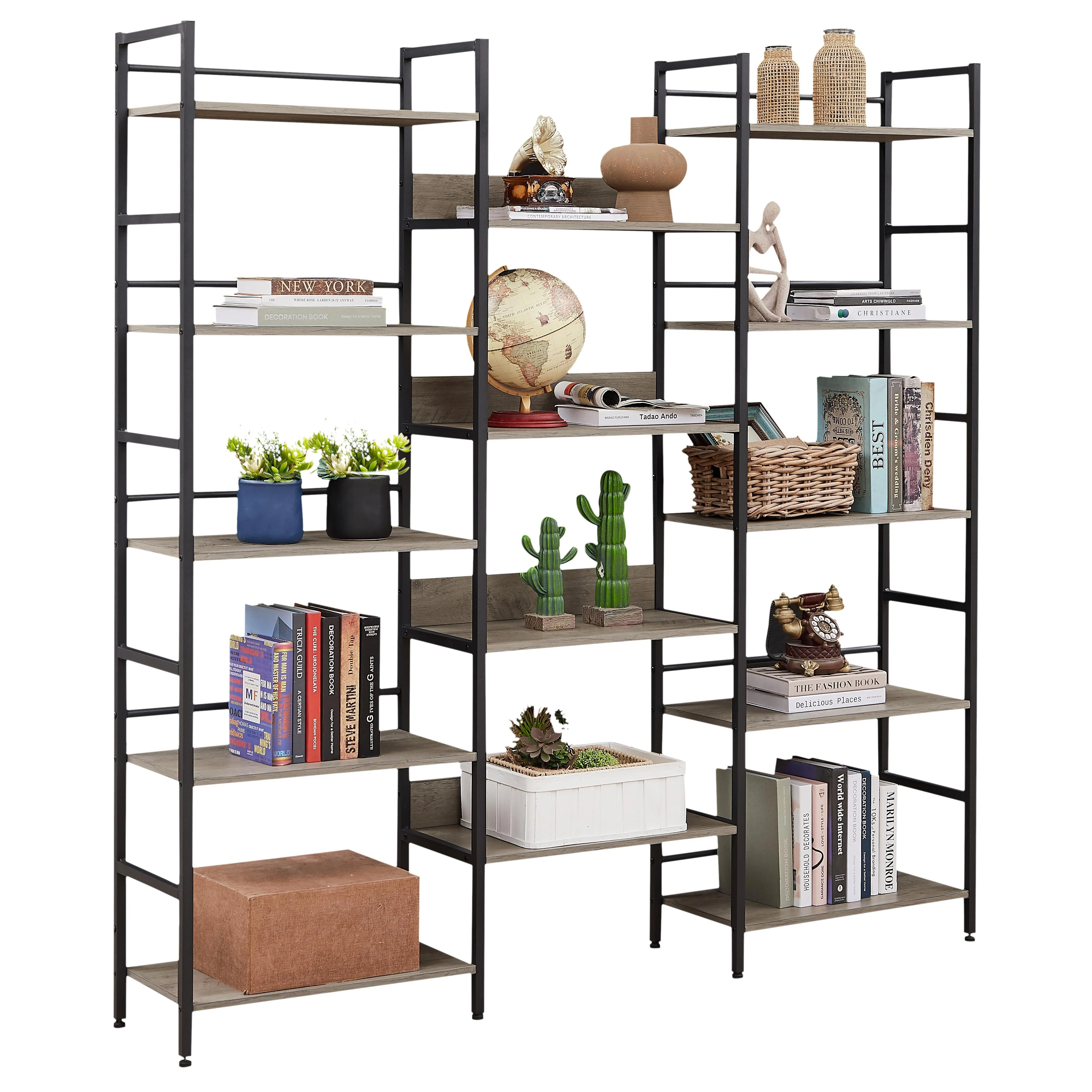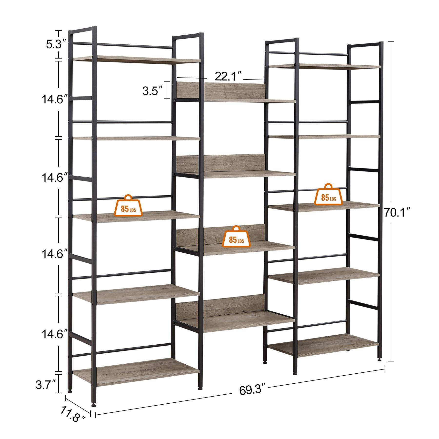 Triple Wide 5-shelf Bookshelves Industrial Retro Wooden Style Home and Office Large Open Bookshelves,69.3″W x 11.8″D x 70.1″H Product information Product type:Bookshelves Color:Dark Grey, Black Material:Chipboard Panel with Melamine Veneer, Steel Structure Total Product Size:69.3″W x 11.8″D x 70.1″H Weight capacity of each shelf: 30lbs. Assembly Required:About 50min Number of packages:1 Package Contents:1 x Bookshelves 1 x Assembly Kit 1 x Instructions Made of high-quality metal frame and engineered wood, each plank can hold up to 85 lbs. The three wide display racks feature 14 open shelves, maximizing storage space and improving space utilization. There is a guardrail design on the back of the bookshelf to prevent your items from falling into the gap between the bookshelf and the wall. Equipped with anti-tipping design, it is safer to use. 8 adjustable feet keep it stable and won’t scratch the ground. It is also a beautiful display stand to display your decorations. Can be used in living room, bedroom. Prevention of dumping Installation of fixing straps can greatly improve safety and stability. Adjustable feet The bottom is fitted with 8 adjustable feet for stability. Large storage space Featuring 14 spacious display shelves for space utilization and a back rail design to prevent items from falling through the cracks.