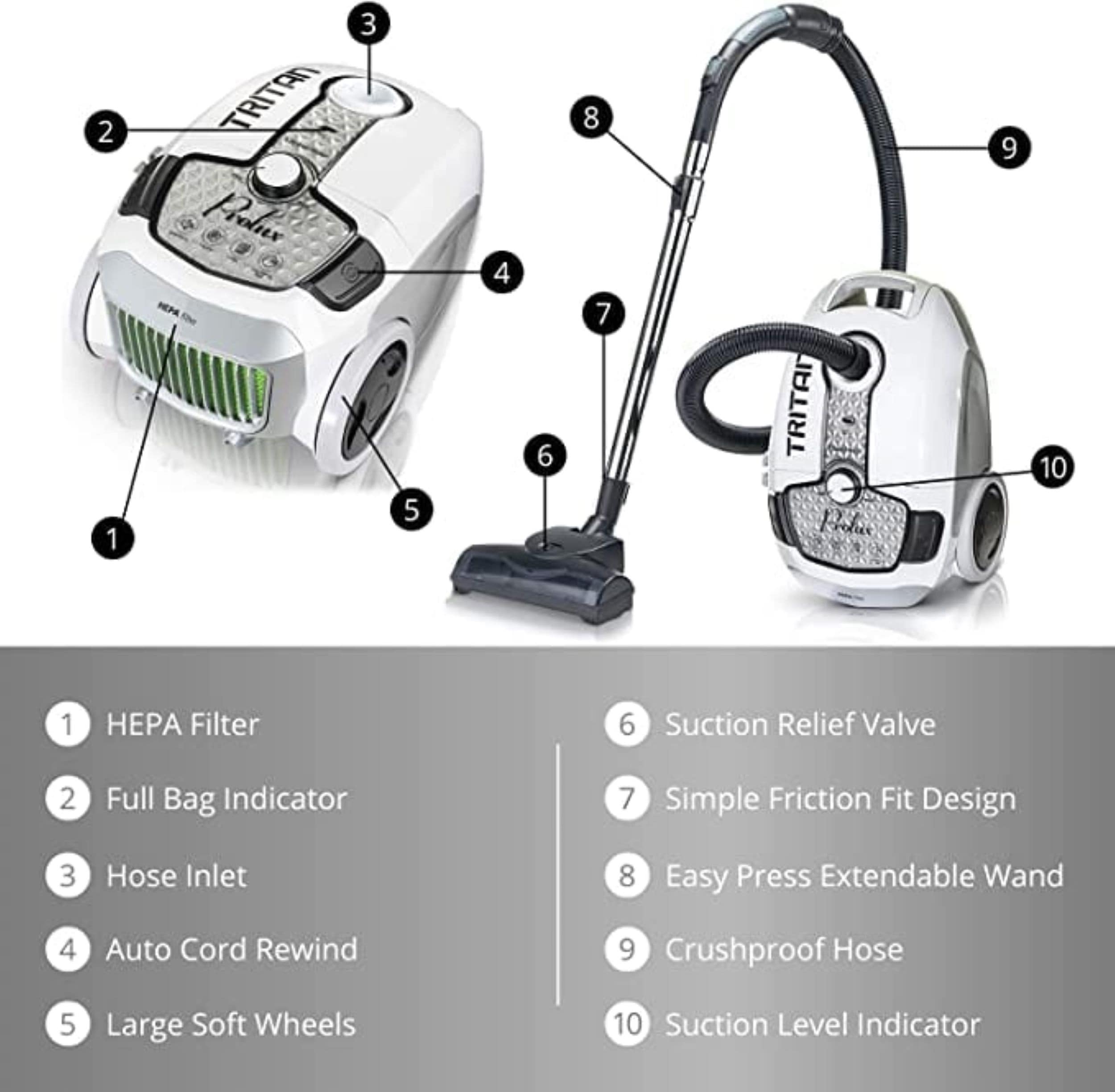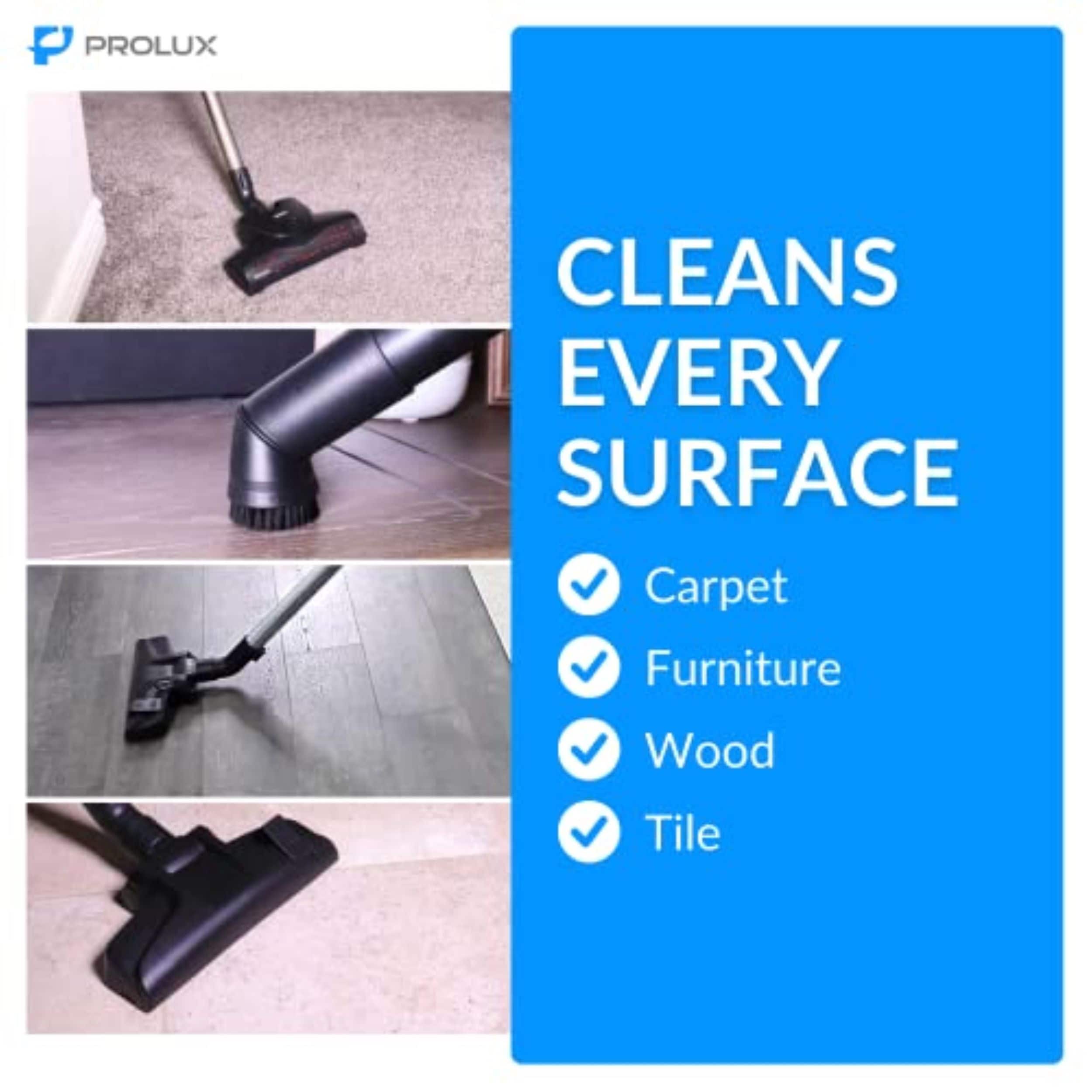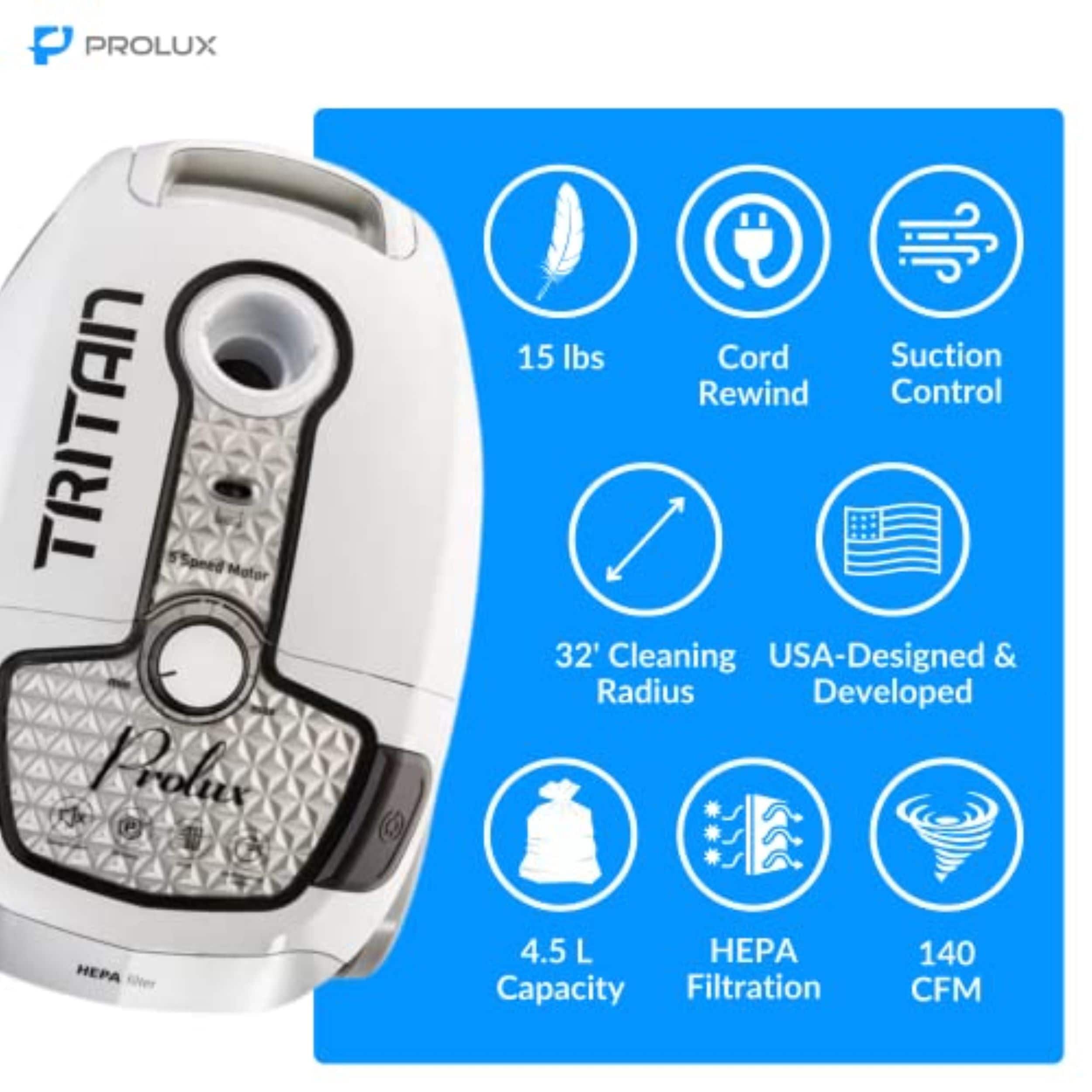 Are you looking for an easy-to-use inexpensive but dependable powerful deep cleaning vacuum? Then consider the Prolux Tritan. It has an amazing 140 CFM of power at the vac, Sealed HEPA filtration, On board tools, Adjustable Power Knob on vacuum allows user to adjust power from quiet delicate vacuuming (like dusting) to full power for deep cleaning, rubber wheels, long 23-foot retractable cord, adjustable steel wand dependable motor bypass and 1-year warranty. Whether you have allergies, pet hair, hardwood, tile, carpet, or rugs the Prolux Tritan can handle them all. Failure to use genuine Prolux filtration bags, filters & accessories with your Prolux appliance will immediately void your appliance warranty. The Prolux warranty does not apply to any non-Prolux branded products or Services (including repairs).