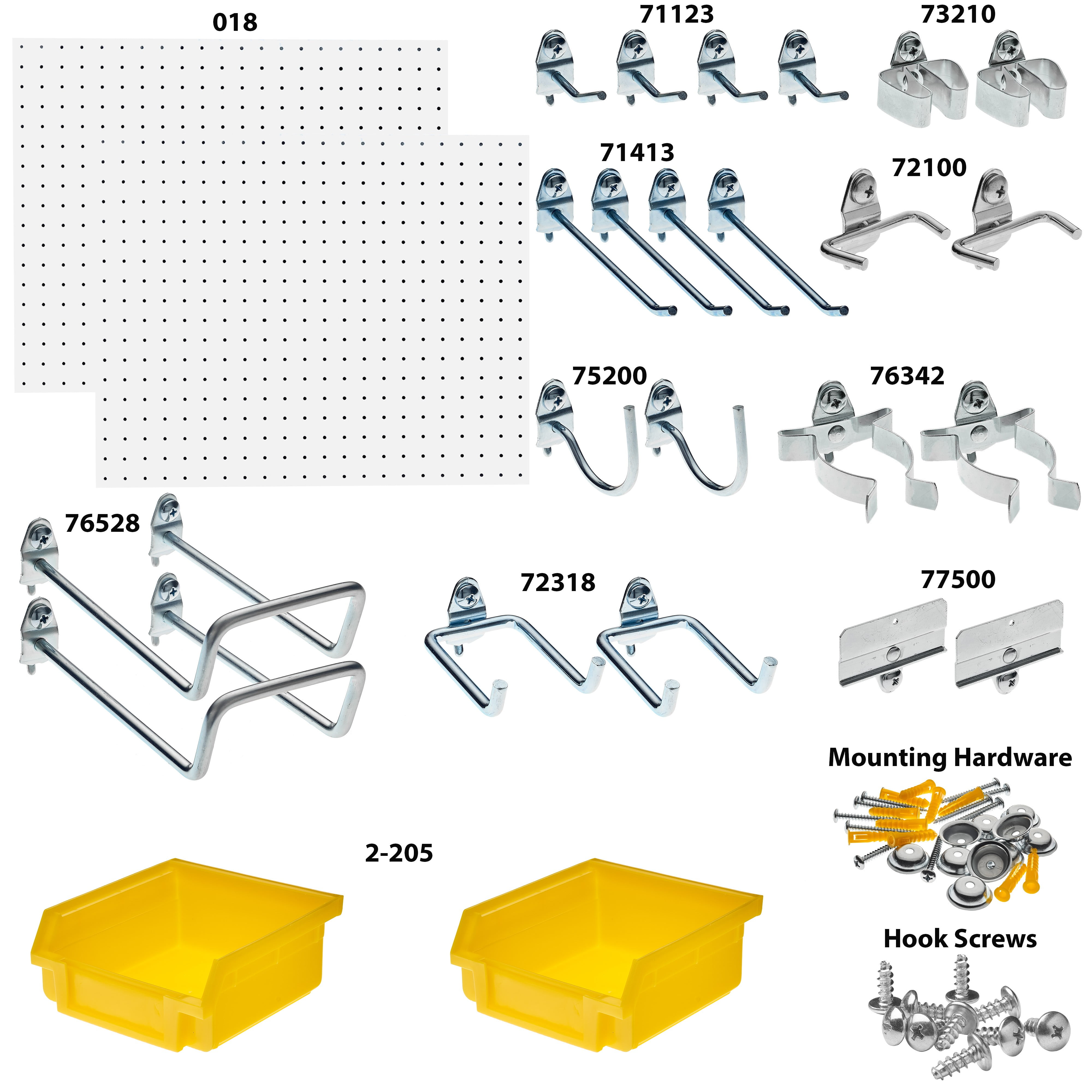 Triton Products 990 DuraHook Wall Organizer and Mounting Hardware Kit: The ultimate stay put wall organization system The first complete wall storage and organization system that offers DuraHook locking hooks plus DuraBoard A virtually indestructible, washable and translucent white poly pegboard Simple to install Easy to keep clean Kit includes two 18″ x 22″ x 1/8″polypropylene pegboard, two pliers/wrench holders, two 5″ double loop, four 1″ single rods, four 4″ single rods, two curved hooks, two 2-3/4″ double rod, 18 wall spacers, 2″ wood screws and plastic wall Anchors, 2 extended spring clips, 2 clip/can holder, 2 standard spring clip, 2 large standard spring clips and thirty-two 1/8″ lock screws Includes a bonus of 4 piece portable bin system, 2 hanging bins and 2 bin clips