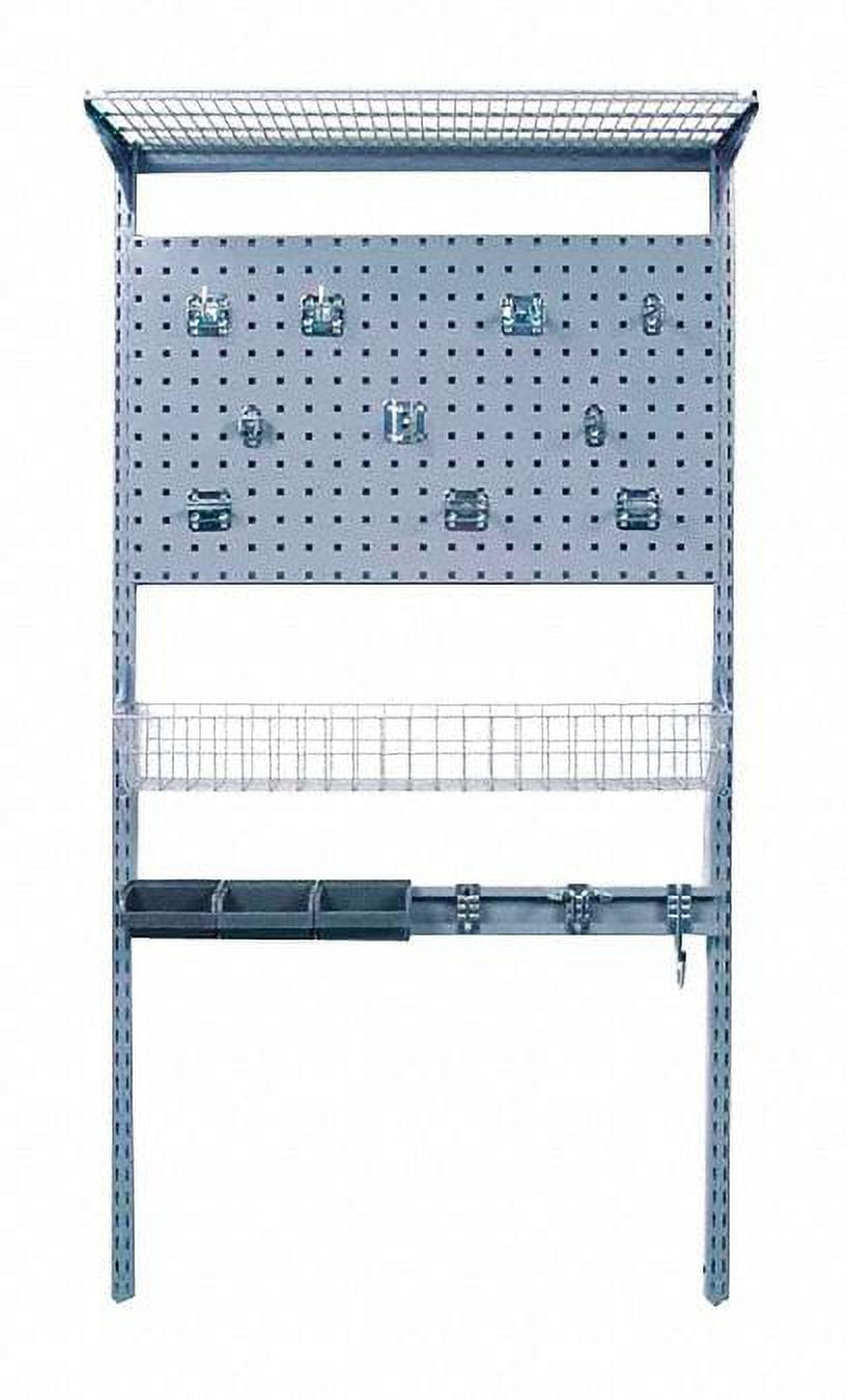 Changing placement of the accessories is fast and easy Includes all hardware required to mount the frame to the wall and the accessories to the frame System holds up to 375 lbs. across the top track frame unit Constructed of 16 gauge heavy-duty gray epoxy coated steel to ensure long life System includes: (1) 33 In. top track (2) 3 part vertical hang rails (1) 31 In. wide x 15 In. deep wire shelf (1) 31 In. combination rail with (3) hanging bins and (3) heavy-duty hooks (1) LocBoard steel pegboard with (11) commercial hook assortment (1) 31 In. wire basket All required hardware