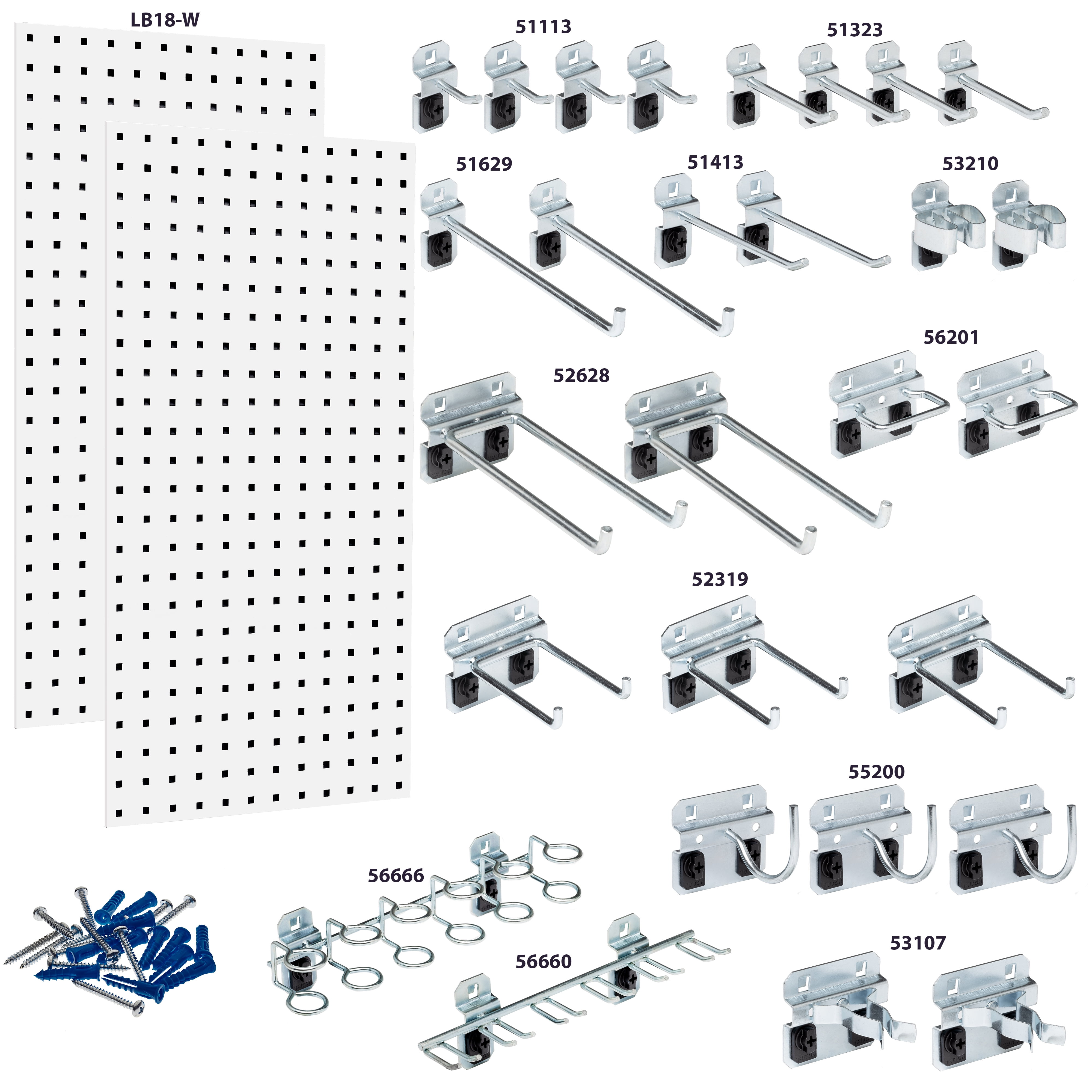 LocBoard wall system steel pegboard system is ideal for home, garage and workshop. The kit includes LocBoard epoxy coated steel square hole pegboards, a 28 piece LocHook assortment and mounting hardware for hollow, stud and concrete block walls. Securely store and organize your hand and power tools, garden tools, pet supplies, sporting items, outdoor equipment and more. LocBoard wall organizer is also ideal for office and craft room supplies. It includes the most secure pegboard hook locking system providing the most reliable pegboard system you can choose. The most demanding storage and organization challenges are easily met using LocBoard steel pegboards and steel “lock on” hooks. Contents include two 18-inch by 36-inch LocBoards, 28 hooks: one Multi-Prong Tool Holder(s), one multi-ring tool Holder(s), two four-inch Single Rod 30 Degree Bend(s), two six-inch single rod 90 degree Bend(s), two 5-3/4-inch Double Rod 80 Degree Bend(s), four one-inch Single Rod 30 Degree Bend(s) and more