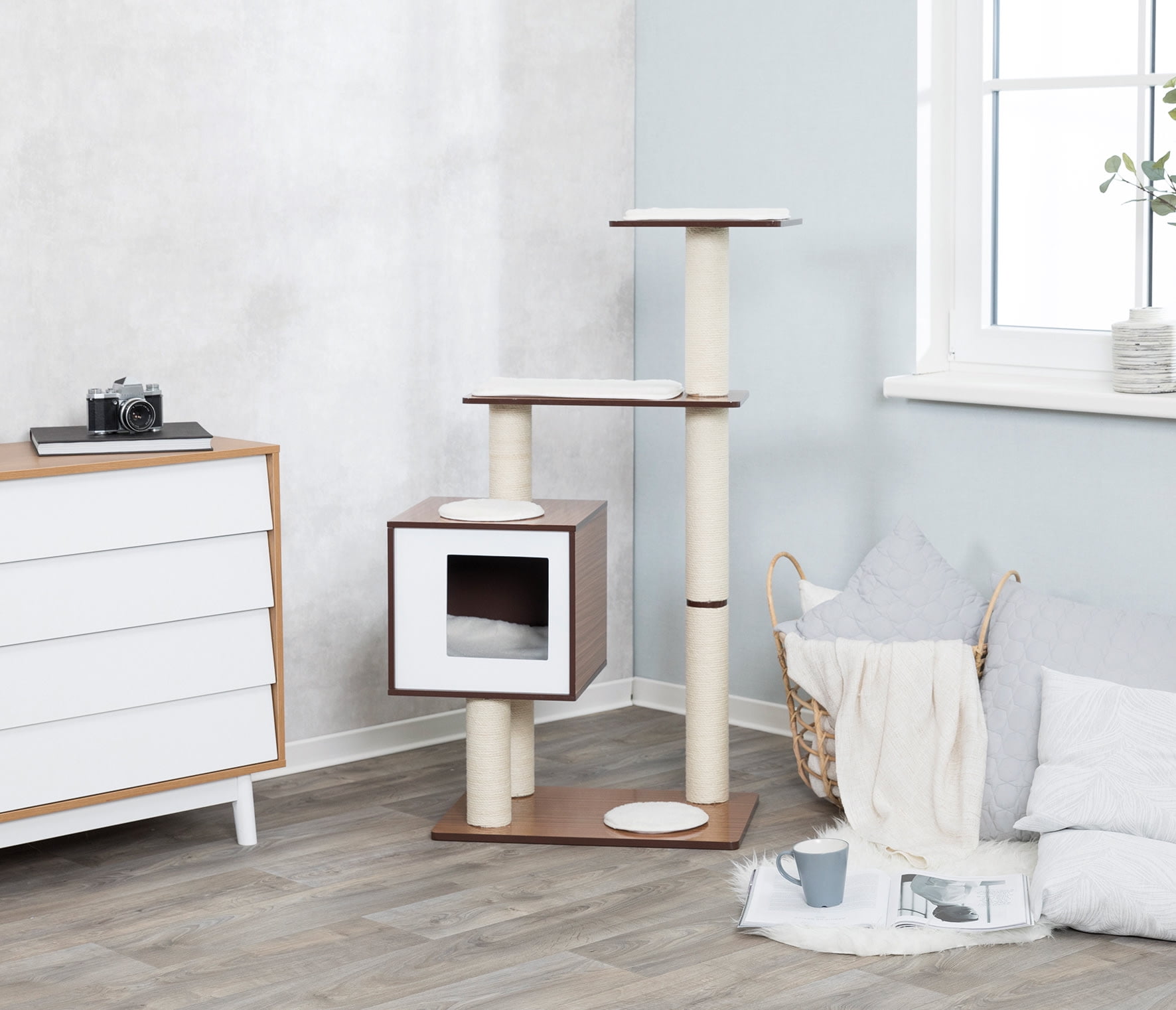 TRIXIE Avoca Wooden & Sisal 3-Level 48″ Cat Tree with Scratching Posts & Condo, Brown-White