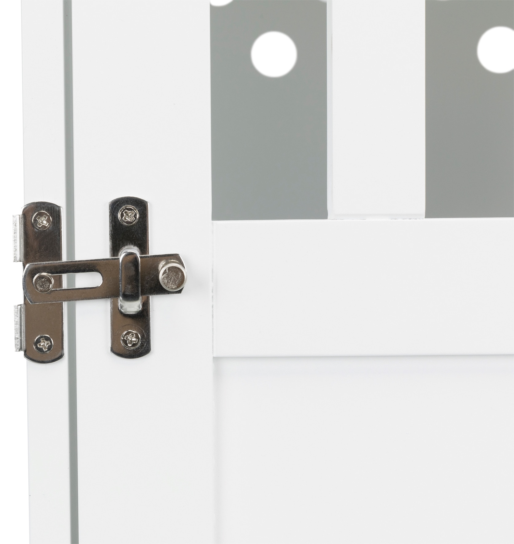 The elegant TRIXIE Dog Home End Table for small dogs combines function and style to add warmth and comfort to any room in the house. The kennel doubles as a side table, end table, or nightstand. It allows your pet to have their own hideaway in your living room or bedroom. The pet crate is crafted with strong wood providing durability and a home that is built to last. Designed with four solid panels to provide a sense of security with ventilation holes to allow good air flow. The wood is crafted elegantly and painted with a crisp white providing a modern feel to any room. The wooden dog crate is equipped with metal hardware for securely locking the kennel door while providing a classy look. The doghouse is equipped with a wide tabletop perfect for magazines, potted plants, lamps, coasters, and drinking cups & glasses.
