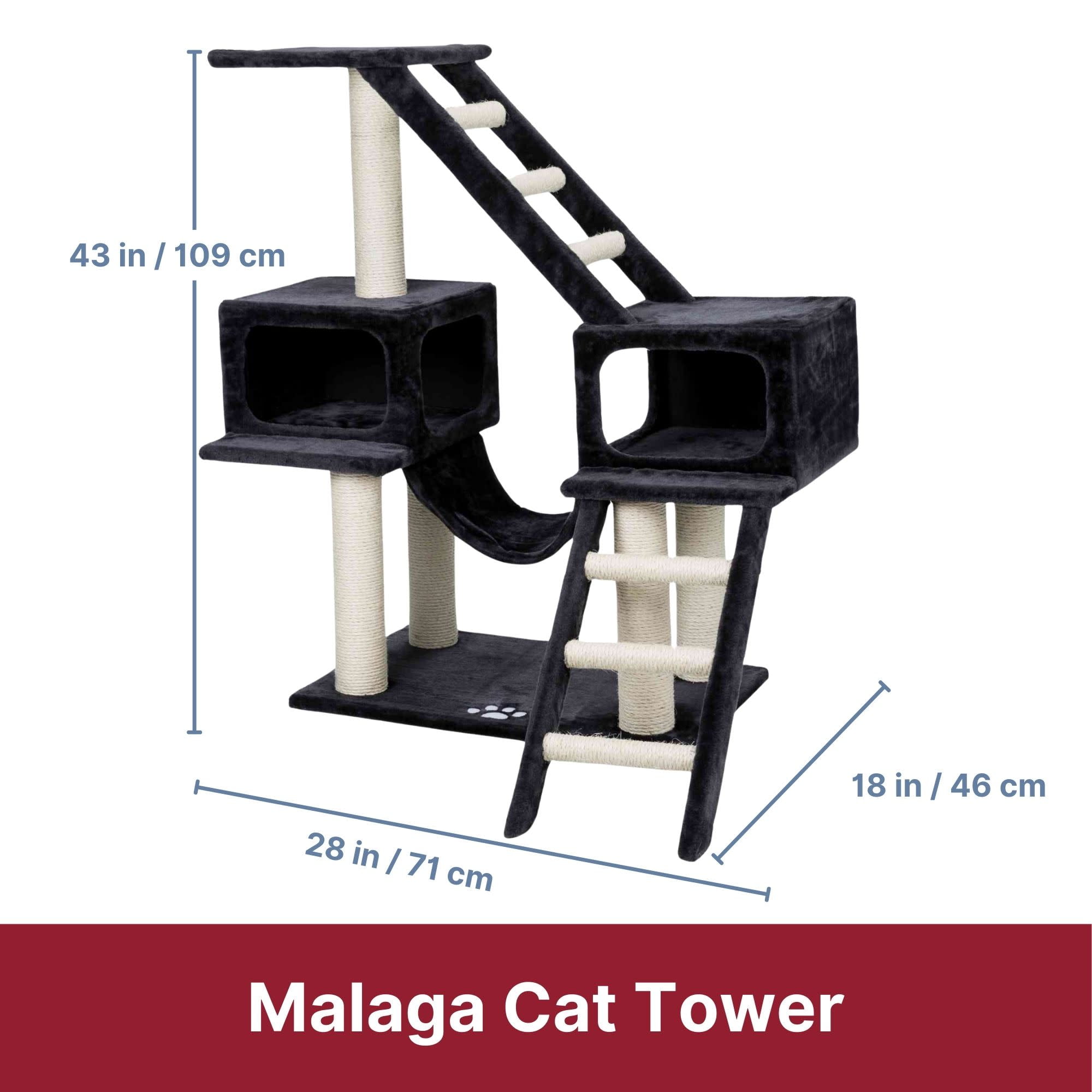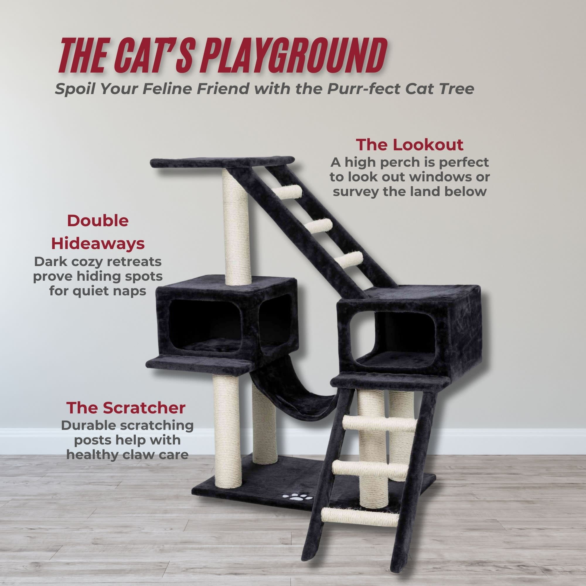 Sisal wrapped posts provides a healthy outlet for cats natural scratching instincts instead of using your furniture or carpet Elevated levels for climbing and jumping making it ideal for interactive play – encouraging exercise, stimulation and appeals to your cat’s natural instinct to hunt prey Cats love nothing more than to snuggle up after playtime in our plush covered condo which provides maximum comfort for your furry friend to peacefully relax, lounge, or nap The soft, plush fabric makes naptime comfy, plus it’s great for face rubbing and nuzzling The 2 condos are connected with a hammock for your spunky cat can plan out their next ambush or catch a quick nap Scratching post are made from sisal rope, durable and safe for your pet to use Ideal for playing, scratching, climbing, and exercising Product Details: 5 Scractching Post, 2 Condos, 1 Hammock, 1 Top Perch, 2 Ladders