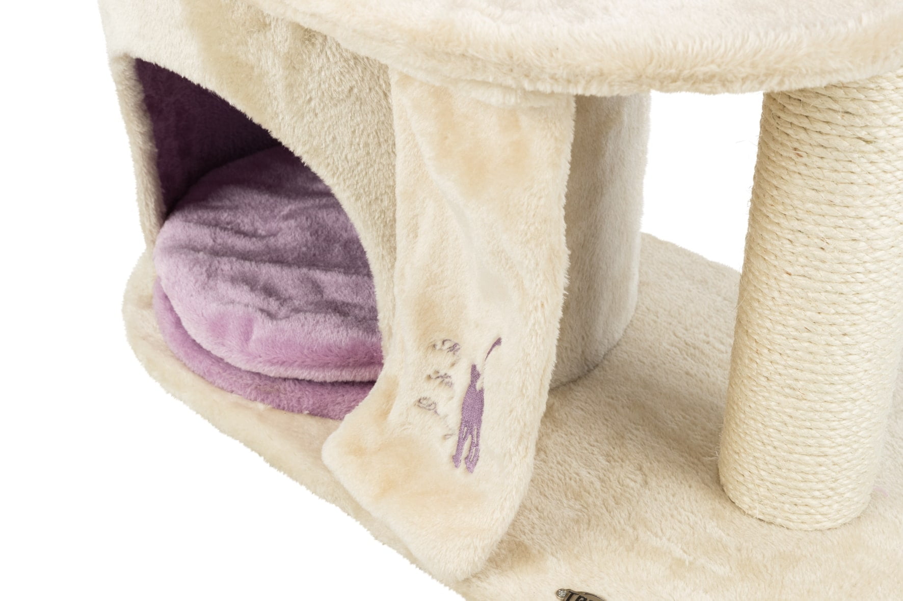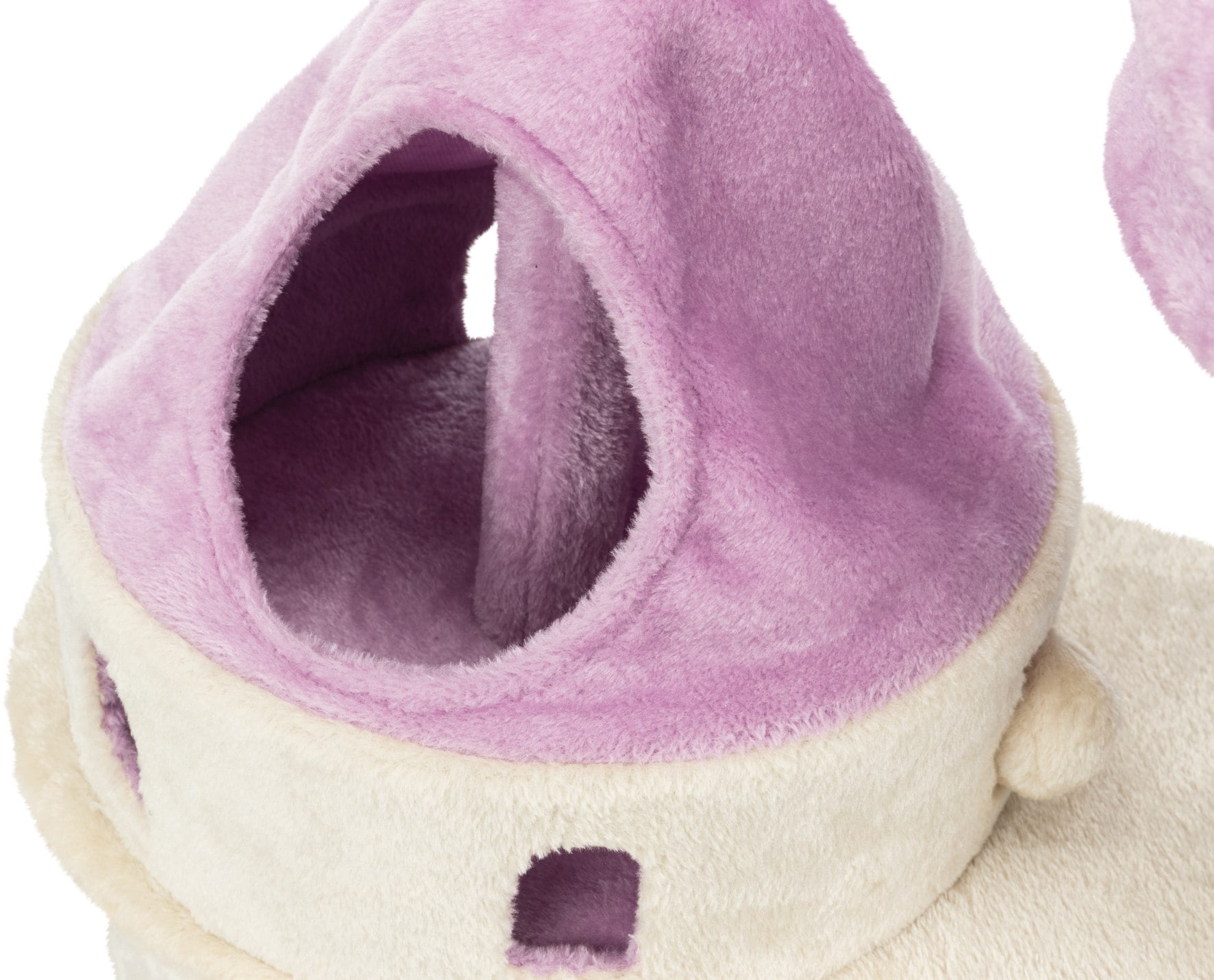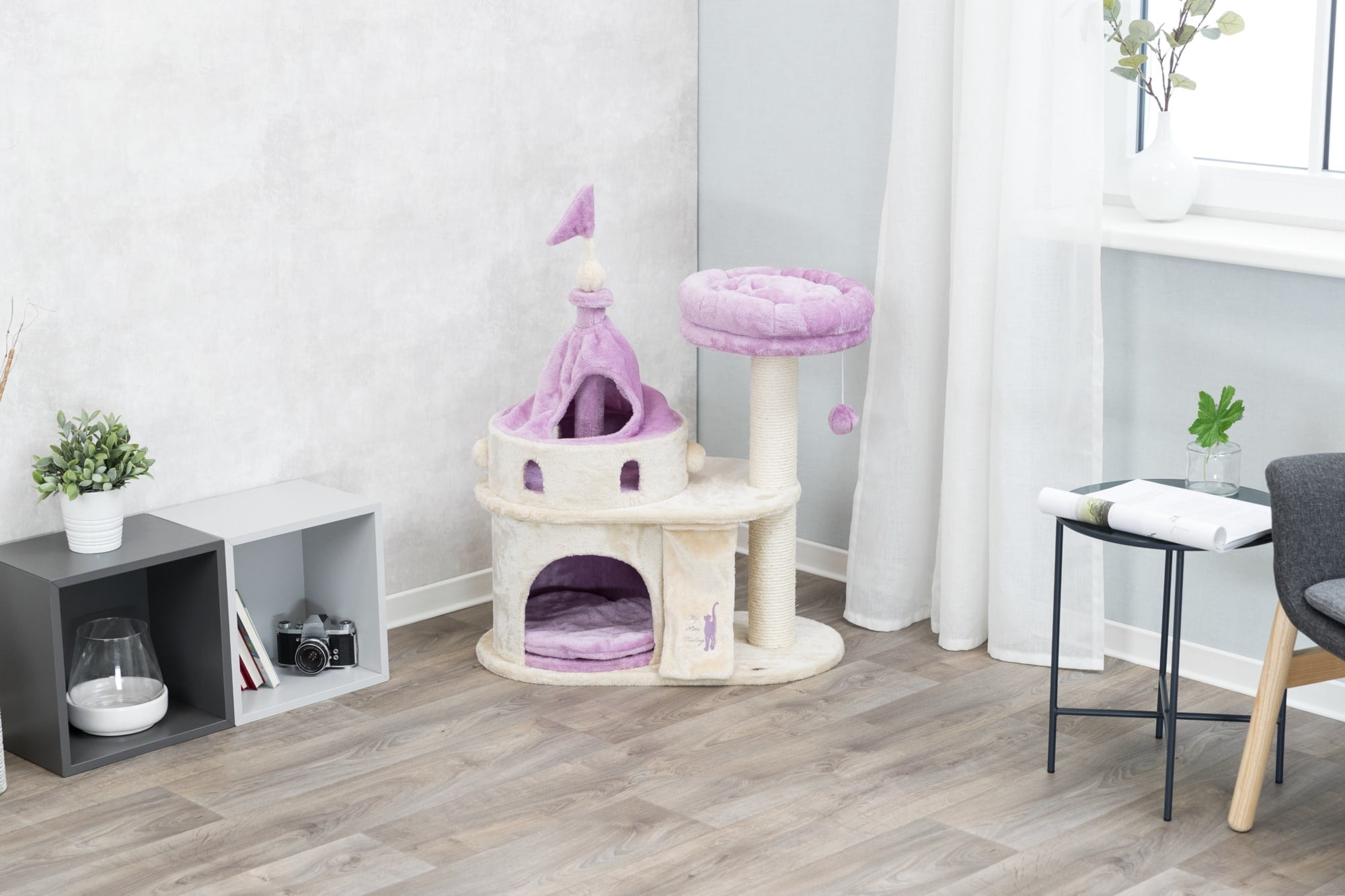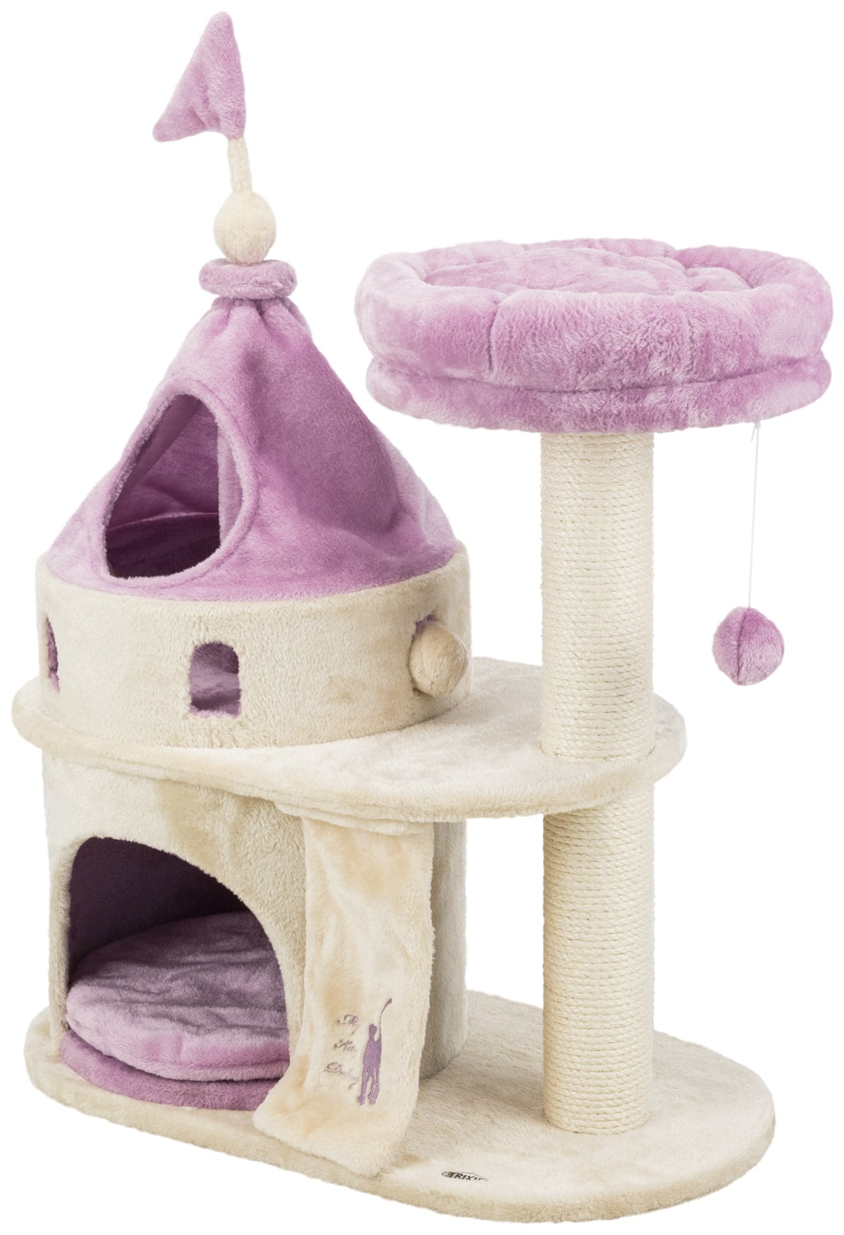 The TRIXIE My Kitty Darling Castle will provide endless opportunities for kittens and small breed cats to play, explore, scratch, or just relax. Cats can sharpen their claws on the durable, sisal scratching post instead of on your furniture or carpet. If a nap or place to hide is in order, your little princess can crawl inside the condo base or tower which are plush covered inside and out. The top platform even has a removable ring-shaped bed that can be used separately. The bed includes a reversible cushion for added comfort; and is machine washable. Feeling spunky? Jump, climb or perch atop the platform and peek inside the plush castle tower. For extra fun, your kitty can enjoy the included removable play cloth with foil inlay.