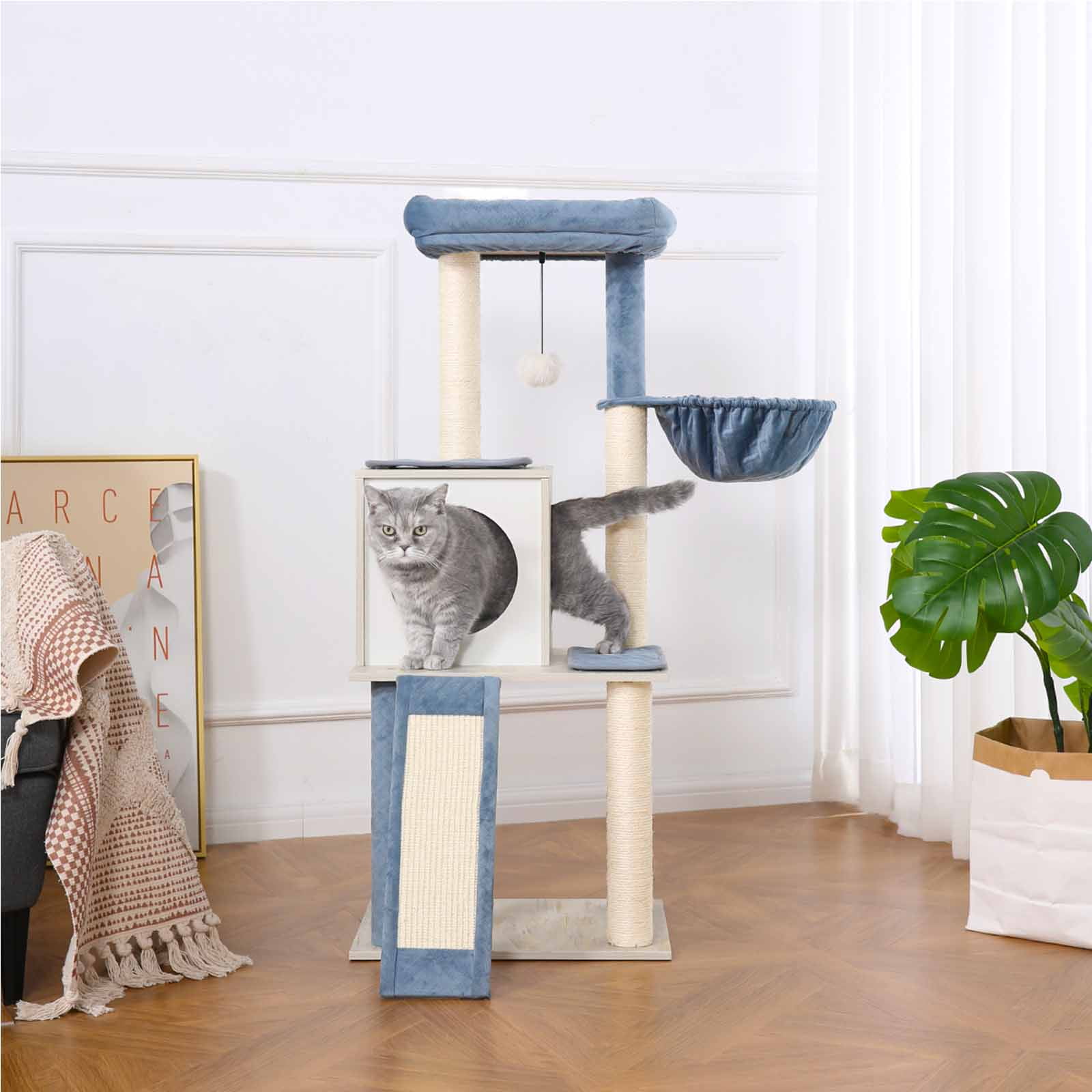 Cats love sleeping and napping, a lot! Our platforms, condo, hammock, and cuddly bed are covered in soft plush for a perfect retreat for napping or needing a place to hideout Cats love and need to scratch! There is plenty of vertical scratching surface covered in sisal perfect for satisfying a cat’s instinct to scratch and stretch while protecting your furniture Cats love jumping and climbing to high places for watching and hiding! Surveying their territory or escaping threats from below, atop the 39.4” TRIXIE Pepito Cat Tree is a great alternative to your kitchen counters Cats love a stimulating environment! We have provided a dangling pom-pom to satisfy their natural curiosity and provide challenges and entertainment Product overall dimensions: 18.9″ L x 18.9″ W x 39.4” H