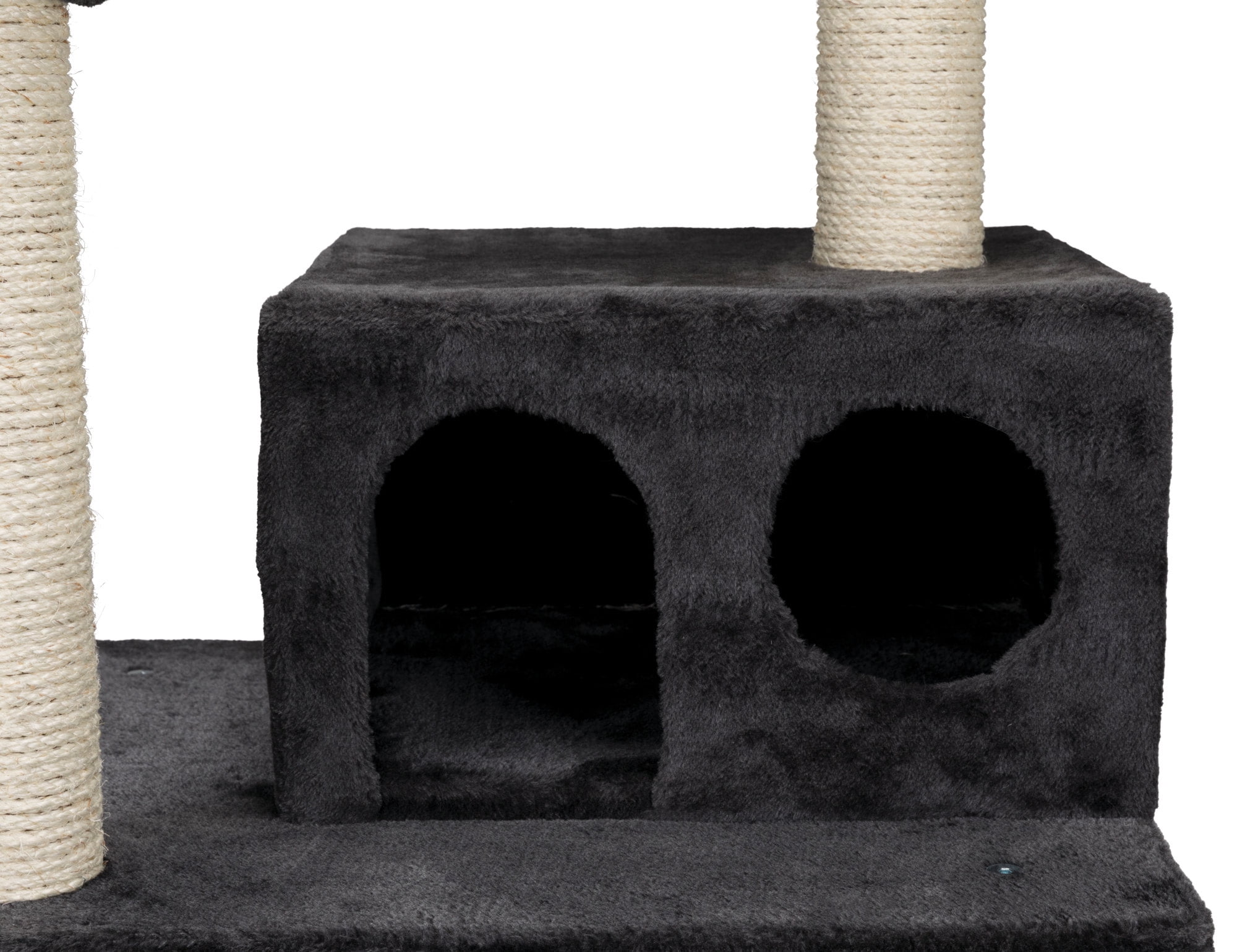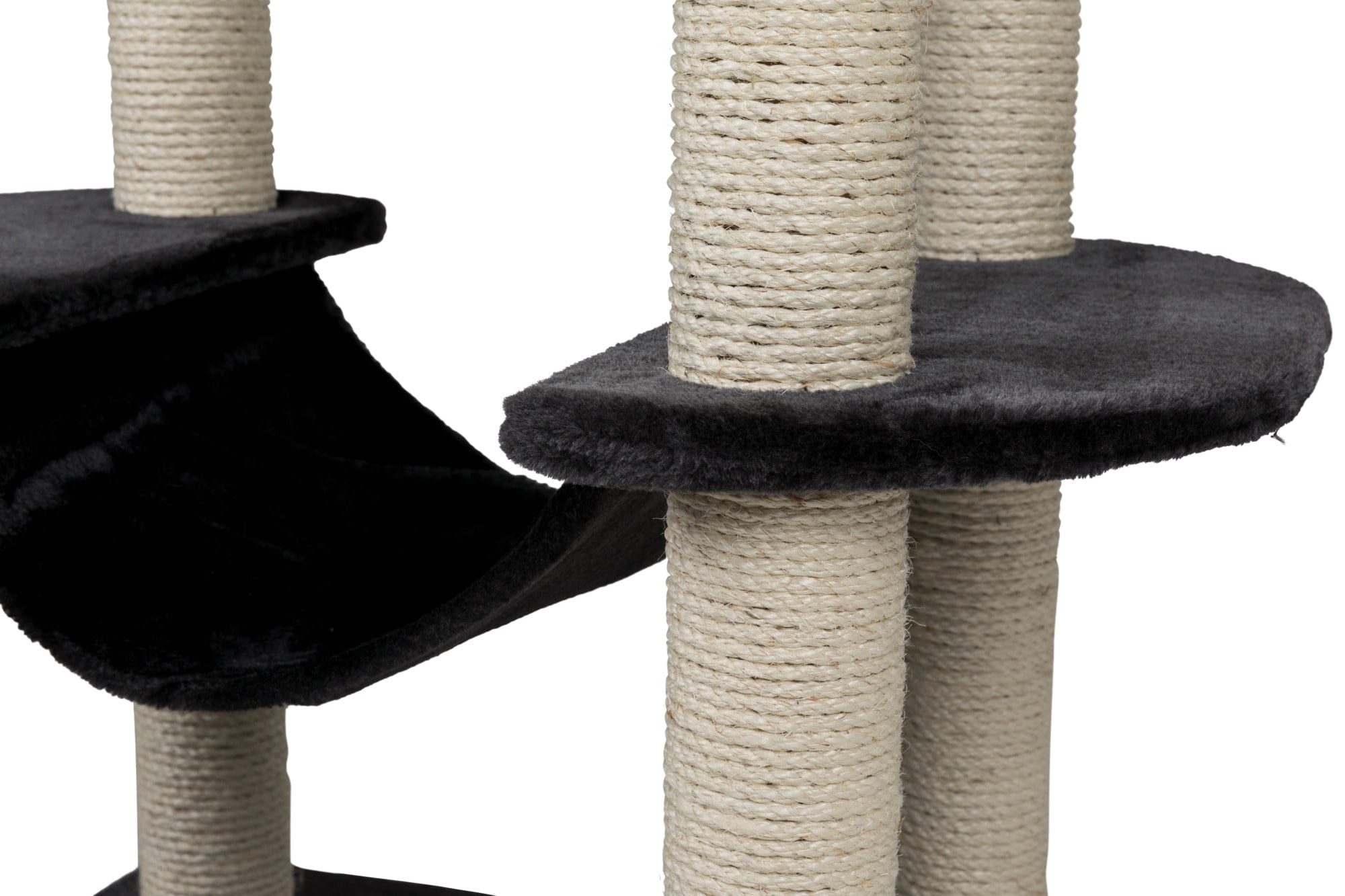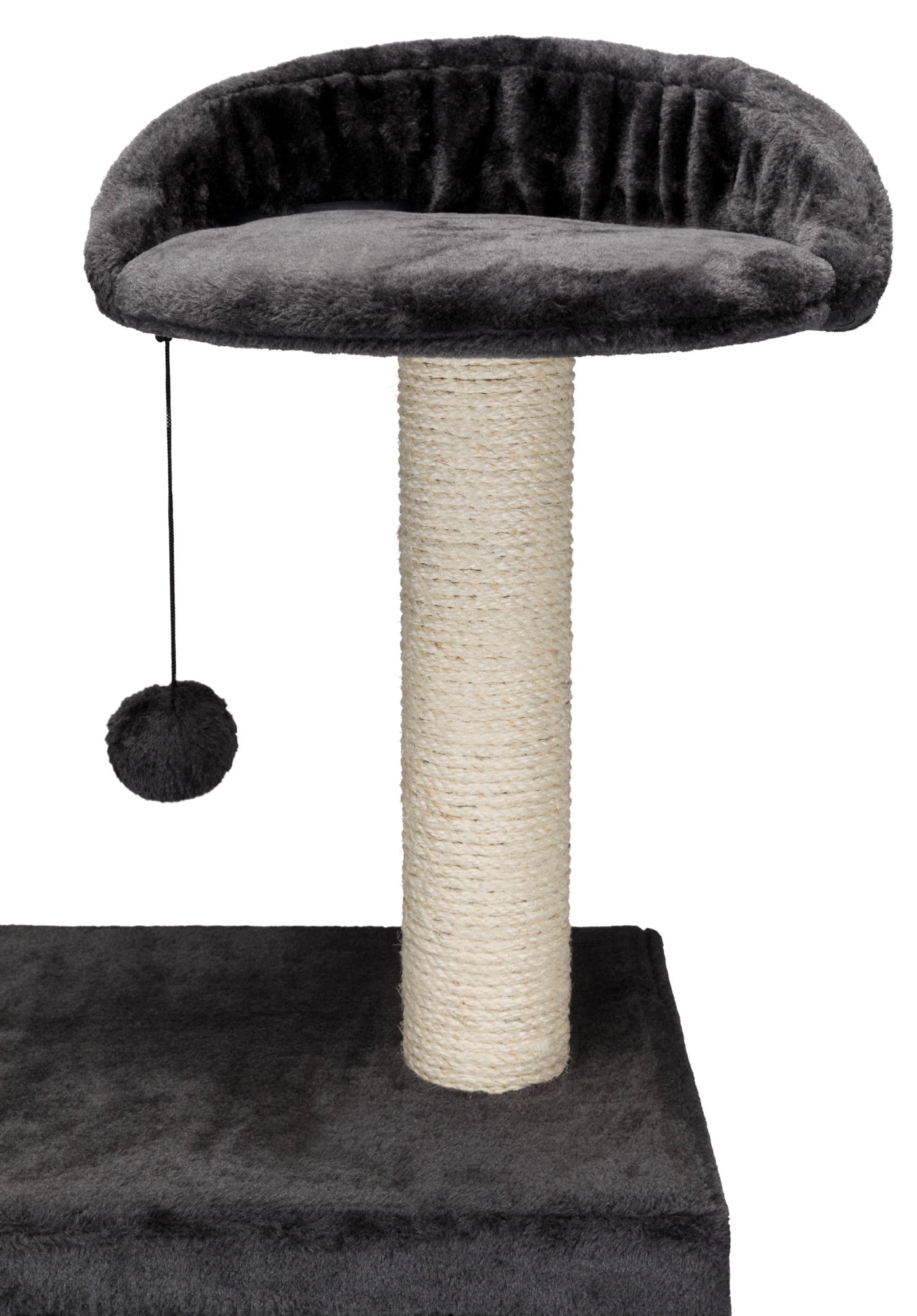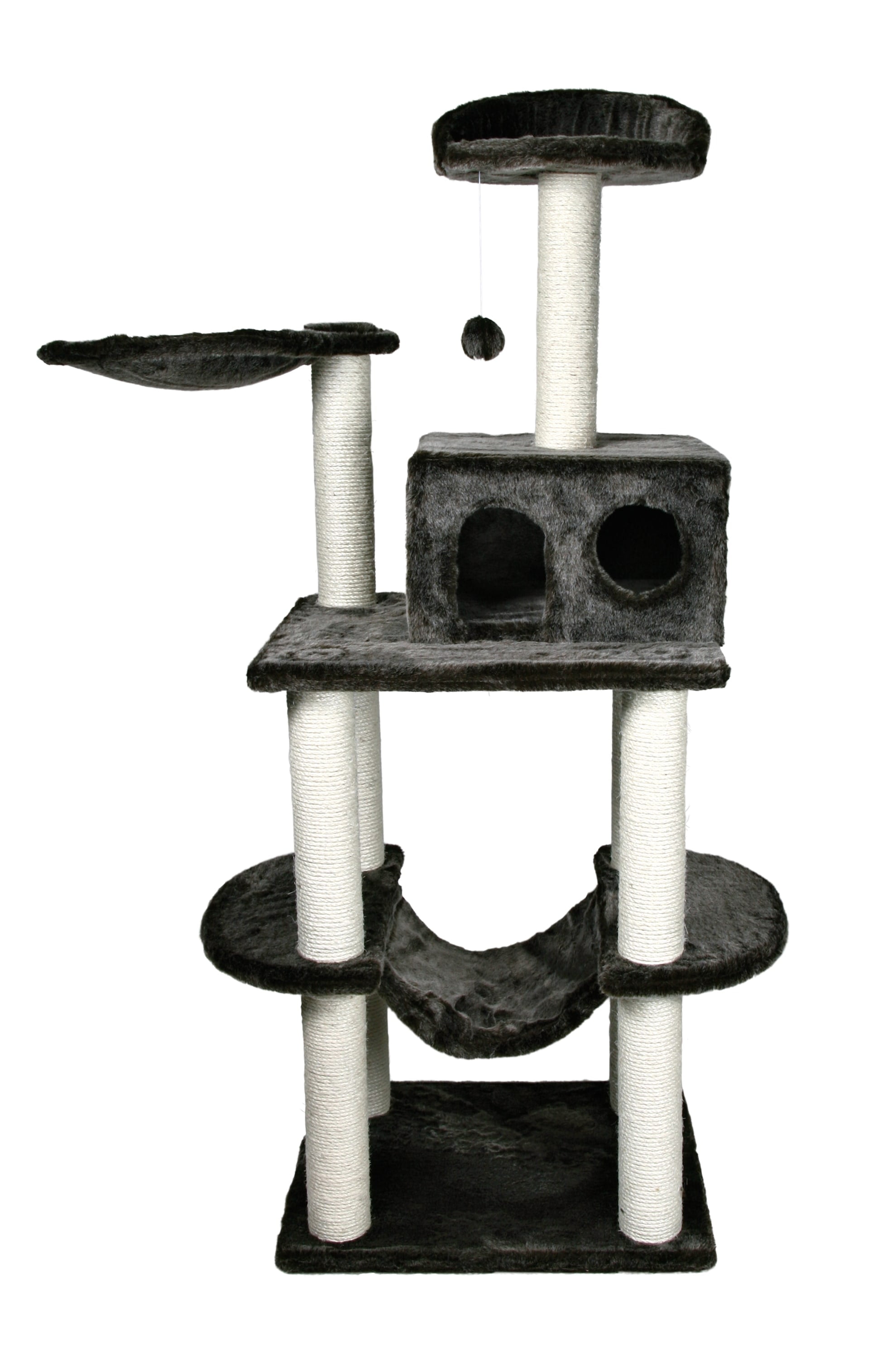 covered with plush posts wrapped in natural sisal padded top platform with backrest condo and hammock lined with plush toy on string color: dark gray
