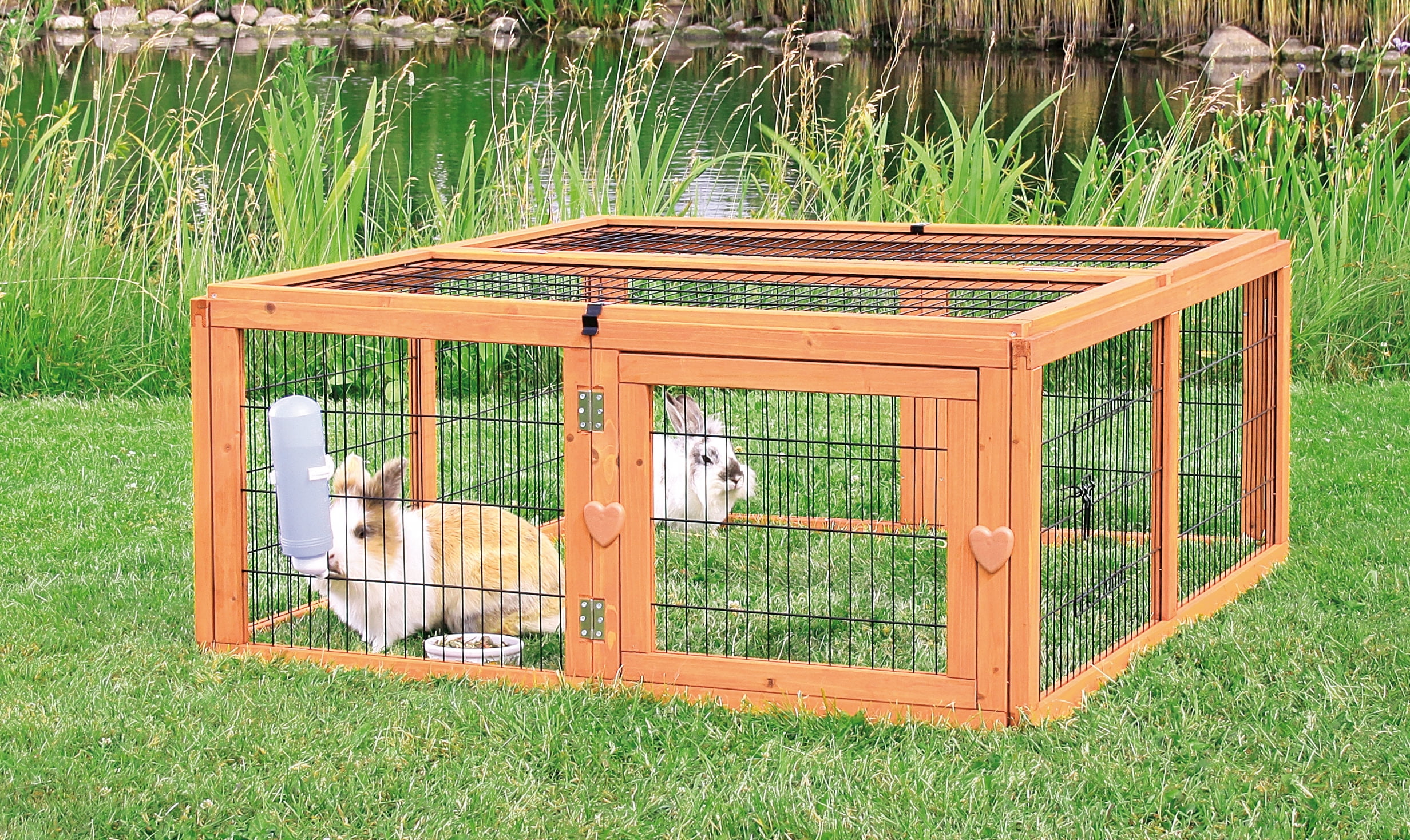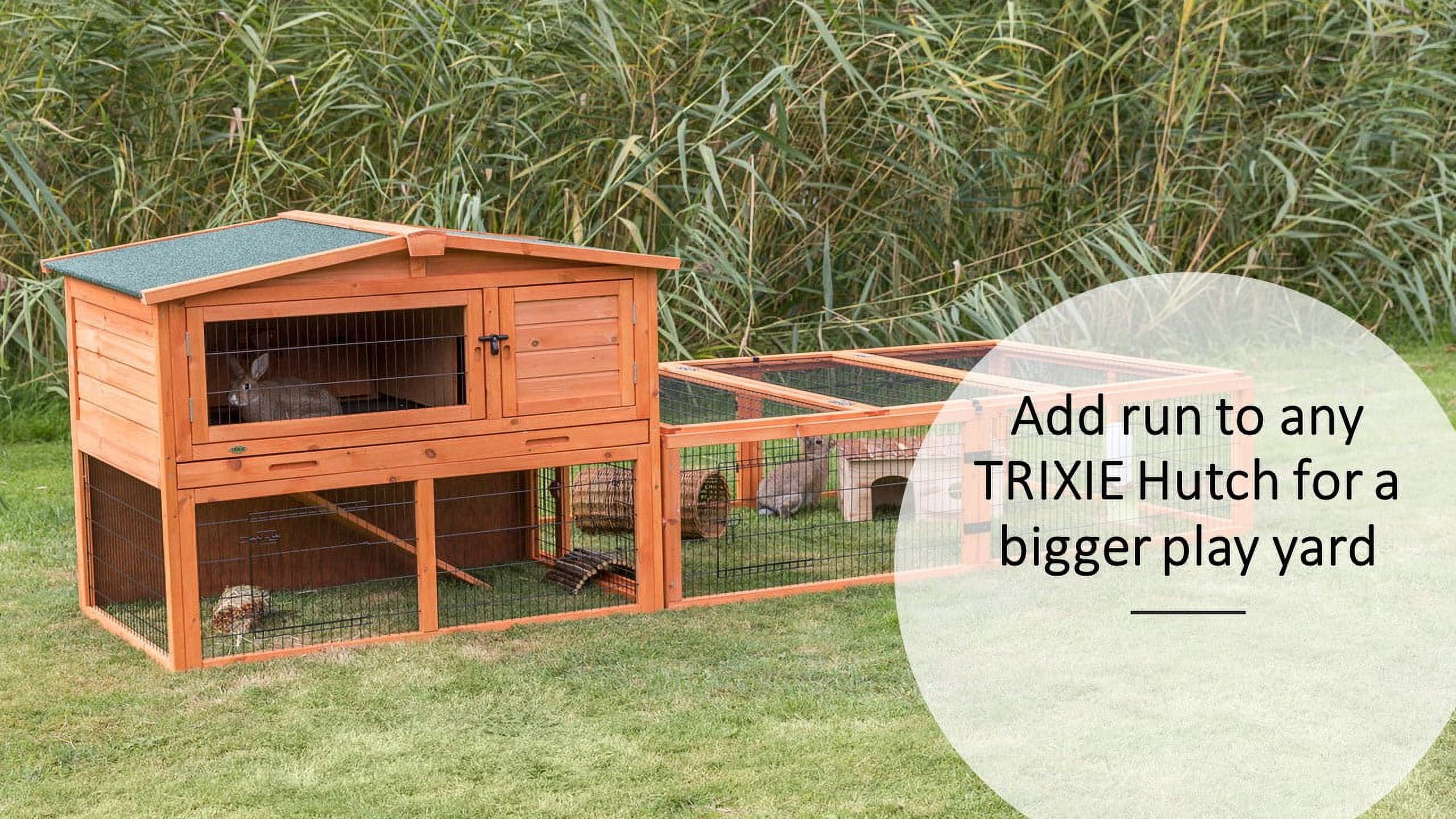 TRIXIE’s Enclosed Outdoor Run is perfect for giving your little furry friends freedom and security to play. While they play and exercise, you will have the best of both worlds, knowing they are safe yet have plenty of space to play. This comfortable wooden hutch features all-weather-resistant material and construction. The top can be opened and closed to easily access the inside area for cleaning, feeding, and other routine tasks. The durable powder-coated metal wires and solid wood construction will give you the peace of mind your babies are secure. The glazed wood finish means this run will endure years of use with little maintenance. The enclosure keeps your pet safe, while the top cover protects your pet from unwanted visitors. It also prevents your pet from jumping out. The top folds open on both sides and can be fastened to the enclosure with clips. A removable door allows the run to be added to a hutch and a small door for easy access to your pet. Suitable for small animals such as Rabbits or Guinea Pigs. Quick and easy to install and remove. The water bottle, bowl, or accessories in pictures are not included.