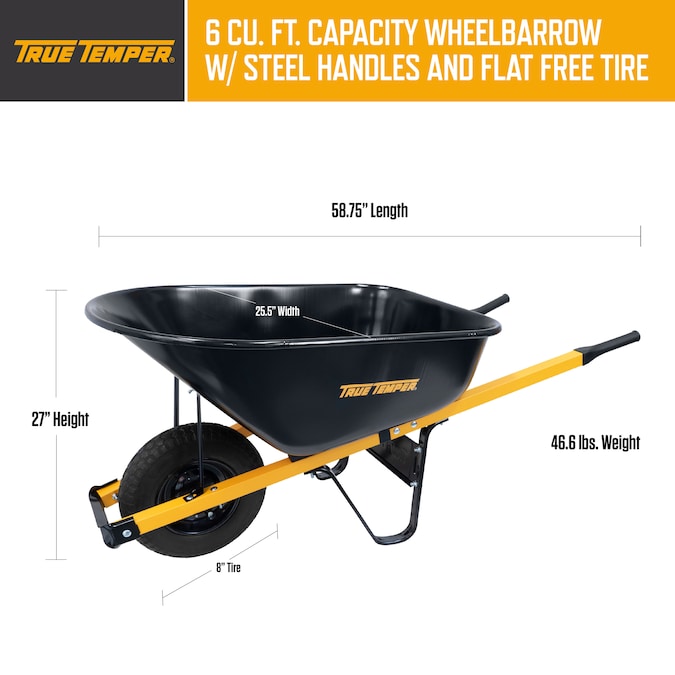 With 6 cubic feet of hauling capacity, the True Temper® 6 Cu. Ft Steel Tray Wheelbarrow is ideal for homeowners, landscapers, and light construction work. The 6 cubic foot seamless steel tray is plenty tough and will provide years of service for just about any job. The solid, never-flat tire never requires air, so your wheelbarrow is always ready to work. Around the house or on the job, this is the right wheelbarrow for the job. This unique wheelbarrow is designed for convenience to ship in one durable box, with quick and easy assembly.