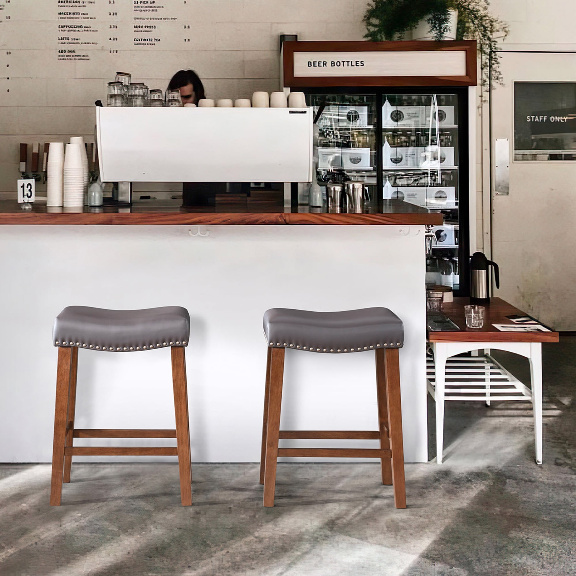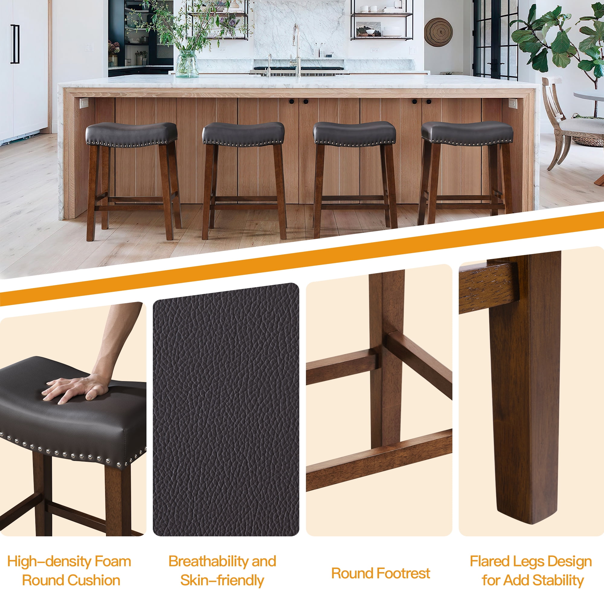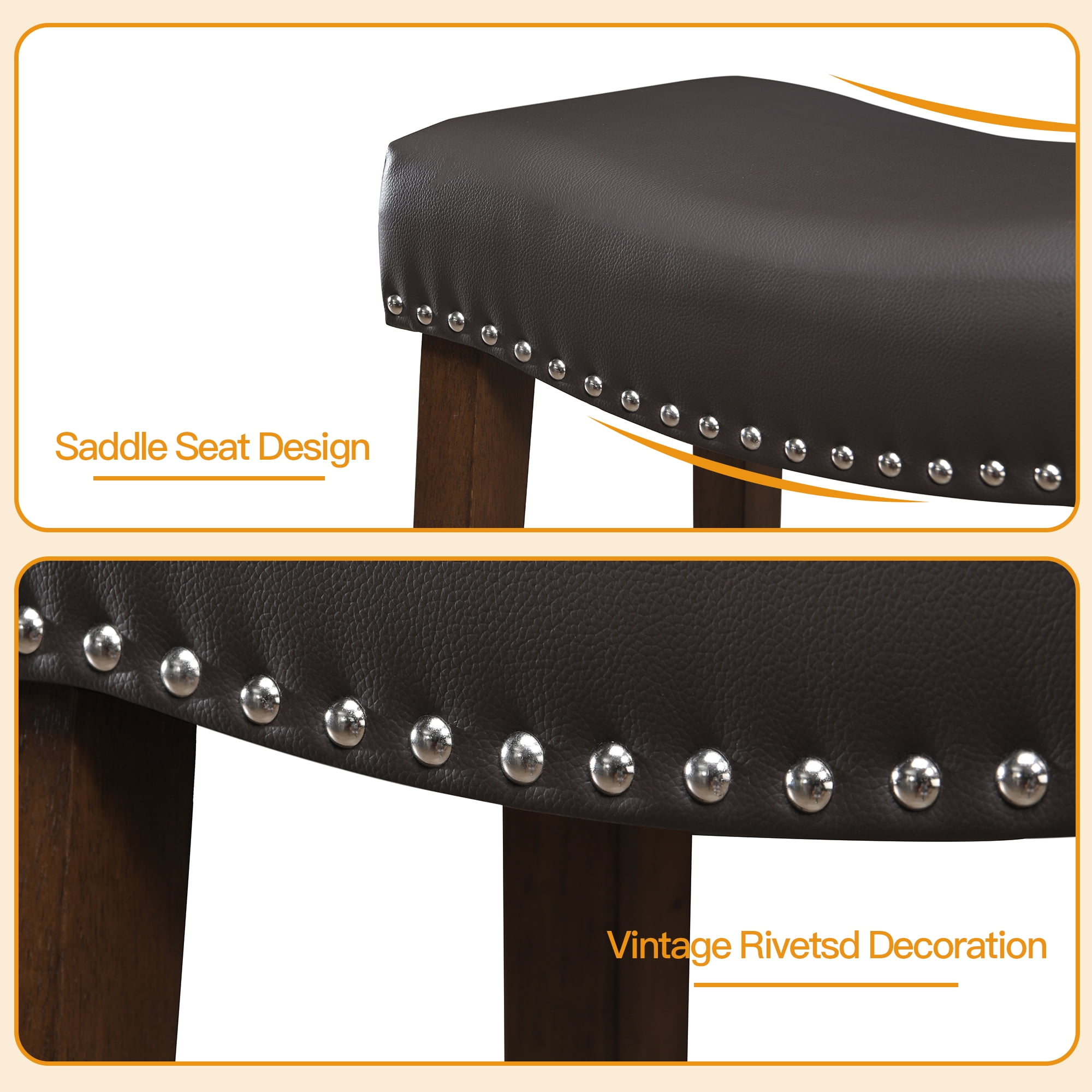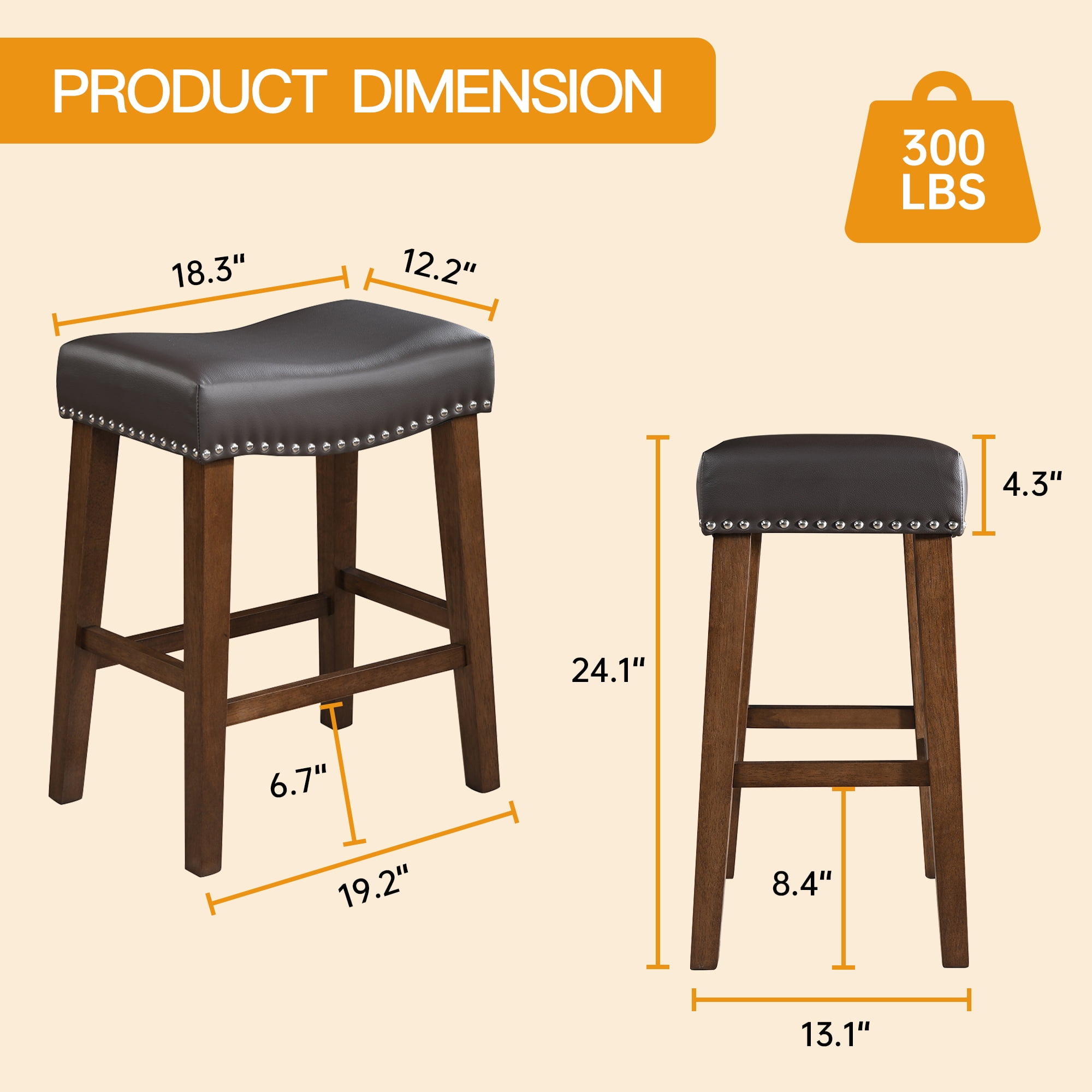 ERGONOMIC SADDLE STOOL – Enhance your seating experience with our ergonomically designed saddle seat bar stools. Crafted to fit the contours of your hips, these counter stools provide exceptional comfort even during extended sitting. The 4.5-inch high-density, high-resilience sponge cushion ensures fatigue-free seating, while the breathable, wear-resistant linen fabric adds a touch of luxury and is easy to maintain. DURABEL CONSTRUCTION – Built to last, the set of 2 bar stools feature sturdy solid natural rubber wood legs that support up to 300 lbs. Equipped with four footrests for added comfort and stability, these kitchen bar stools ensure a delightful seating experience. The non-slip footpads also protect your floors from scratches. COUNTER-HEIGHT – The backless bar stools measure 19″D x 13″W x 24″H, making them a perfect match for 28″-34″ counters, kitchen islands, dining tables, or bar tables. Their backless design allows them to be easily stored under the table when not in use, saving you space. VERSATILE & MULTI – PURPOSE – Perfect for various settings, such as height counters, kitchen islands, tables, or bar tables, these counter-height stools chair feature a backless design that allows them to be stored under the table when not in use, saving space. Available in a variety of colors to complement different furniture styles, you can choose the perfect one to match your home decor. EASY ASSEMBLY – Assembly is a breeze with all necessary hardware and an installation manual included. You can easily assemble the barstools in just 20 minutes. If you encounter any issues, don’t hesitate to contact us for assistance. Product Description: Seat Top: 18.3 inches Fabric Thick: 4.3 inches Bar Stool Dimensions: 19″D x 13″W x 24″H Product Style: Saddle Bar stools for kitchen island chair Number of Pieces: set of 2 bar stool Frame Material: Solid Wood Seat Material: Upholstered Upholstered: Fabric/PU leather Back Style: Backless Stools Upholstery Fill Material: Foam Nailhead Trim: Yes Leg Type: Four Leg Swivel: No Foldable: No Footrest Included: Yes Weight Capacity: 300 lb. Durability: Water Resistant; Rust Resistant Product Care: Wipe down with mild soap and water