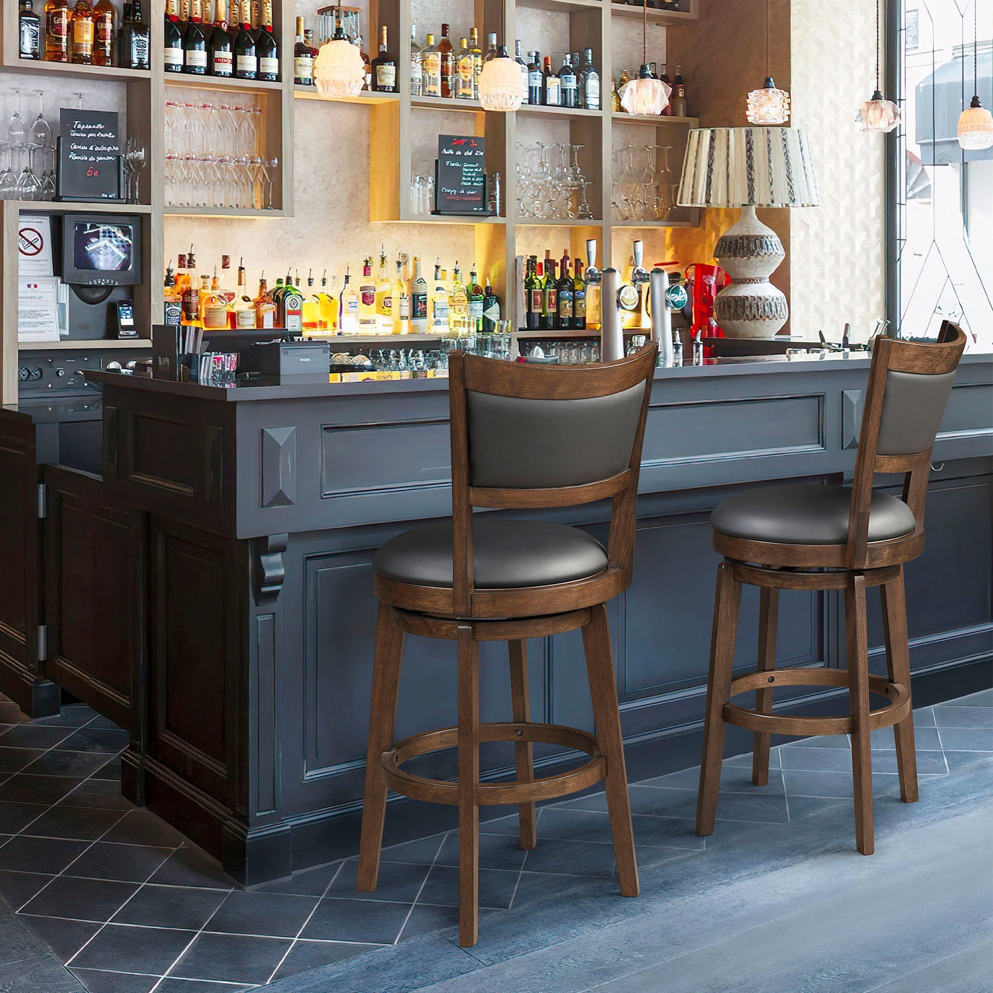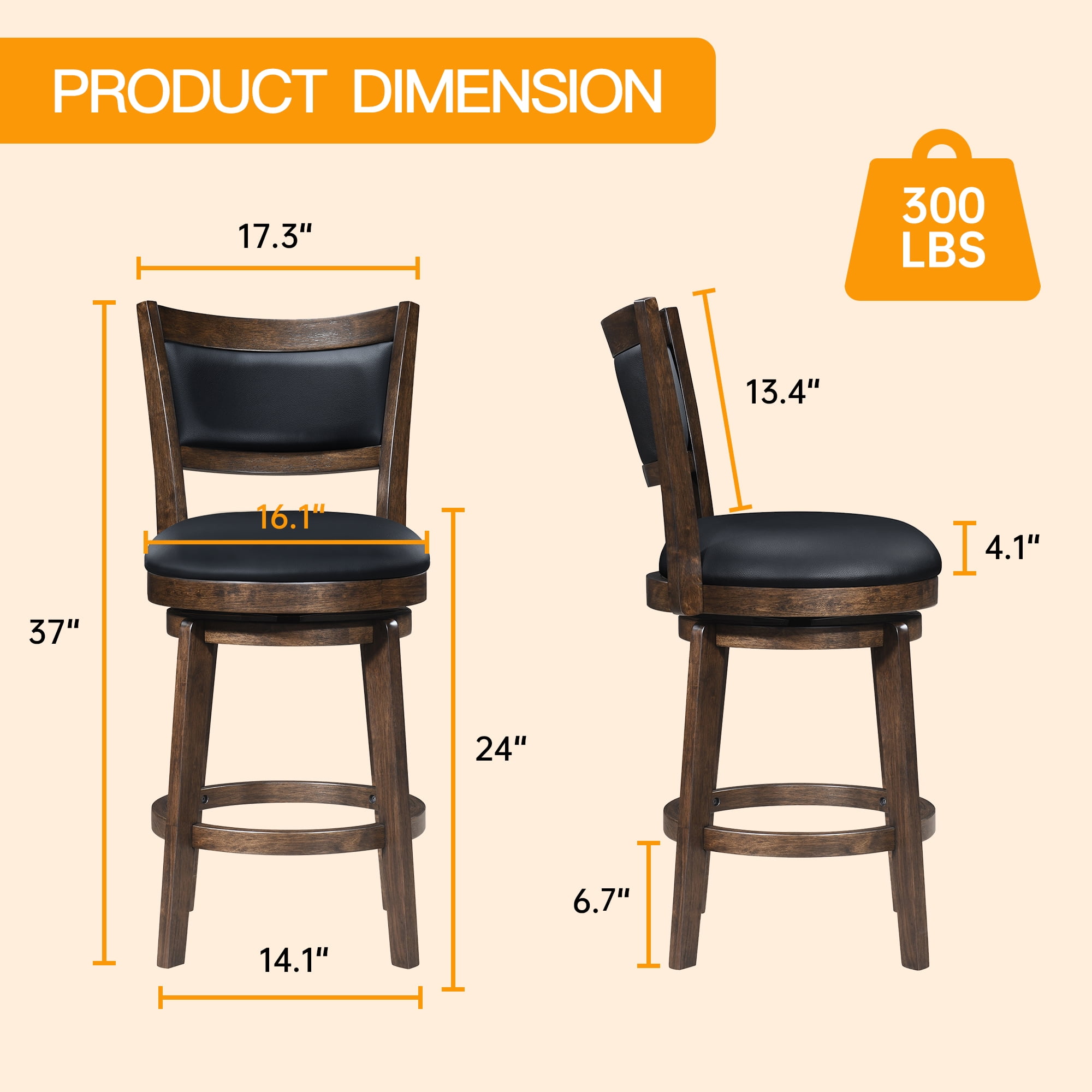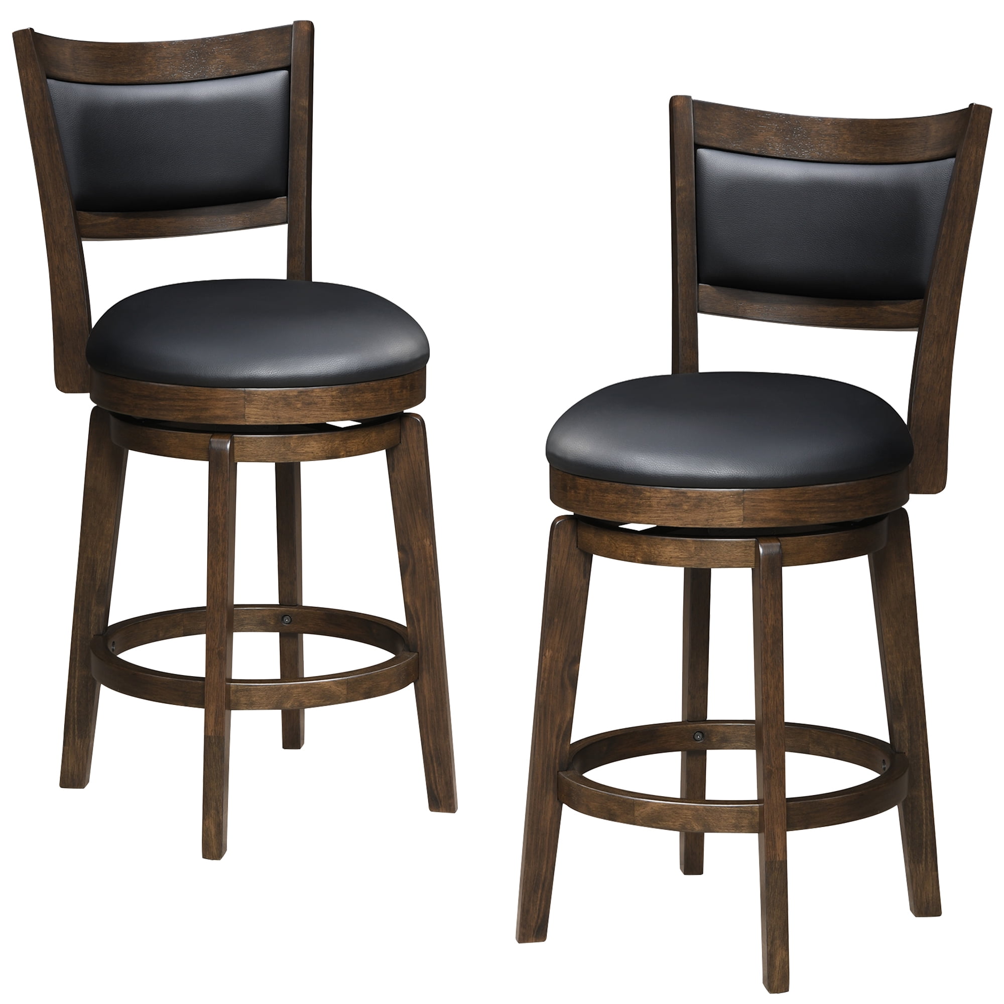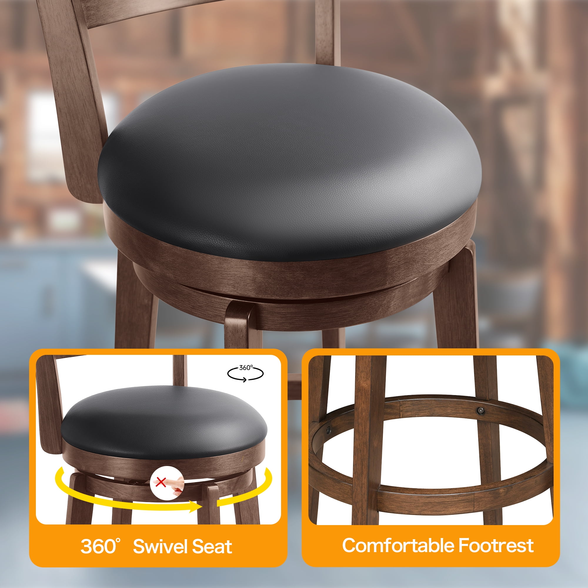 【360-DEGREE SWIVEL】- Experience enhanced mobility with the 360-degree swivel feature, effortlessly allowing you to turn and engage in conversations without needing to leave your seat. Paired with the built-in footrest, this feature ensures that your seating experience is not only comfortable but also incredibly convenient, perfect for kitchen island enjoying moments with friends and family. 【COMFORT UPHOLSTERED】- Indulge your senses as you glide your hand over the sleek cover, then sink into the luxurious support of the 4.1″ thick, 58D molded foam. These black tall bar stools offer a seating experience that’s not just comfortable but enduring, promising to stand the test of time with unwavering quality. 【STABILITY AND DURABLE】- Crafted with a robust rubber wood frame and legs, these kitchen stools offer unparalleled stability and durability, capable of supporting up to 300 lbs with ease. The slightly splayed legs and wrap-around footrests not only enhance stability but also ensure that you can comfortably relax your feet while seated, adding an extra layer of comfort to your lounging experience. 【WIDLY APPLICATION】- These versatile farmhouse barstools are crafted to make a statement across a range of spaces. Whether you’re looking to infuse rustic charm into your kitchen, create a cozy corner in your bistro, or add character to your restaurant’s ambiance, these stools are the perfect choice . 【EASY ASSEMBLY】- With your purchase, you’ll receive comprehensive installation instructions, along with all the necessary hardware, ensuring effortless assembly in just 15 minutes. Rest assured, if you encounter any issues with this item, our dedicated support team is readily available to assist you. Product Description: Product Dimensions: 17.3″D x 16.1″W x 37″H Product Type: Set of 2 Bar Stools for Kitchen Island Color: Black & Brown Base Style: Round Slat back Total Number of Pieces Included: 2 Frame Material: Solid + Manufactured Wood Seat Material: Rubber Wood Upholstered: Yes Back Style: medium back Seat Material Type: Foam Furniture Finish: Faux Leather Swivel Range: 360 Maximum Weight Recommendation: 300 Pounds Product Care Instructions: Wipe with Damp Cloth Assembly Required: Yes Commercial Warranty: Yes Package: 2 x Counter-Height Barstools Set 1 x Tool bag 1 x Instruction: Assembly Manual