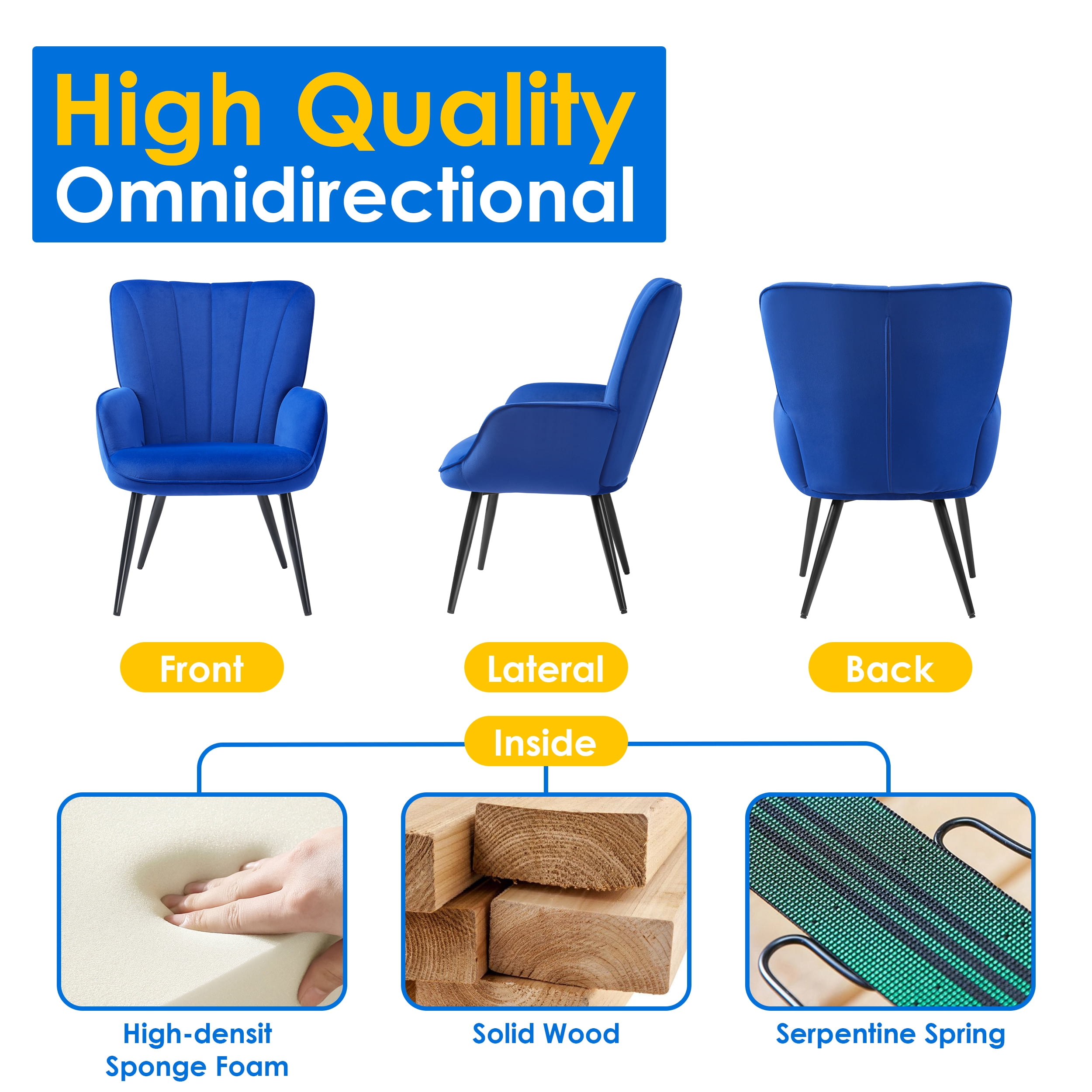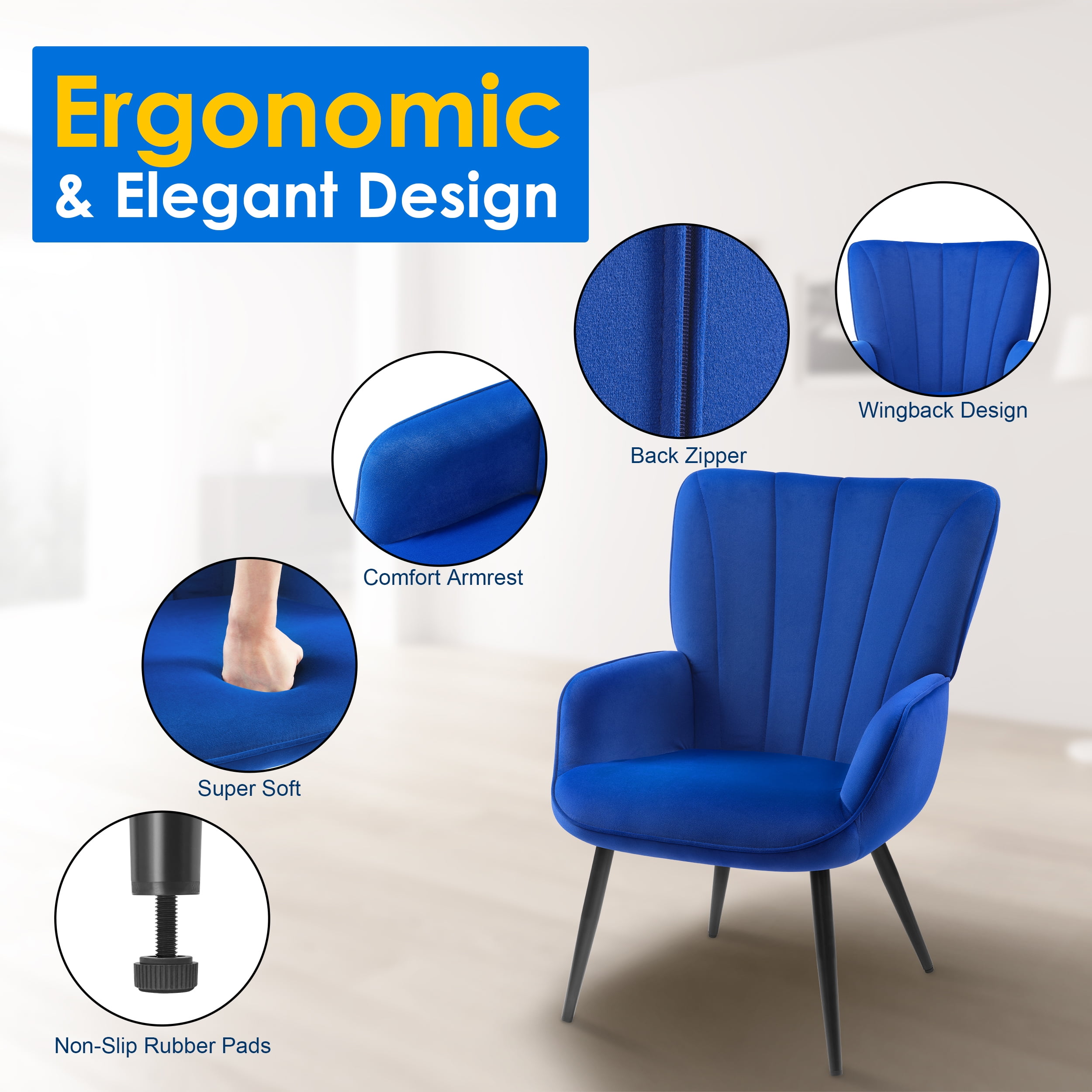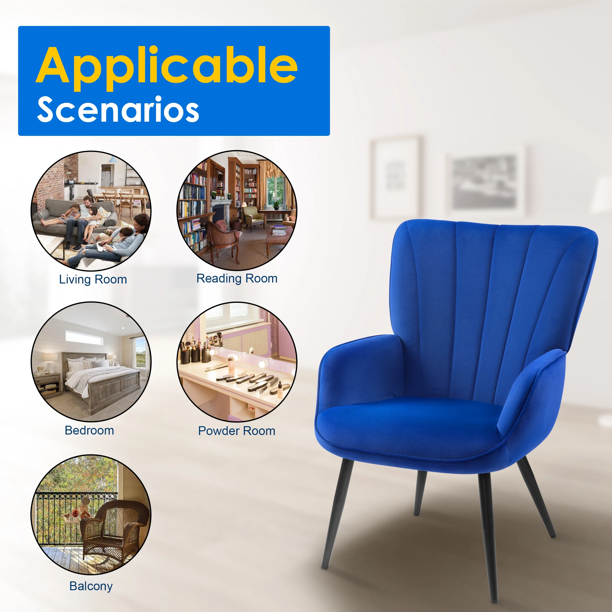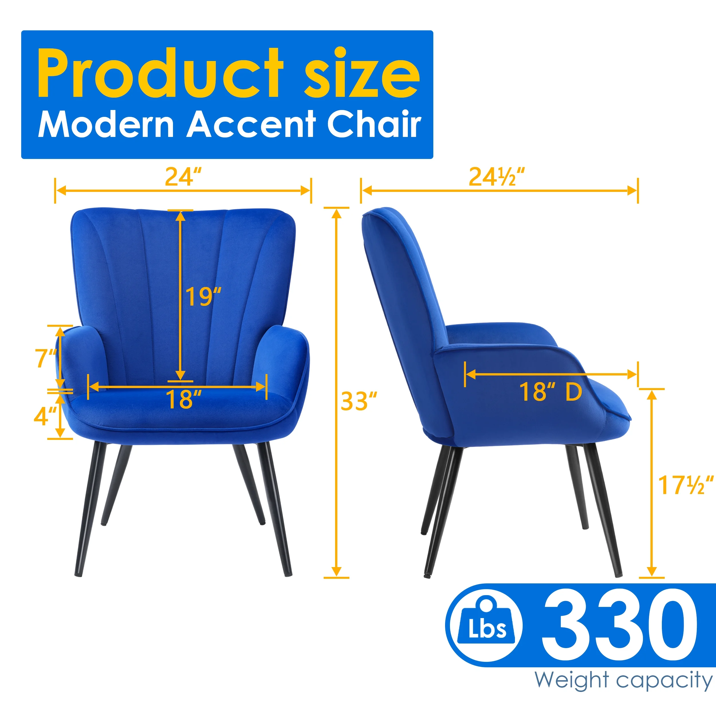 【MODERN DESIGN】- Crafted from premium velvet with a luxurious thread-tufted design, this wingback armchair adds a touch of luxury to any room. Sleek black metal legs further enhance its modern aesthetic. Combining style with comfort, this armchair features thick, wide sponge cushions made from high-density foam for a comfortable, restful seat. 【DECENT SIZE&WIDE BACK】-Boasting an 18″ deep seat and a 24″ wide backrest, this comfy armchair provides a spacious and comfortable sitting area, ideal for reading, working, or simply unwinding. Its slightly reclined back offers ample support, ensuring a relaxed and cozy experience whenever you lean back to enjoy a moment of relaxation. Dimension: 24.5″D x 24″W x 33″H. 【DURABLE CHAIR】- Our modern accent chair seats feature high standard engineered wood frames, soft velvet, rich textured fabrics and elastic foam padding. Due to its sturdy metal legs, this Accent Chair armchair provides great stability and a weight capacity of 330 pounds. 【WIDLY APPLICATIONS】- Indulge in the luxurious comfort of these wing back chairs, crafted from silky velvet. Versatile and stylish, these upholstered chairs are perfect for any occasion, whether as a side chair, conference chair, dressing vanity chair or study reading chair, combining practicality and elegance. Whether decorating your living room or bedroom, or from kitchen to office, from waiting room to guest room, they will blend seamlessly into the interior environment. 【EASY ASSEMBLY】- This living room high back chair comes with assembly instructions and all tools, so you can install it quickly and independently. If you have any questions, please contact our after-sales service and we will give you a satisfactory answer at the first time. Product Description: Product Type: Modern comfy Accent Chairs for Living Room Seat Length: 18 inch Size: 24.5″D x 24″W x 33″H Back Type: High Back/Wingback Base Style: 4 Legs Swivel: No Arms Included: Yes Leg Color / Finish: Black Upholstered: Yes Pattern: Solid Color Upholstery Material:Teddy Velvet Upholstery Material Texture: Boucle Frame Material: Solid + Manufactured Wood Fill Material: Foam Back Fill Material: Foam Seat Construction: Manufactured Wood Cushion Construction: Foam Arm Material: Foam/Velvet Leg Material: Metal Tufted: No Arm Type: Recessed Arms Weight Capacity: 330 lb. Product Care: Wipe clean with a dry cloth Assembly Required: Yes Commercial Warranty: Yes Package: 1 x Accent Armchair 1 x Tool bag 1 x Instruction: Assembly Manual