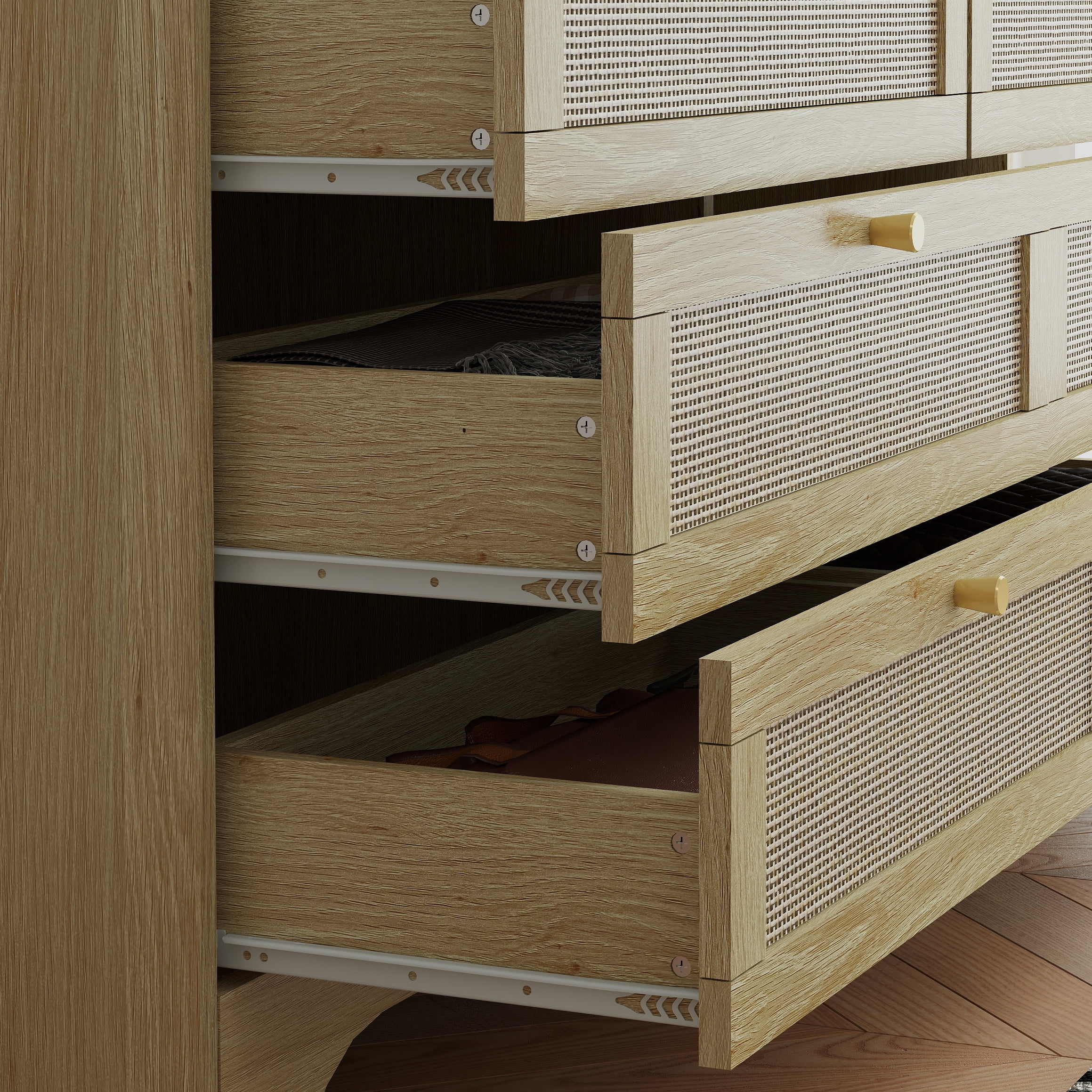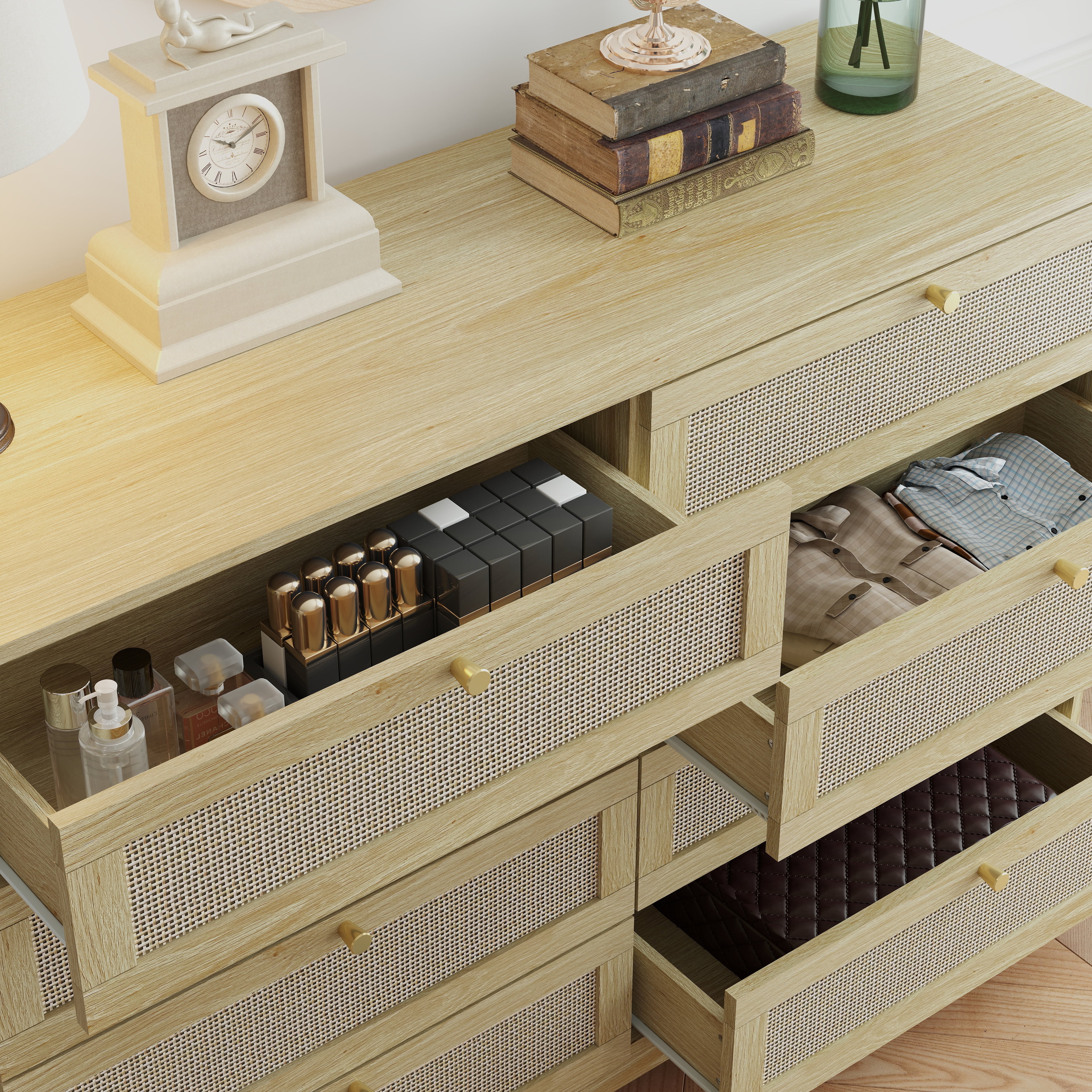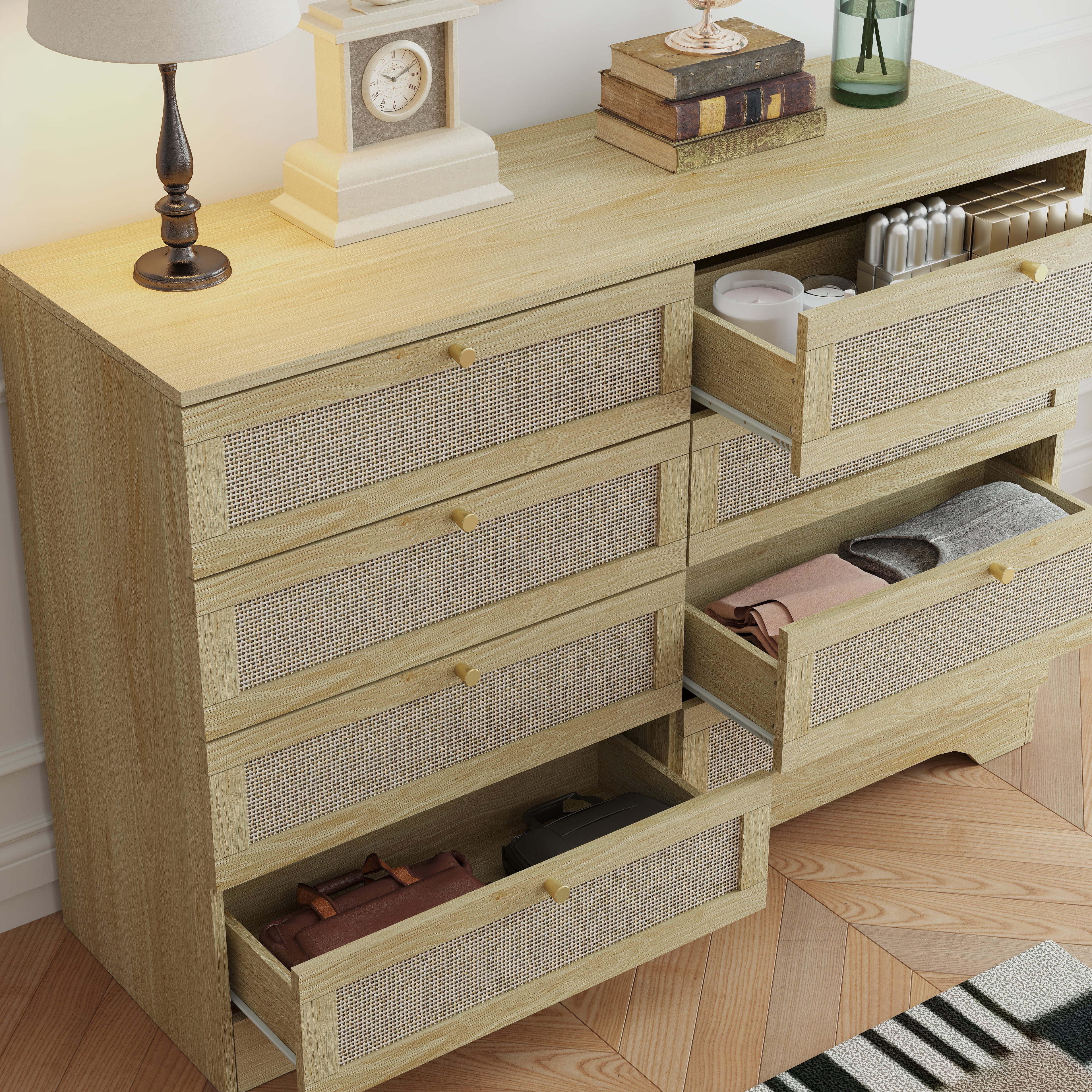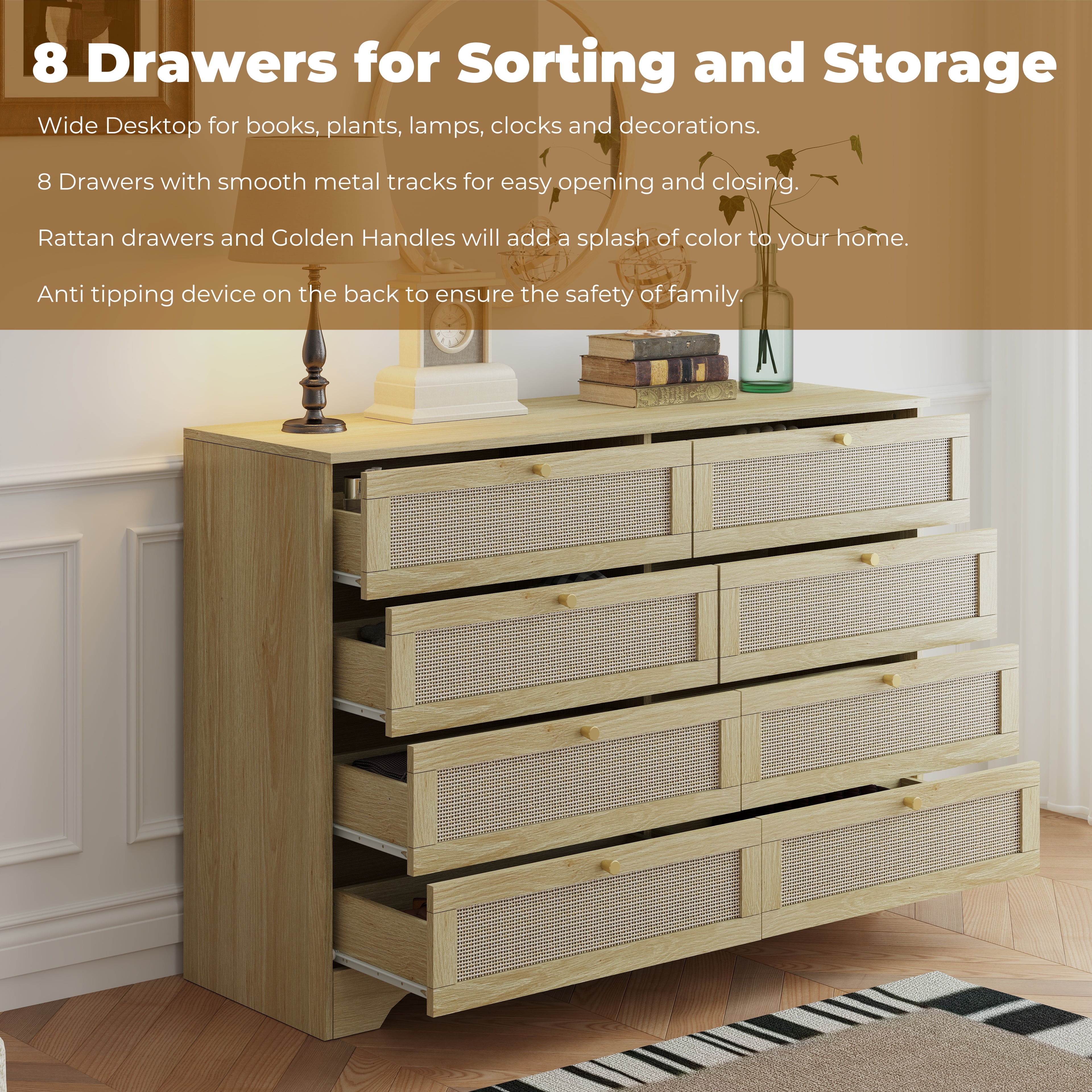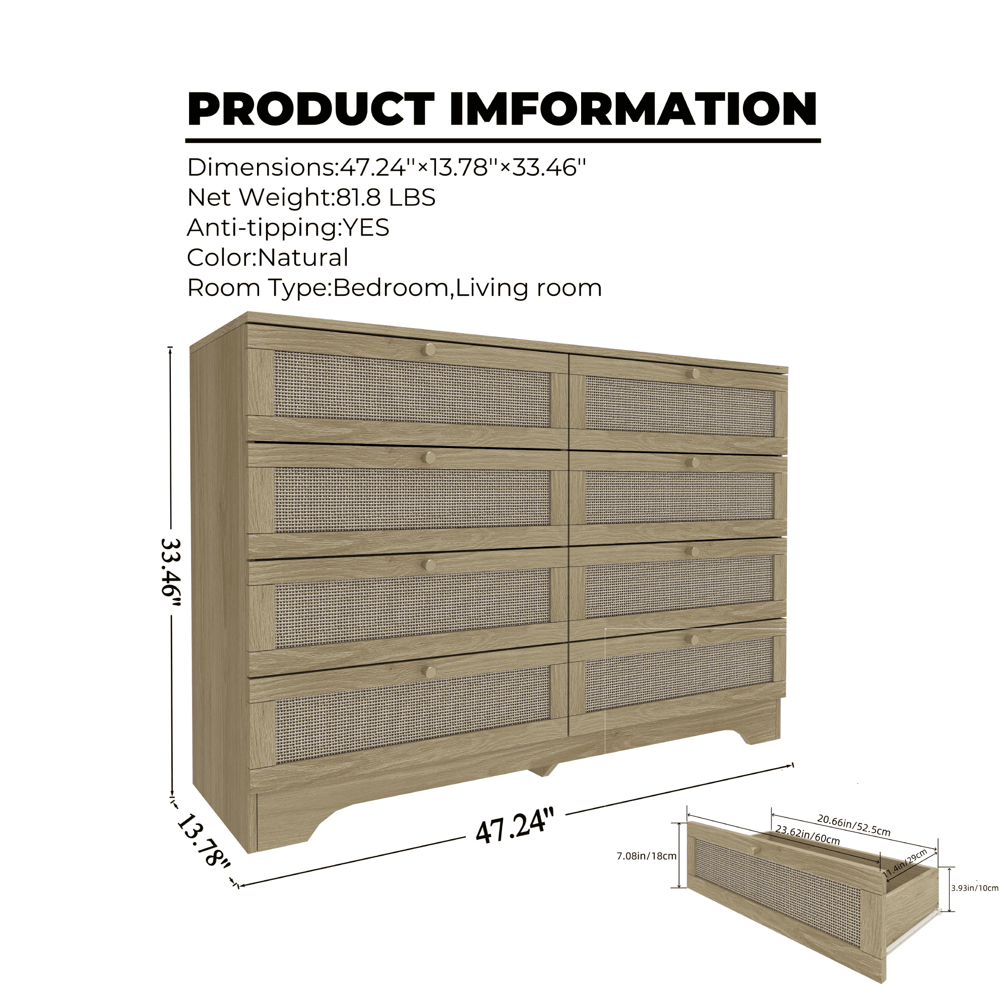 【Spacious Storage Space】With 8 large drawers, this rattan dresser provides ample space for classifying clothes, cosmetics and other daily items, keeping your room tidy all the time. The spacious open tabletop serves as a great display area for decorative items and additional storage. 【Sturdy and Stable】Each component is carefully crafted to meet high-quality standards, providing long-lasting functionality and reliability. With its sturdy construction, this rattan dresser offers both style and practicality, making it an ideal addition to any home. 【High Quality Materials for Long-lasting】This chest of drawers is made from high-quality particle board certified by CARB P2 and TSCA, featuring a sturdy MDF back panel for added strength. The sturdy wooden frame is scratch-resistant, waterproof, and easy to clean. No feet design increases the stability and load-bearing capacity of the cabinet. 【Versatile Drawer Dresser】The modern dresser features a smooth metal sliding system, allowing drawers to open and close easily and quietly. As a space-saving solution, it meets your storage needs in the bedroom, living room, closet, hallway, entryway and family room. 【Anti-Tippling Device】This 8 drawer dresser comes with anti-tipping accessories to ensure the safety of your family, so you can have peace of mind. For better stability and years of reliable use, place lighter items on top and heavier items on the bottom. 【Natural Rattan Style】The rattan dresser features a sleek, smooth surface complemented by elegant gold metal handles and a striking rattan design. Its natural aesthetic and premium craftsmanship exude a charming farmhouse and boho vibe, making it a versatile piece that seamlessly blends with a variety of interior styles. 【Effortless & Worry-Free Installation】 Click here link to watch the installation manual! User-friendly instructions and labeled hardware make the dresser easy to assemble. For convenience and safety, we recommend that two people install this dresser together. Quality customer service: We provide warranty and lifetime technical support. Should you have any questions regarding the installation, product itself or the pieces, we will help you solve it within 24 hours @TrumanPick 【Specification】 Material: E1 Grade MDF Wood, EPA-grade Particle Board, High-quality Metal Item Type: Versatile Dresser, Chest of Drawers, Dresser for Bedroom, Wood Dresser Product Size: 47.24″L x 13.78″W x 33.46″H Drawer Size: 20.66″L × 11.4″W × 3.93″ H Overall Product Weight: 81.8 lbs Package Contents: 1 x 8 Drawer Dresser 1 x Accessory Kit 1 x Instructions Manual