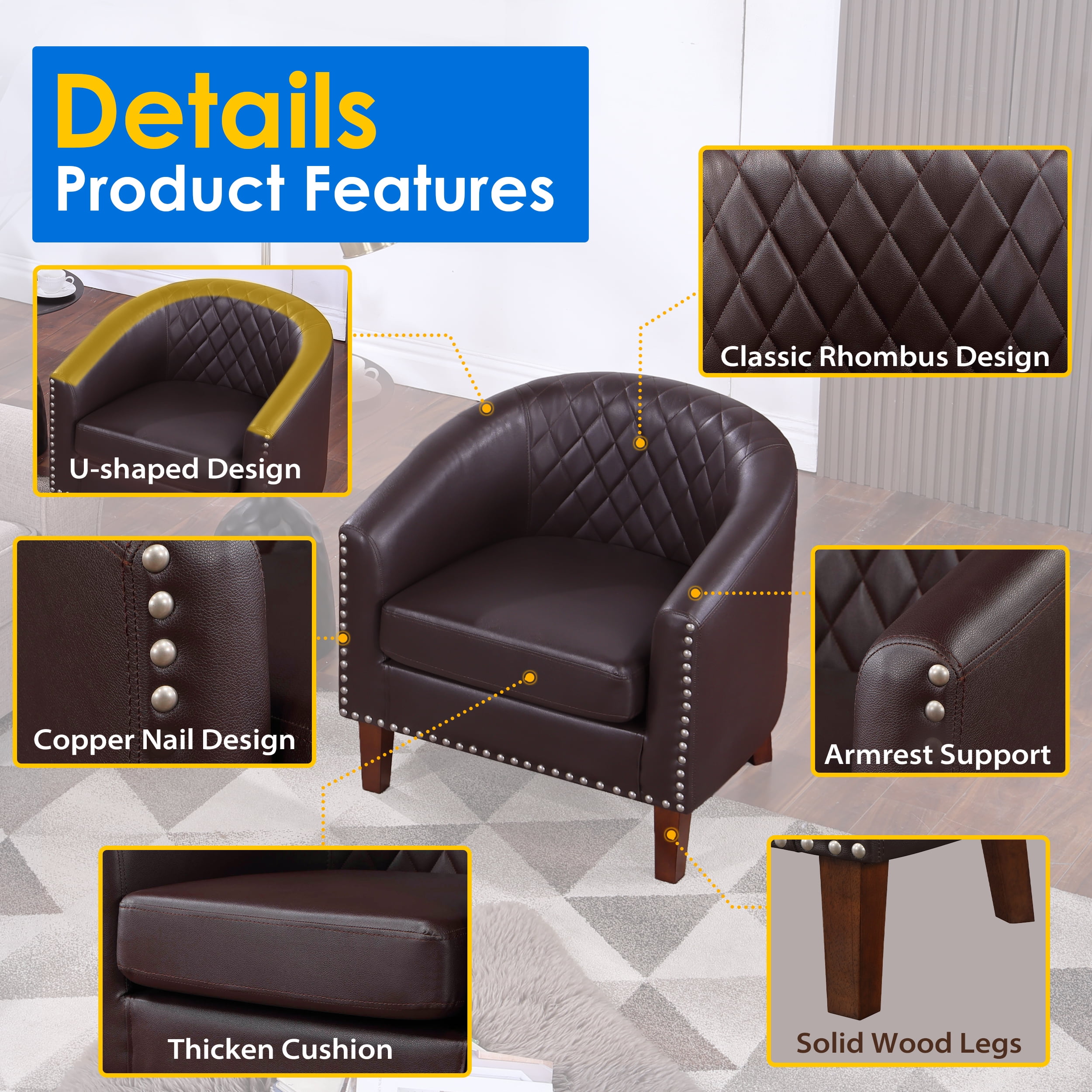 Complete your living room or bedroom decor with this barrel club chair featuring a classic silhouette. It features a solid and engineered wood frame with slightly tapered legs for a modern look. The armchair is wrapped in faux leather upholstery in neutral tones to match most styles and color schemes. Additionally, the armchair is filled with high-density foam to provide ample support while you relax. Diamond tufting on the back, rounded arms and nailhead trim complete this traditional design. Whether it’s in your living room, bedroom, children’s room, home bar, or in a commercial setting such as a cafe or hotel, this chair provides a beautiful place to relax. Features: 【HIGH QUALITY CHAIR】 – This barrel armchair is crafted from plush PU leather and features a padded cushion, ensuring optimal comfort for you. Its minimalist yet refined structure exudes coziness, while the high-density, high-resilient native sponge keeps you comfortably relaxed. Built with sturdy construction, offering comfortable seating without compromising on fashion or style. 【ELEGANCE DESIGN】- This nail-head barrel chair is a versatile choice for any interior setting, effortlessly blending style with sophistication. Whether adorning upscale clubs, Victorian homes, or modern apartments, its timeless design adds a touch of elegance to any space. With its classic silhouette, this chair seamlessly integrates into any room, elevating your decor with its iconic charm. 【SUITABLE DIMENSION】-This club chair boasts dimensions of 28.74″ W x 27.17″ D x 28.35″ H, providing ample space for a comfortable lounging experience. The cushioned seat measures 20.87″ in width and 21.65″ in depth, ensuring a cozy seating area. With a generous 6″ thickness and high-rebound foam, the cushion offers exceptional support, making extended sitting sessions a breeze. 【DURABLE AND STURDY】- Crafted with meticulous attention to detail, this chair is built to withstand the passage of time. Its robust solid wood and plywood frame and resilient leather upholstery, coupled with high-density foam, guarantee its enduring presence as the centerpiece of your home. Combining timeless style with unwavering quality, this chair promises to remain a cherished fixture for years to come . 【EASY ASSEMBLY】- All the instructions and tools needed to assemble arrive with the living room chair, It is easy to set up, you can easily assemble it in 20 minutes. The water-resistance high-quality faux leather cover can be easily cleaned with a damp cloth. Product Dimension: