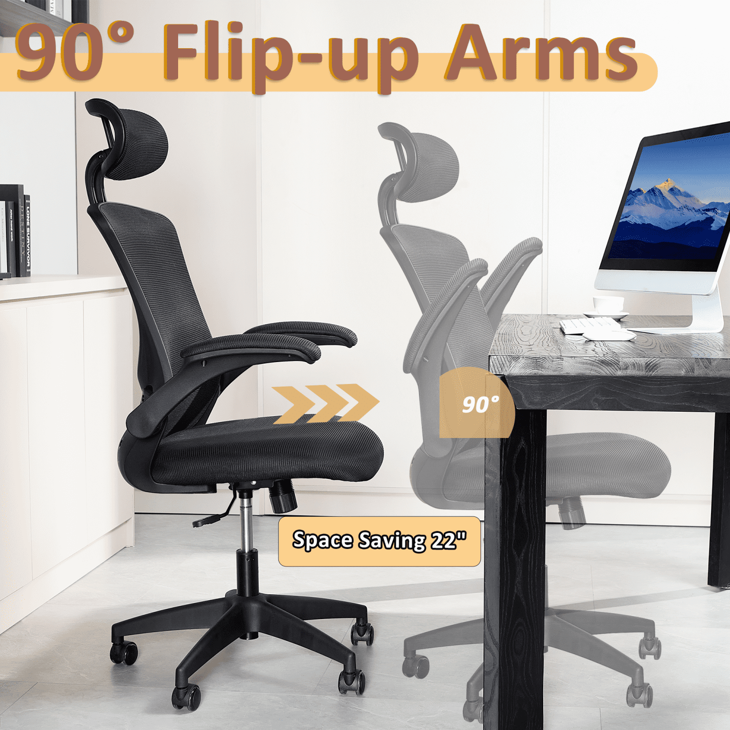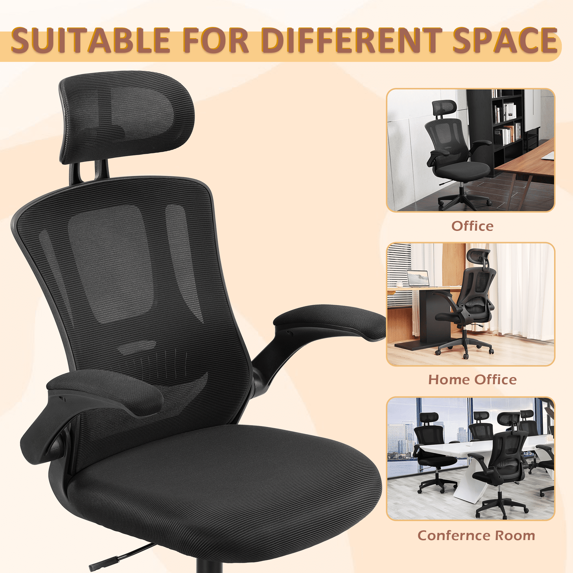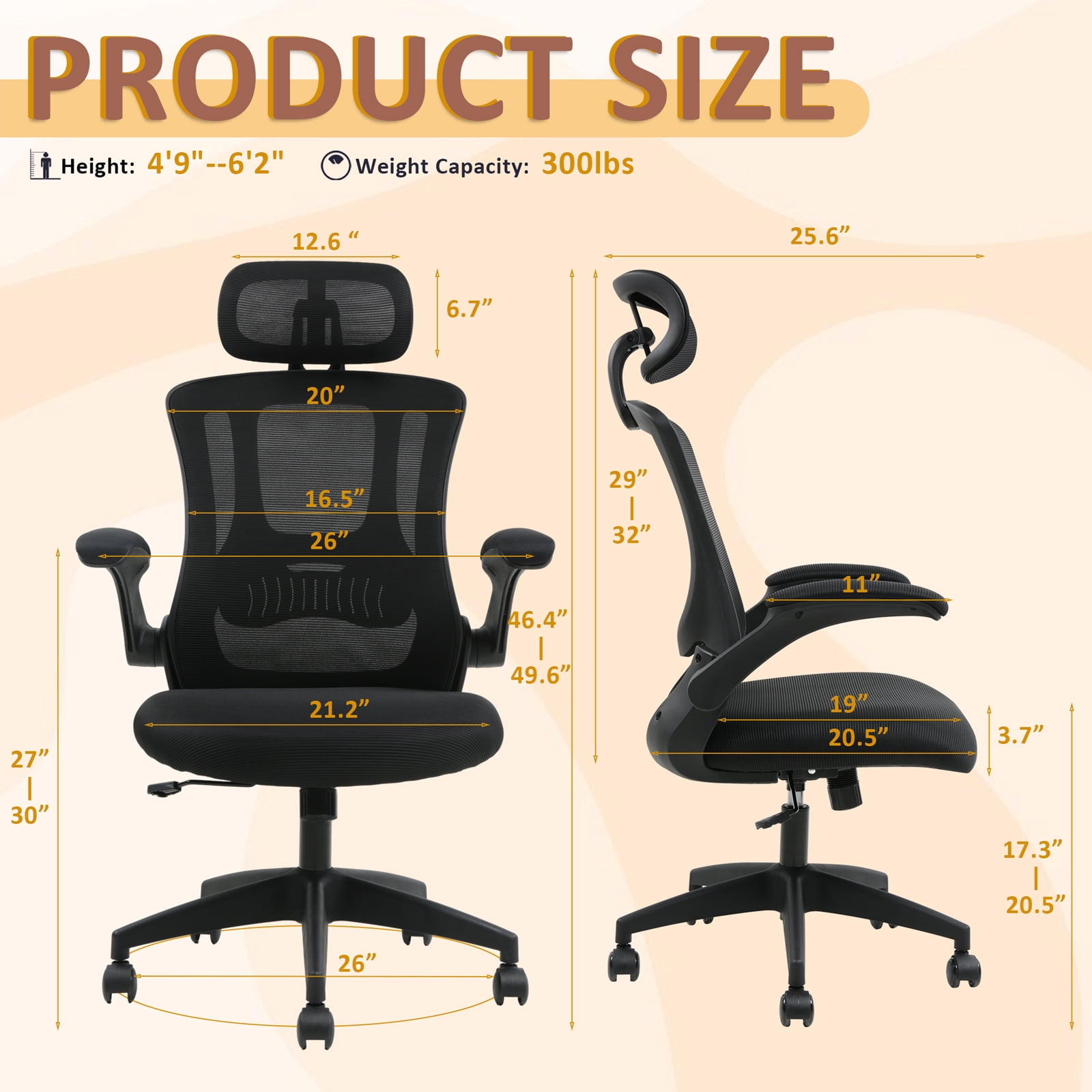 【Ergonomic office chair】The ergonomic computer chair provides 4 supporting points(head/ back/ hips/ hands) and a proper lumbar support. It’s easy to adjust seat height, headrest, backrest and flip-up arms to meet different needs, good for sitting long hours.The seat height is also adjustable, ranging from 18.1 inches to 21.3 inches, offering a suitable position for different desk heights and body types, suitable for people of about 5’5″ to 6’2″-350 lbs Load Capacity. 【Adjustable flip-uo armrest】The adjustable flip-up armrests allow you to customize your seating position, Folding the armrests up 45°, you can push the executive office chairs directly under the desk to save valuable space. 【Comfortable Breathable Mesh Seat】 He mesh back and mesh seat keep air circulation for extra comfy. High quality mesh resists abrasion and transformation, it makes the high back computer desk chairs good for sitting for 4 ~ 8 hours, perfect for a long day sitting.The recline function makes you tilt the backrest back (90~120°) or sit straight freely. 【Mute wheels】With its sturdy nylon base and smooth-rolling casters, The 360-degree swivel feature allows for easy maneuverability without any worries about tipping over or damaging your floor.while the adjustable 3D headrest provides personalized comfort and support for your neck and head, with the ability to tilt up to 45 degrees. 【Suitable for any scene】This home office desk chair also used as student & adults office chairs, computer chairs, ergonomic chairs, desk chairs, and gaming chairs. This office chair also suits office workers, home office workers. Wherever you are, This computer chair is a perfect match for.