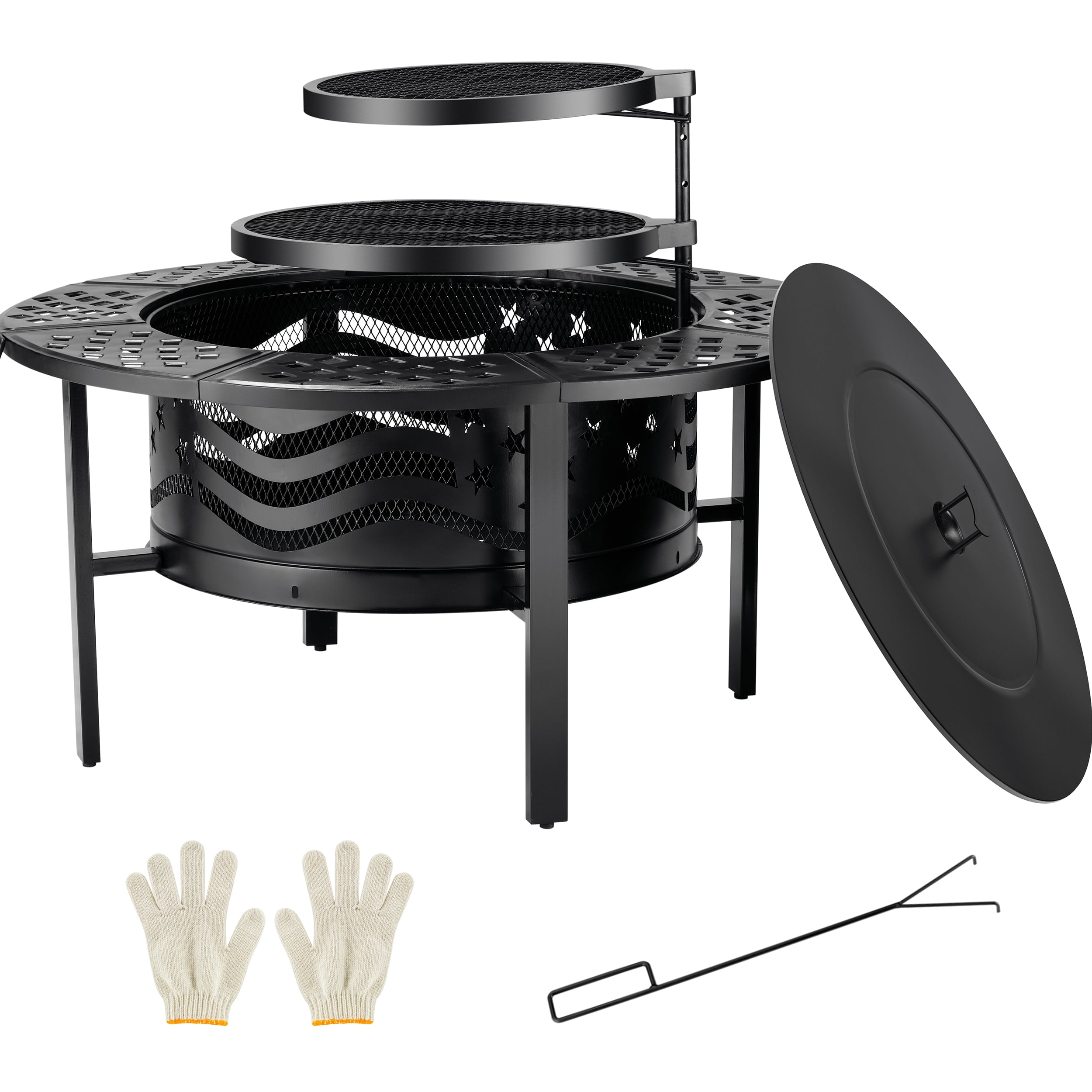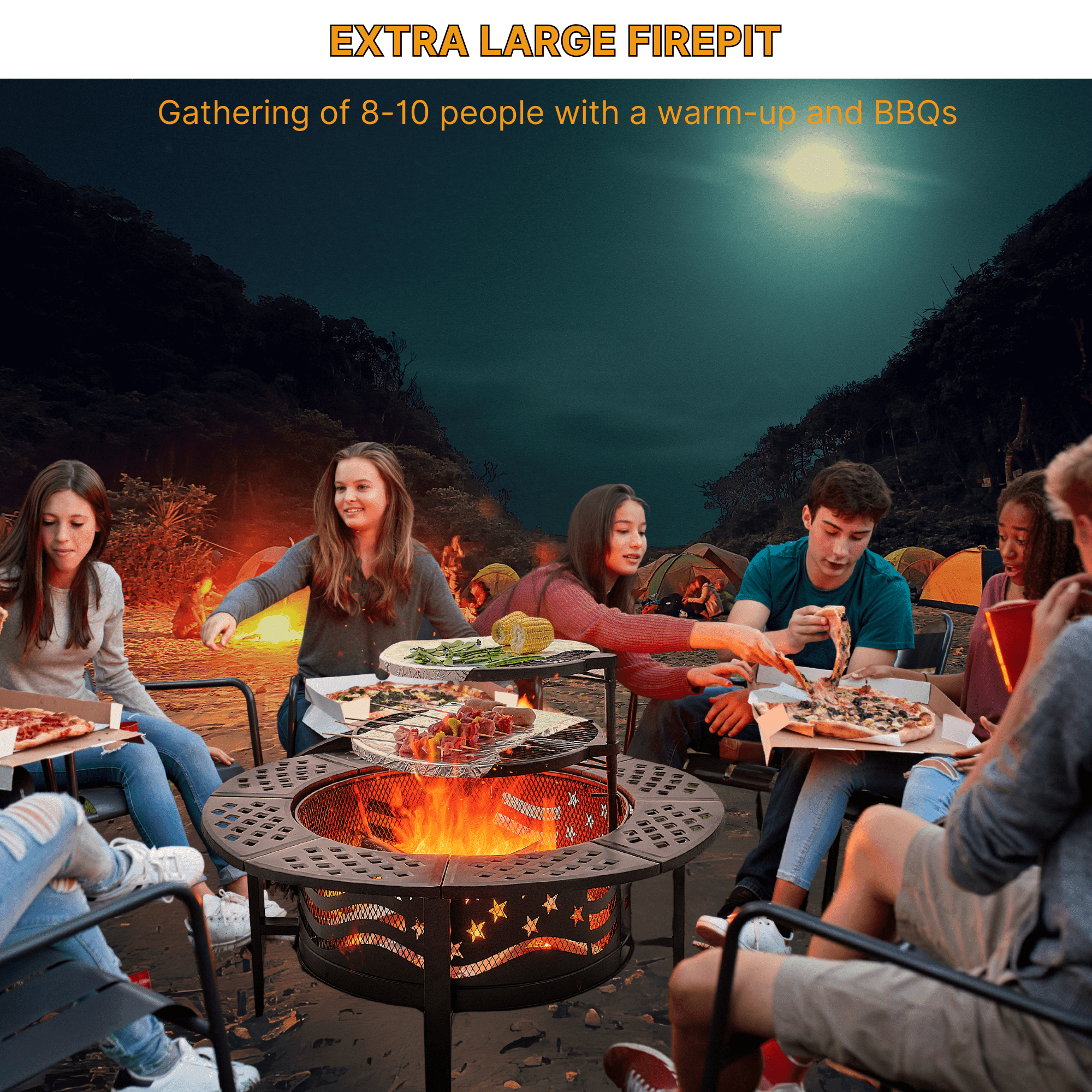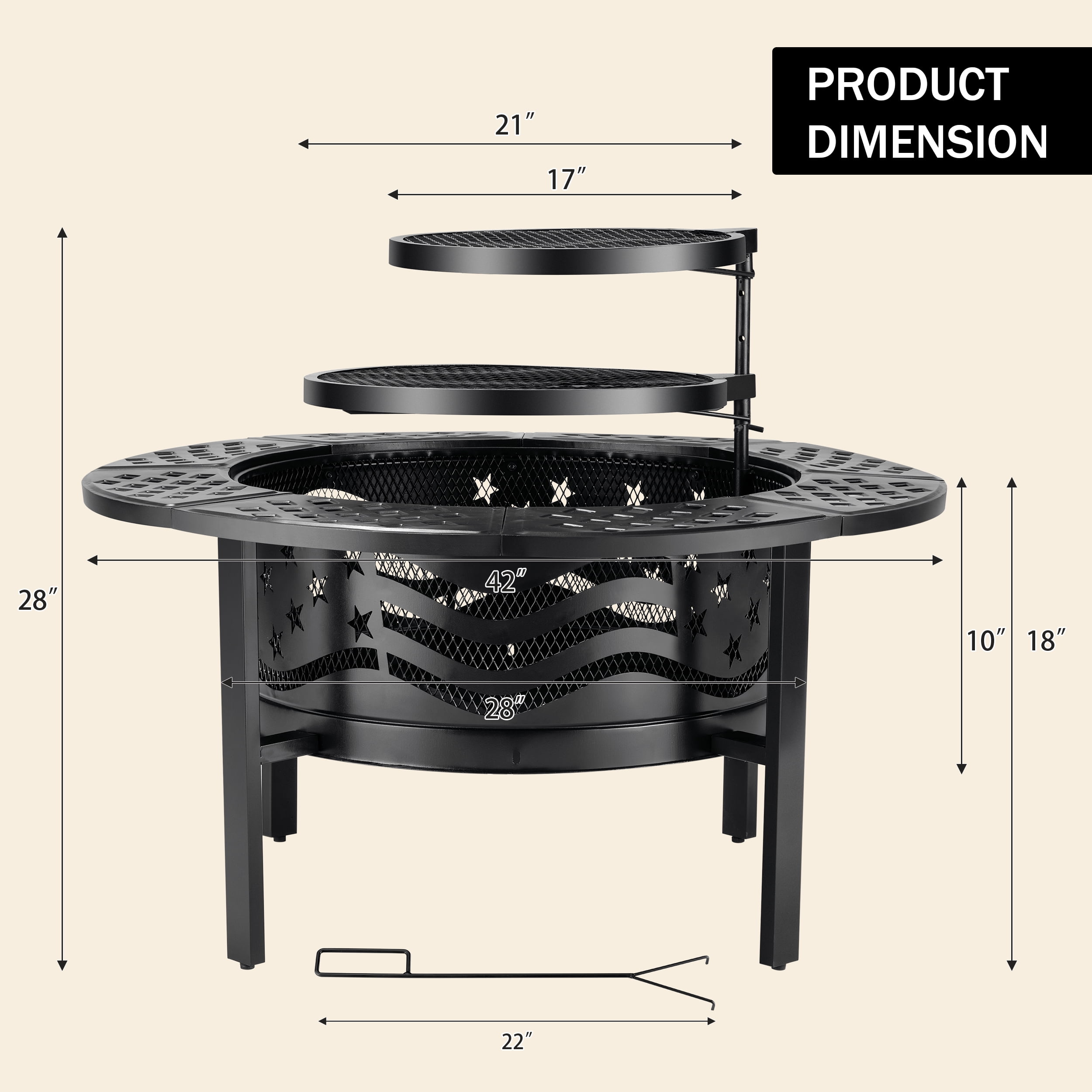 Enjoy healing nights around a warm campfire with the TrumanPick 42-Inch round wood burning fire pit. Made from enduring high-temperature steel, this fire pit features 2 height-adjustable 360° cooking grill grates designed to better regulate the temperature your food needs. One can also be used to bake foods such as meats, vegetables, marshmallows or candies, while the other can be used to insulate. With its traditional wood-burning function, you can start a fire with ease. The firepit also comes with a poker so you can put out fires easily. When the lid is closed, the fire pit turns into a 42-inch metal round table, suitable for 8-10 people to sit and enjoy leisure time around the balcony, courtyard, or garden. Gather your friends around the patio fire pit and create unforgettable memories!