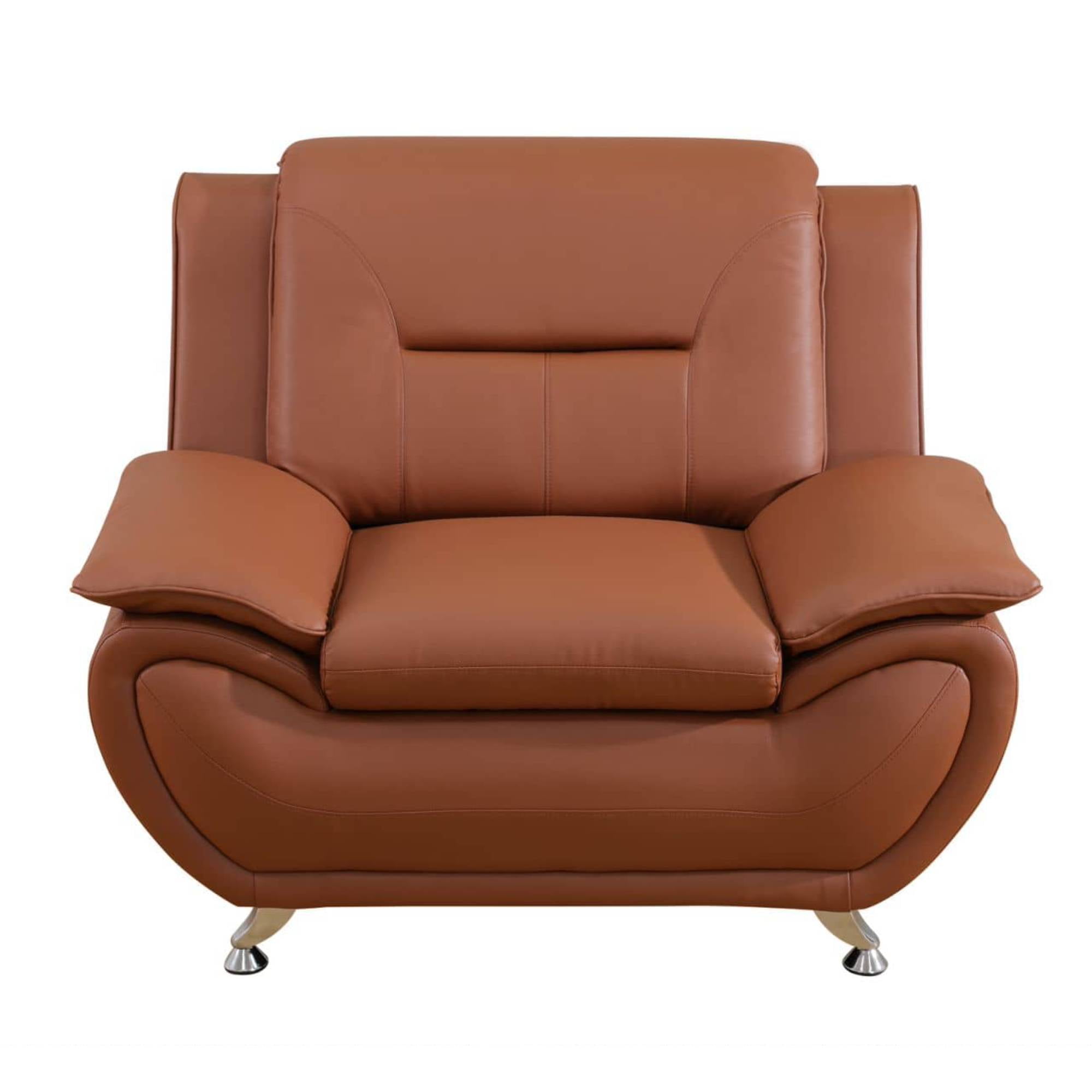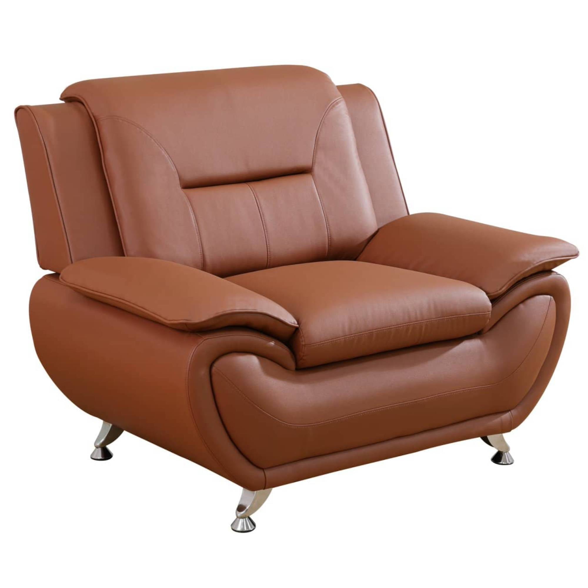 Mid Century Elegance: Our Faux Leather Sofa chair seamlessly combines sleek, mid century design with refined sophistication, making it the perfect addition to any interior. Whether placed in your living room, bedroom, office, lounge, or conference room, this sofa elevates your space with timeless elegance and modern appeal. Durable and Comfort: Crafted with premium faux leather and a solid wood frame, our cozy sofa couch ensures long-lasting durability and exceptional comfort. The high-quality materials offer a sturdy yet inviting seat, creating the perfect place to unwind after a long day. Sleek Metal Legs: Featuring strong, stainless steel metal legs, this living room sofa not only adds a contemporary edge to its design but also facilitates easy cleaning and maintenance. With all necessary hardware and accessories included, assembly is quick and effortless, so you can start enjoying your new sofa in no time. Effortless Setup and Maintenance: Designed with convenience in mind, this futon sofa is simple to assemble and maintain. The faux leather upholstery is not only stylish but also easy to clean, ensuring long-term durability and keeping your space looking fresh. Perfectly Sized for Any Space: At 35.5″D x 46 “W x 36″H inches, this modern sofa chair is the ideal size for a variety of rooms. Whether you’re furnishing a compact living room, a cozy dorm, or a spacious lounge, it provides the perfect balance of comfort and functionality, transforming any space into a welcoming retreat. Product Description: Dimension: 35.5″D x 46″W x 3 6 “H Sofa Style: Modern Leather Sofa Couch Chair For Adults Tufted: Yes Upholstery Color: Brown Leg Color / Finish: Silvery Upholstery Material: Faux Leather Mattress Material: Memory Foam Leg Material: Metal Arm Type: Pillow Top Arms Fill Material: Foam Back Fill Material: Foam Frame Material: Manufactured Wood Seat Construction: Sinuous Springs Cushion Construction: Foam Foam Density: 1.9 lbs./cu. ft. and over Weight Capacity:350 lb. Instruction: Assembly Manual Durability: Water Resistant, Stain Resistant, UV Resistant Product Care: Wipe clean with damp cloth