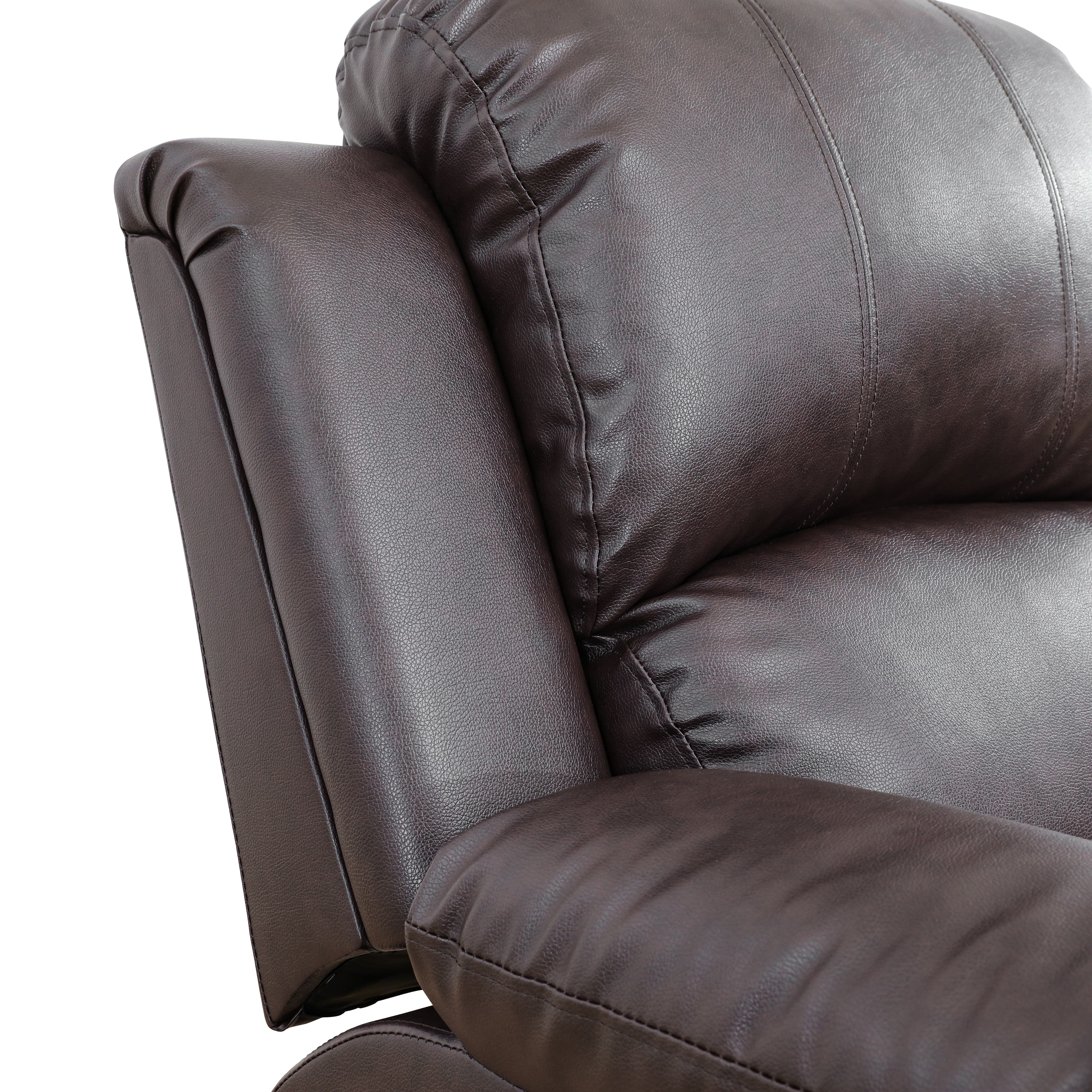 Comfortable and Overstuffed: Customize your seating arrangement by mixing and matching the included sections to fit your space perfectly. This leather recliner features bonded leather upholstery, an overstuffed backrest and armrests, and a pocket coil spring seat cushion covered with premium foam for unparalleled relaxation at home. One-Pull Reclining Motion: Effortlessly adjust the recliner with the convenient pull tab, allowing you to recline to a comfortable 110 or 145 degrees. The thick cushions and reclining mechanism provide the ideal space for work, leisure, and rest throughout the day. Versatile Use: Ideal for living rooms, bedrooms, and home theaters, this recliner boasts a sturdy pine wood frame and heavy-duty steel mechanism, supporting up to 350 lbs. Enjoy premium cushion support and overstuffed armrests while you watch TV, work on a laptop, or spend time with family and friends. Easy Assembly & Dimensions: Assembly is simple and tool-free, requiring just a few steps. The recliner measures 38″W x 37″D x 41″H, with a seat height of 21″. Please verify the size before purchasing to ensure it meets your needs. ASSURED AFTER-SALES: We are confident that the unique quality, durability, functionality and design of our manual recliners will absolutely blow your mind. Any questions, contact us in time, we will give you a satisfactory answer. One-Pull Reclining Motion: Effortlessly adjust the recliner with the convenient pull tab, allowing you to recline to a comfortable 110 or 145 degrees. The thick cushions and reclining mechanism provide the ideal space for work, leisure, and rest throughout the day. Versatile Use: Ideal for living rooms, bedrooms, and home theaters, this recliner boasts a sturdy pine wood frame and heavy-duty steel mechanism, supporting up to 350 lbs. Enjoy premium cushion support and overstuffed armrests while you watch TV, work on a laptop, or spend time with family and friends. Easy Assembly & Dimensions: Assembly is simple and tool-free, requiring just a few steps. The recliner measures 38″W x 37″D x 41″H, with a seat height of 21″. Please verify the size before purchasing to ensure it meets your needs. ASSURED AFTER-SALES: We are confident that the unique quality, durability, functionality and design of our manual recliners will absolutely blow your mind. Any questions, contact us in time, we will give you a satisfactory answer. Product Type: reclininger Recliner Chair Overall: 35” L x 37” W x 40.5” H Seat Depth: 21.5” inch Color: Brown Leg Material: Metal Upholstery Material: Faux Leather Frame Material: Solid Wood; Metal Back Type: Split Back Seat Style: Multiple Cushion Seat Arm Type: Pillow Top Arms Reclining Type: Manual Fill Material: Foam Recline Angle: 160 Degrees Weight Capacity: 300 lb Product Care: wipe clean with a dry cloth