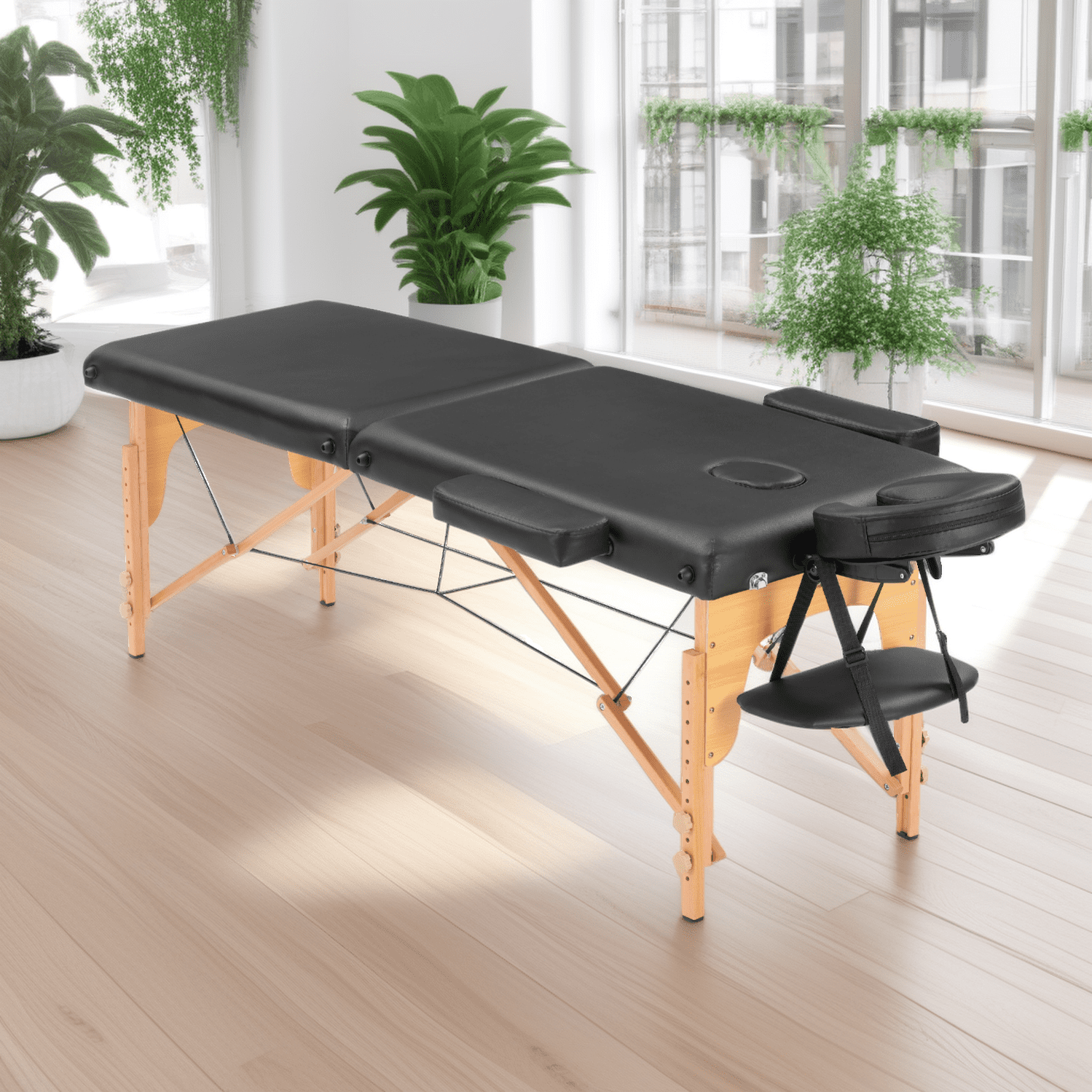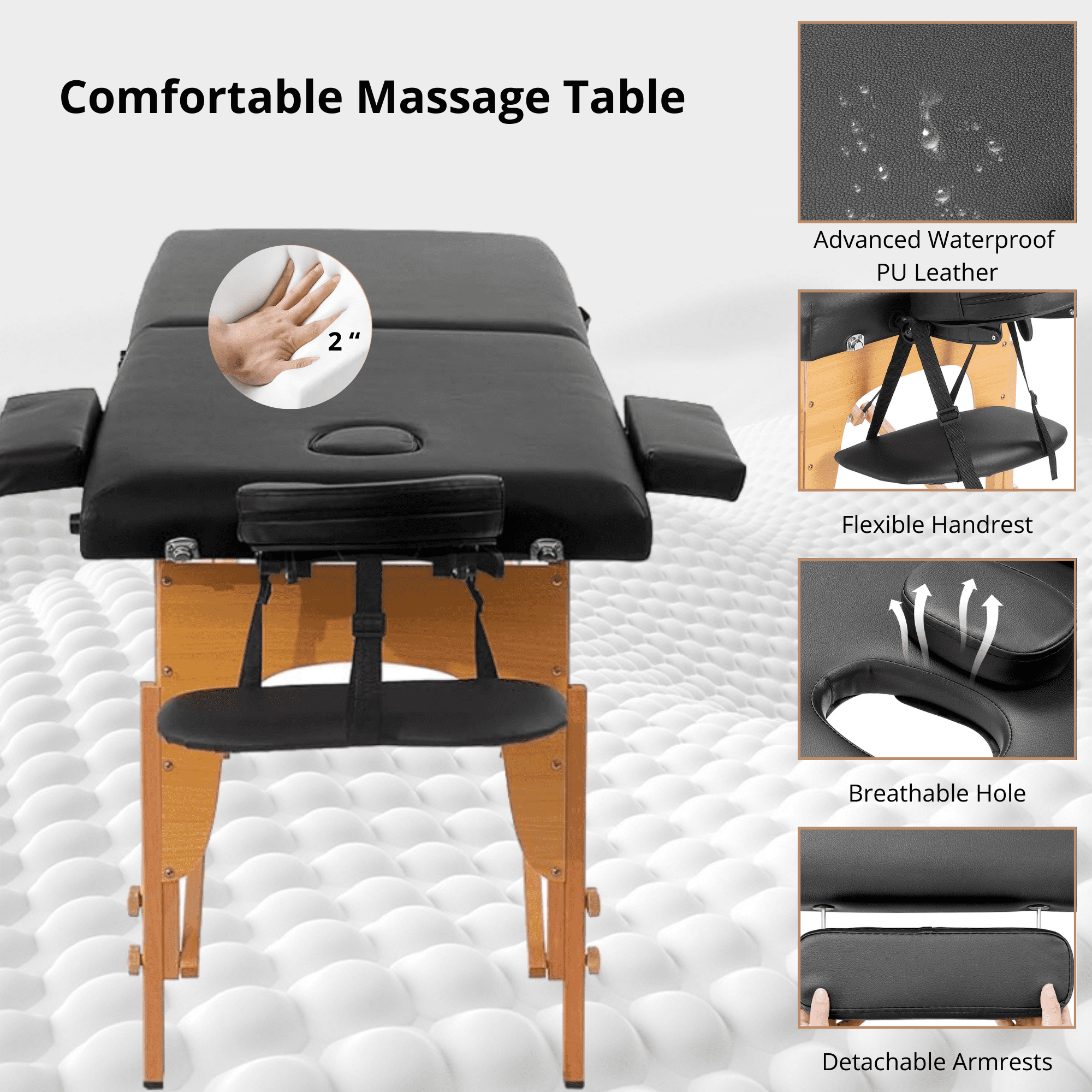 Experience tranquility and ultimate relaxation with our 2-Fold Wooden Massage Table! Designed with professional-grade craftsmanship, this massage table boasts a durable solid wood frame for reliable stability. The push-button adjustable wooden legs allow for quick and precise height adjustments, ensuring ease of use for both home users and professional therapists alike. Versatile and functional, this portable spa table is ideal for various massage techniques, including Swedish, deep tissue, and hot stone therapy. Its 2-inch-thick high-density foam padding provides exceptional comfort and support, guaranteeing a soothing and luxurious massage experience for your clients or yourself. Engineered for convenience, this massage table folds effortlessly in just 30 seconds, making it perfect for compact storage and easy portability. Whether you’re setting up a professional studio or creating a calming space at home, this massage table is tailored to meet all your relaxation needs.