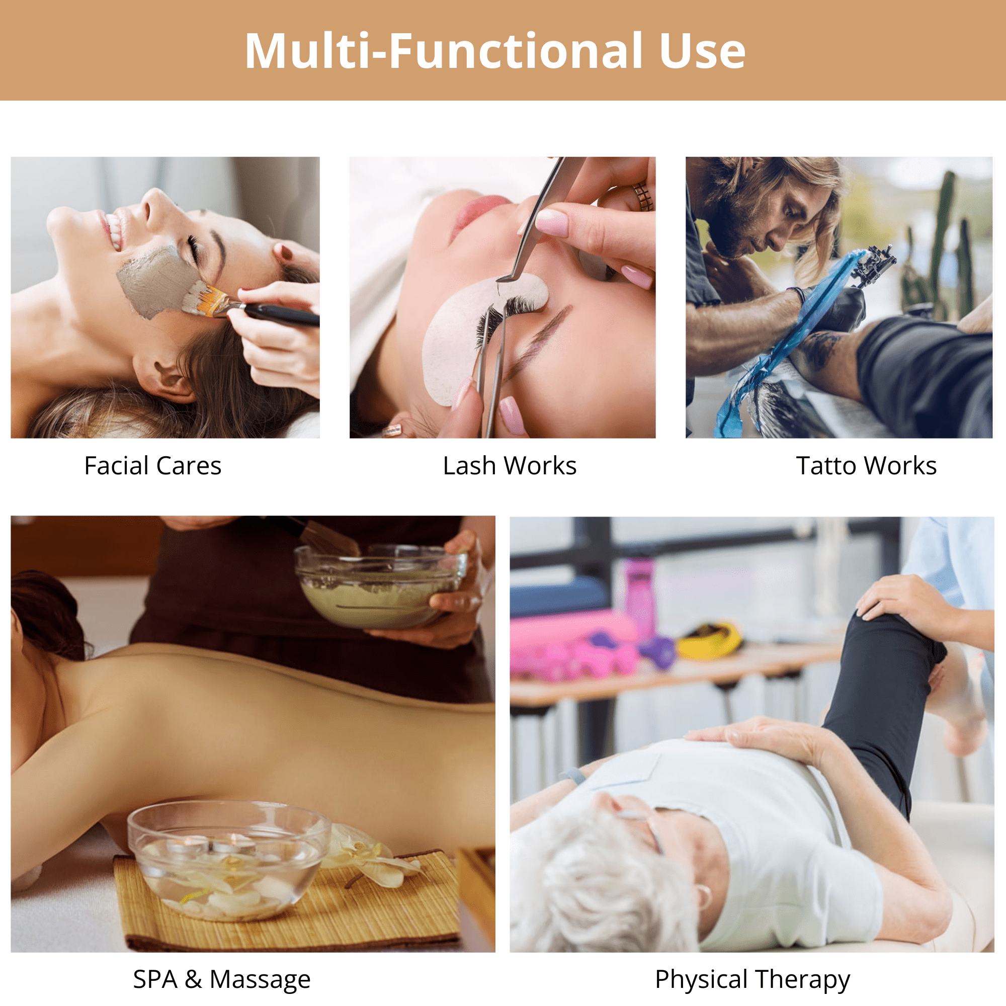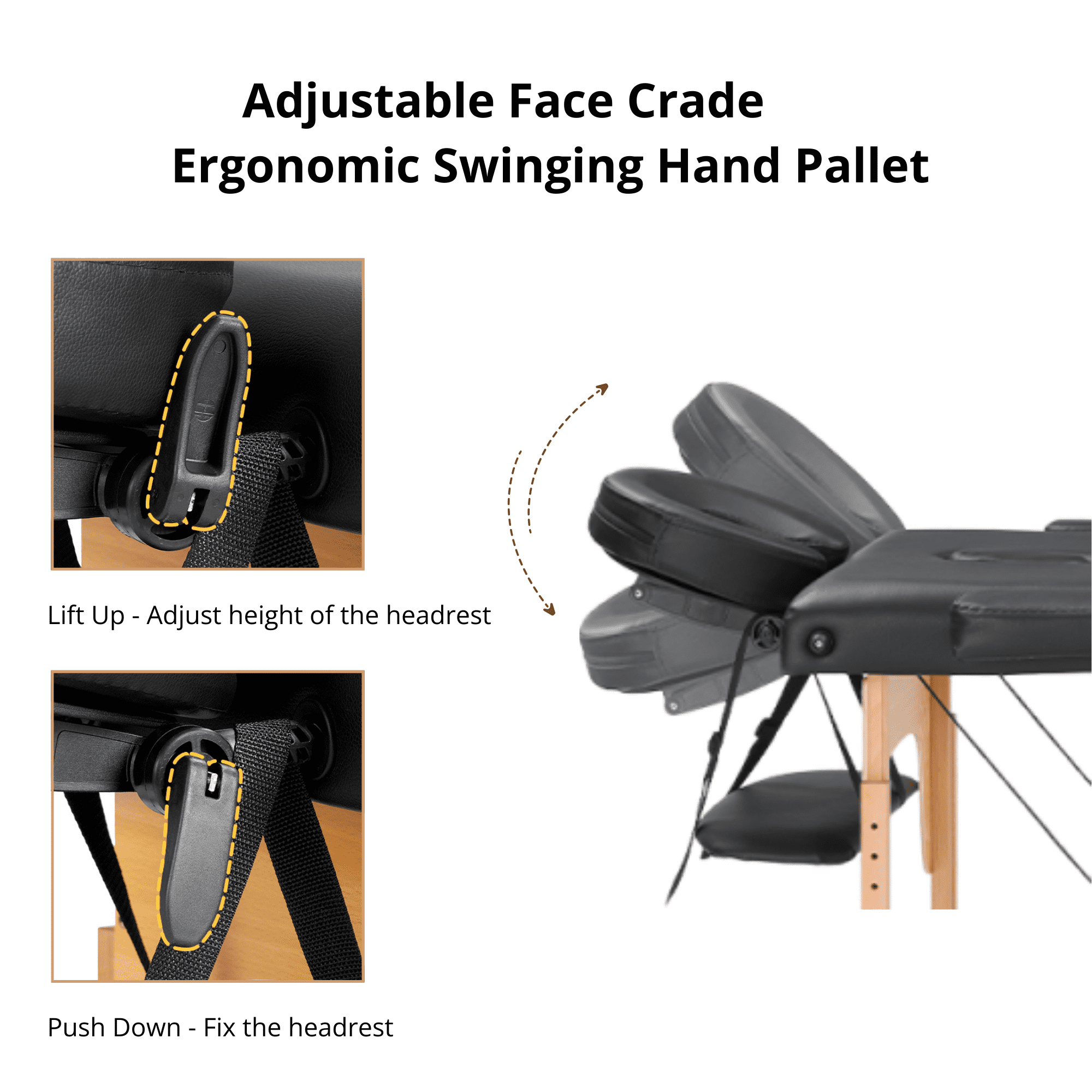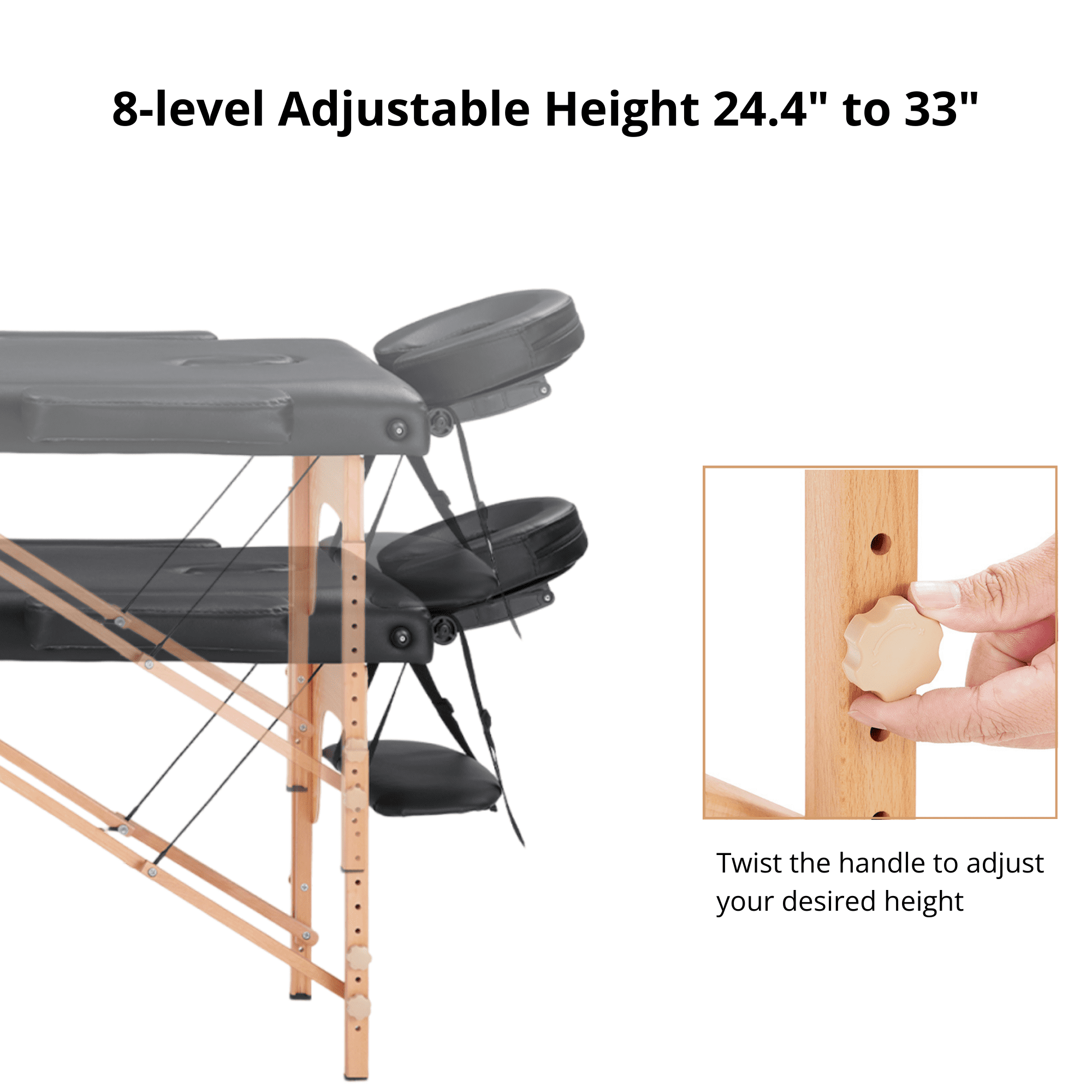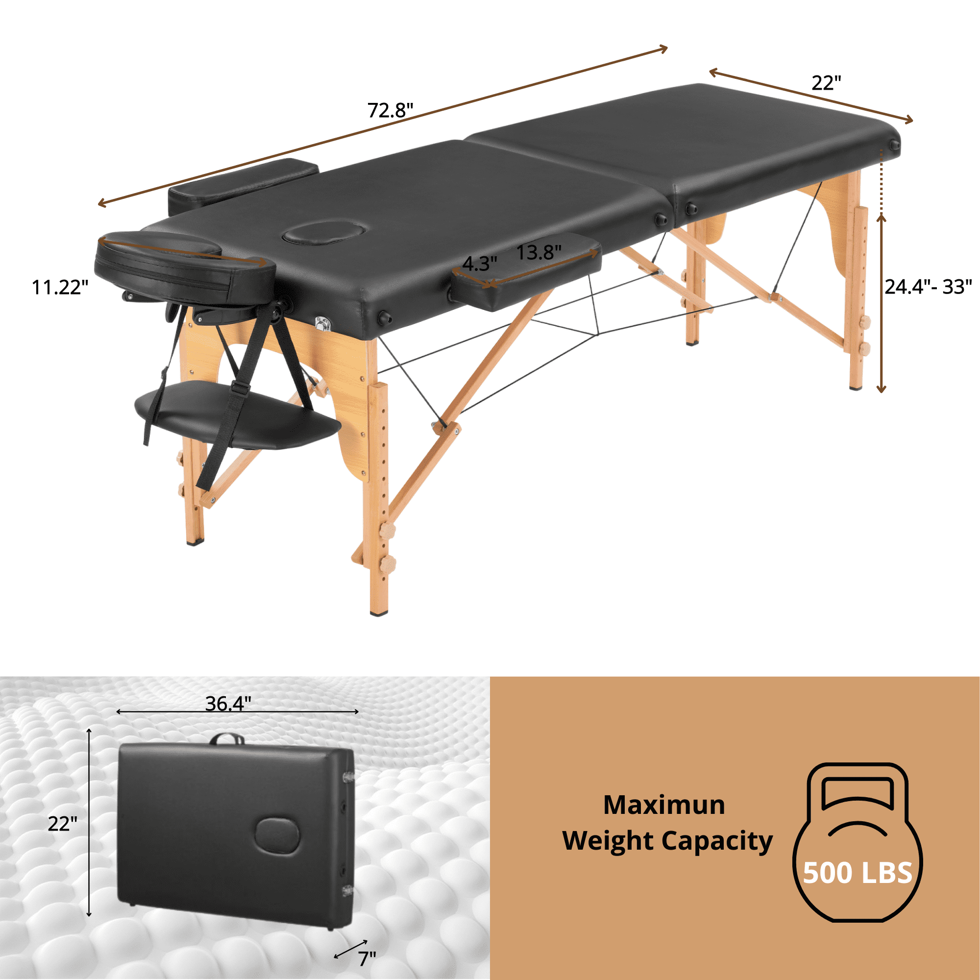 【Specification】 Weight Capacity of Massage Table: 500 lbs Frame Material: Hardwood Frame, High-strength Steel Cables Dimensions (Set up): 84″L (with face cradle) x 30.6″W (with armrests) 【Expert Craftsmanship for Enduring Quality】This professional spa bed is constructed with an hardwood frame and high-strength steel cables, providing a load-bearing capacity of up to 500 lbs. The table legs are designed with non-slip feet, providing a comfortable experience and enduring durability for this massage table. 【Foldable Massage Table with Hassle-Free Setup】Featuring a foldable design and security buckle, this massage bed unfolds in under 30 seconds without tools. When not in use, the spa bed easily folds in half into a compact carrying case with a handle, making it convenient to transport to the office, home, or anywhere. The folded design saves space, perfect for storage when not in use. 【8-level Adjustable Height】The massage table features 8 adjustable height levels, ranging from 24 to 33 inches. Simply press the small round knob on the leg to adjust the height. This flexibility makes it ideal for therapists of various heights,ensuring excellent service for all clients. 【Premium Comfort for Various Needs】Featuring soft cushioning, the table top and armrest wings both of the lash bed are composed of a 2″ thick layer of high-density foam. The face cradle contains 3″ of foam with a removable cover. The headrest adopts a quick-fix locking device and it is adjustable for different heights or angles. 【Easy to Clean and Oil & Water-proof】The portable massage table bed cover is draped in a luxurious PU synthetic leather, a highly durable, soft, and vegan-friendly material that is not only easy to clean, but has no offensive smell like other synthetic materials. It is also oil and water-proof to resist stains. 【Versatile Applications】This massage table can also be used for lash bed, facial bed, spa bed, esthetician bed, chiropractic table, physical therapy table, waxing table, etc. The detachable headrest and armrests on this massage table are secured with bungee cords to prevent loss, and the headrest is supported by an integrated pallet for enhanced comfort. Package Contents 1 x Massage Table 1 x Accessory Kit 1 x Instructions Manual Quality customer service: Should you have any questions regarding the installation, product itself or the pieces, we will help you solve it within 24 hours @TrumanPick.