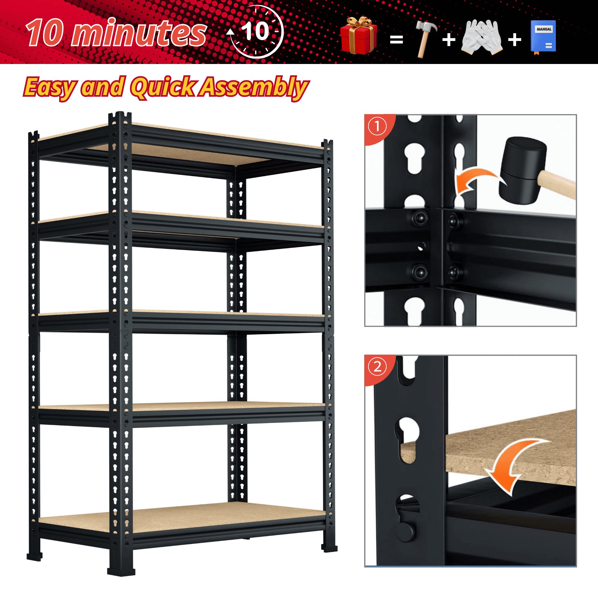 TrumanPick shelving unit is crafted to deliver the ultimate storage solution for every space in your home, blending endurance with modern design. This 5 tier adjustable metal storage shelving with upgraded MDF boards makes good use of vertical space for storage,making it suitable for various storage needs around the home, workshop, garage, pantry or closet. The additional crossbeams beneath the storage shelves further enhance stability and load-bearing capacity. The powder-coated frame of metal shelves resists rust for lasting durability. This garage shelving is assembled using peg-and-hole connections to help you easily adjust each shelf’s spacing and assemble. The upper and lower parts of the shelf can be separated and freely combined. These storage shelves can be assembled quickly without the need for nuts or bolts, making setup easy and hassle-free.