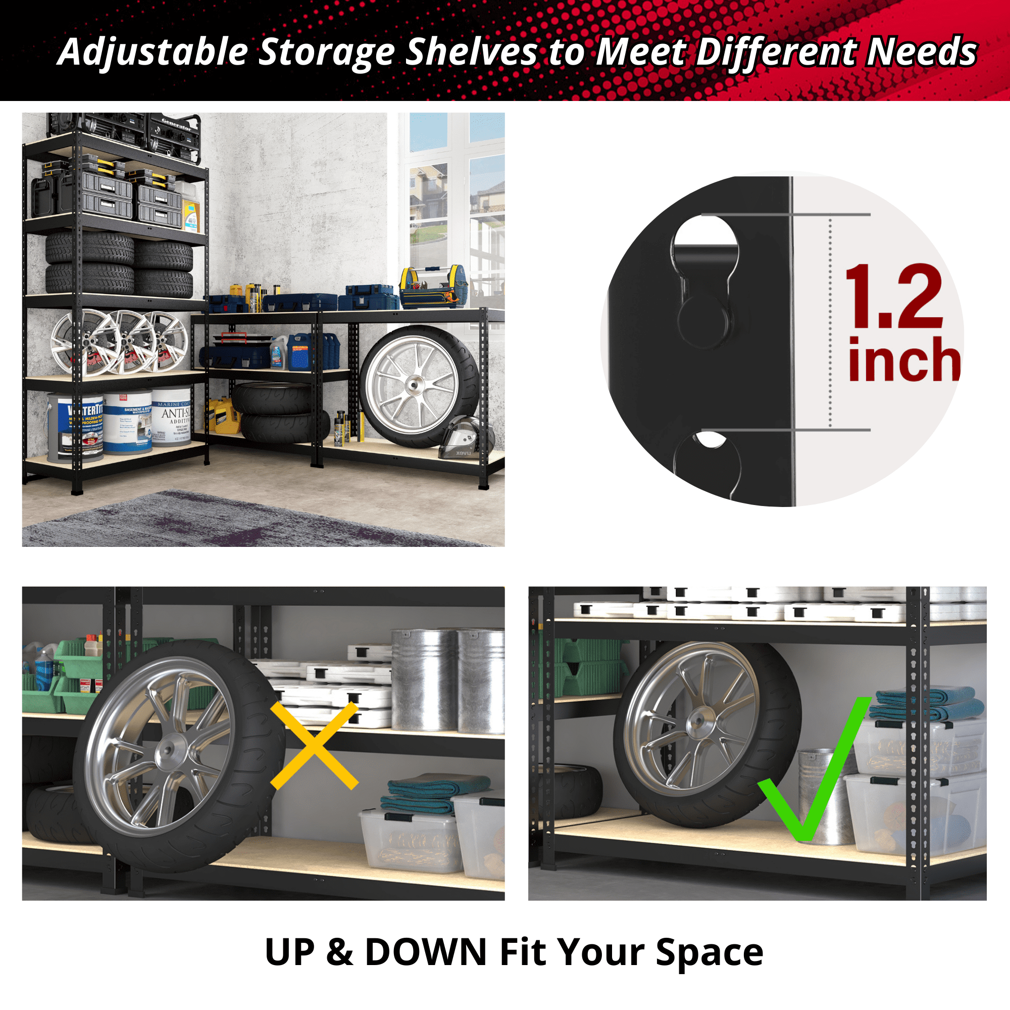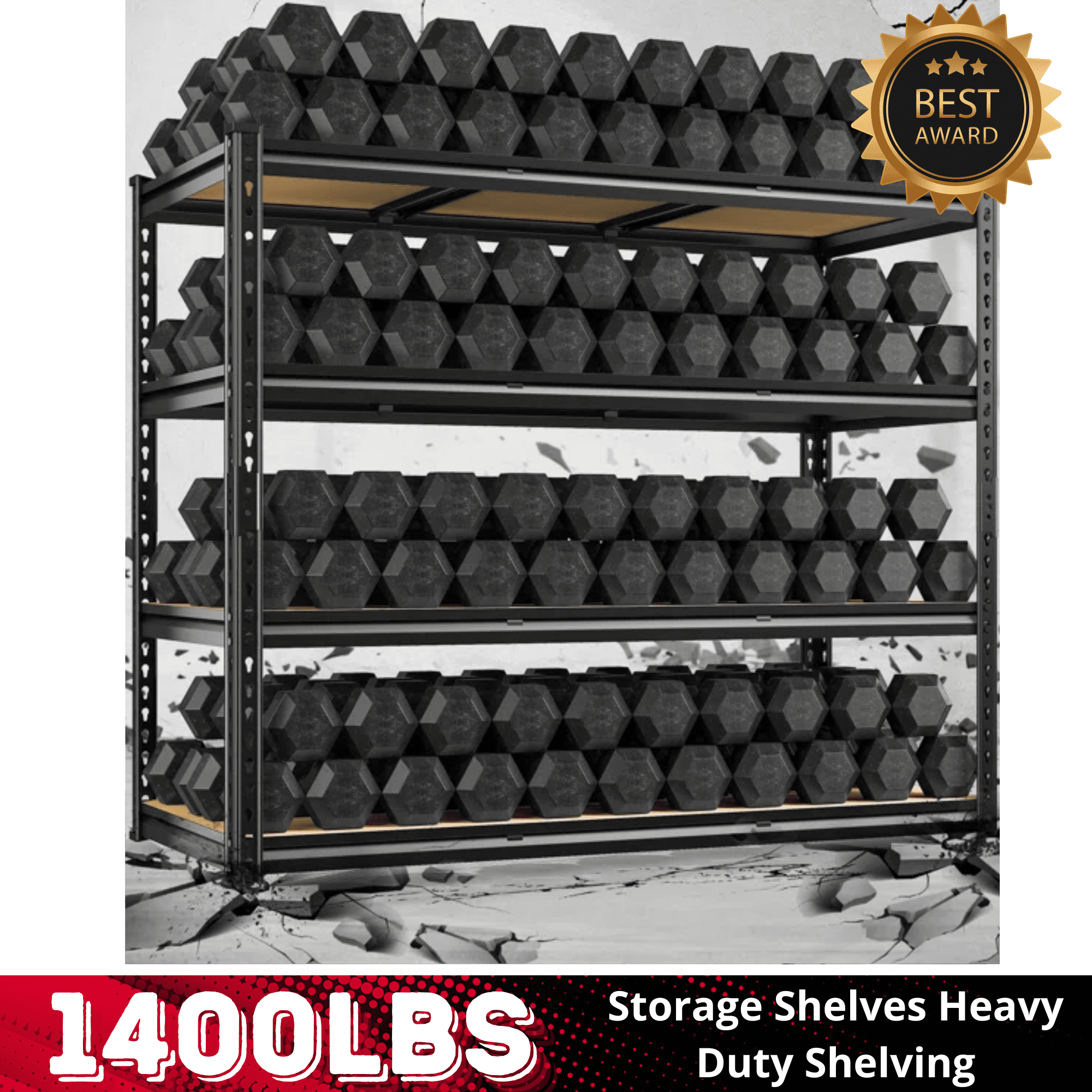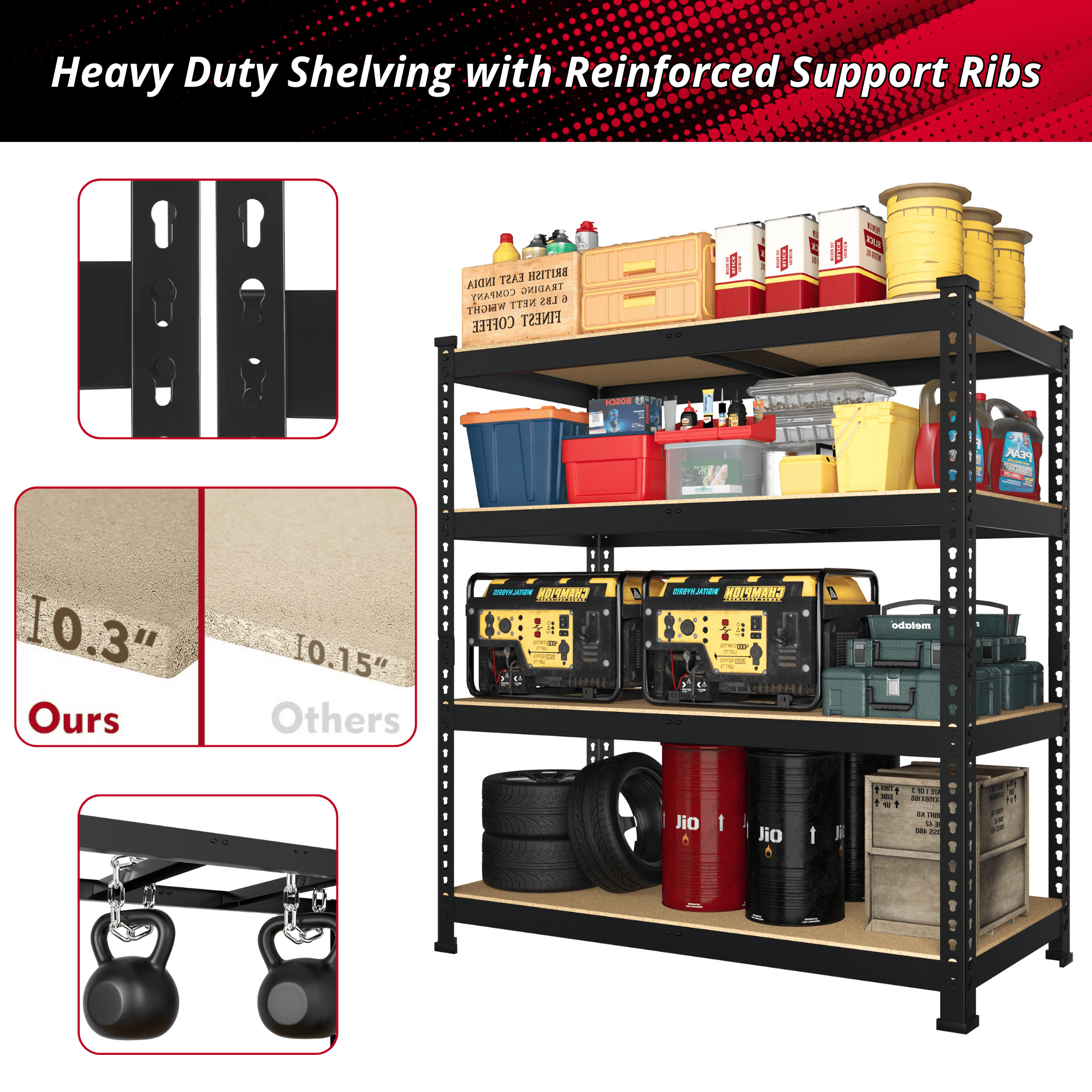 Overall Size: 36″W×16″D×54″H, 4 Tier WeightCapacity: 350 lbs Per Shelf, 1400lbs Total Frame Materiall: Metal Shelf Material: MDF(Medium-density Fibreboard) Metal Finishing Method: Powder Coating Shelving & Rack Feature: Adjustable Shelves/Free Combination Shelves Heavy Duty Garage Shelving 5-Tier Extra-Large Storage Space Adjustable Shelving Unit Flexible Assembly for Your Creativity 10 Min Easy Assembly Professional After-Sales Service