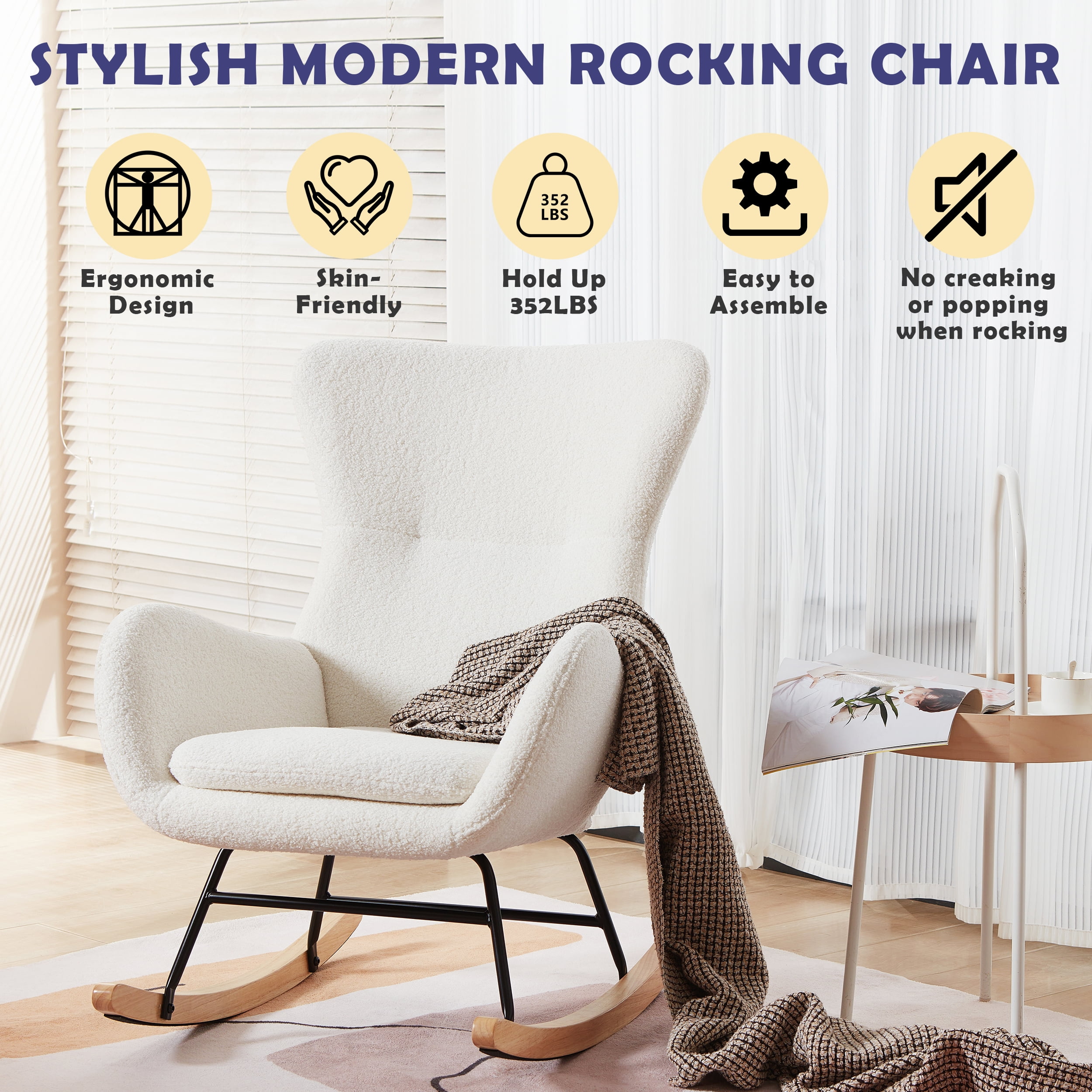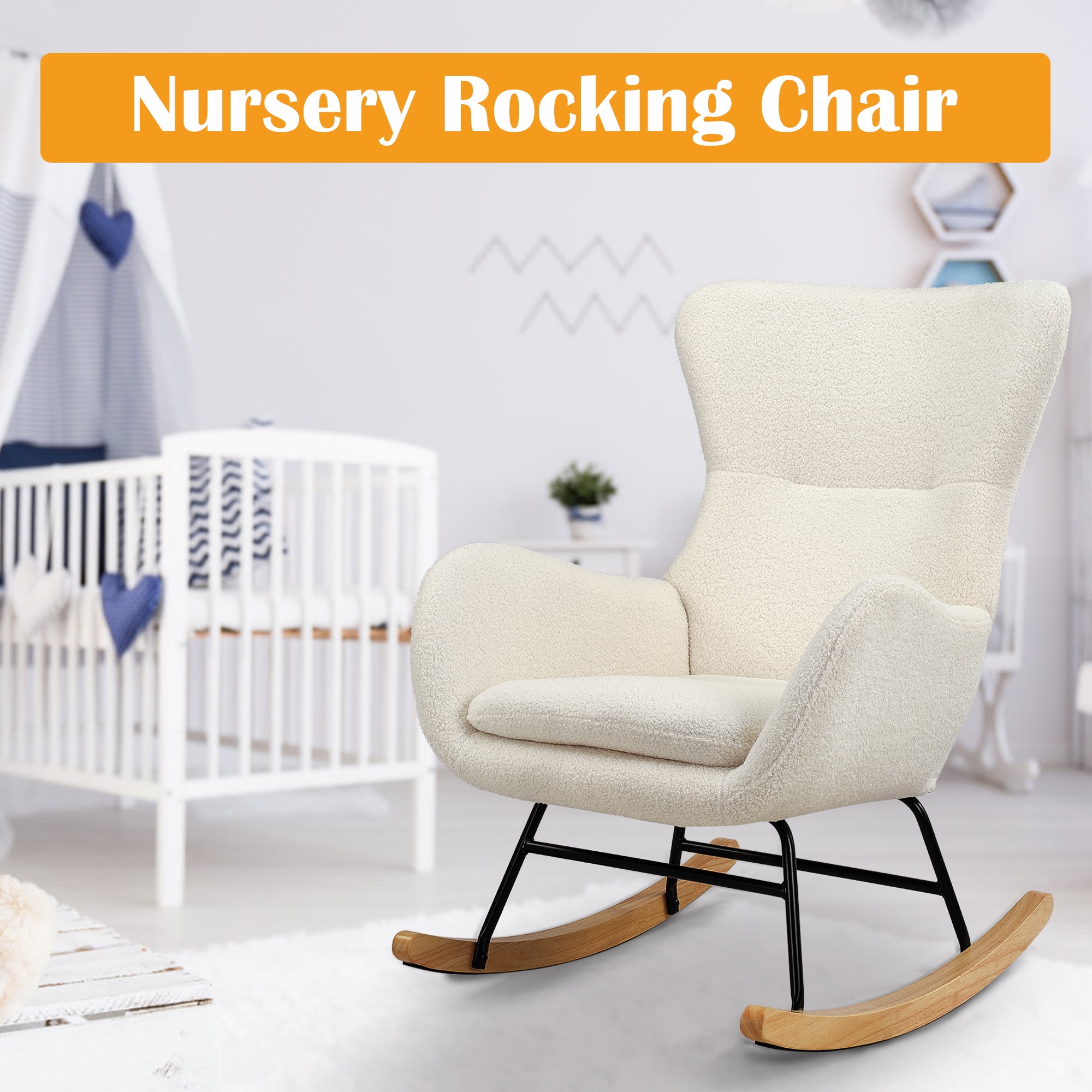 Ergonomic Wingback: The high wing backrest of this kids’ rocking chair is thoughtfully designed to provide excellent support, while the well-placed armrests ensure maximum comfort. The carefully chosen swing angle delivers ultimate relaxation and support, making it perfect for soothing both parent and baby during the rocking motion. Super Comfort And Soft: Covered in soft, breathable upholstery and filled with high-density sponge, this glider rocker chair combines durability, comfort, and style. Its plush cushioning ensures long-lasting comfort, while maintaining its beauty and functionality. Sturdy & Smooth Legs: Built with a robust steel and solid wood base, this nursery rocking chair offers a smooth and gentle rocking motion. Its calming effect makes it ideal for lulling a fussy baby to sleep or providing soothing relaxation for both parent and child. This comfy rocking chair guarantees excellent stability and supports up to 250 lbs. Overall Dimensions: 32″(L) x 26″(W) x 36.5″(H). Versatile & Stylish: Designed for both comfort and elegance, this rocker chair fits seamlessly into any room decor. Its stylish design and range of color options add warmth and sophistication to your space, making it a perfect addition to nurseries, living rooms, or bedrooms, reading room. Easy Assembly: With clear assembly instructions included, this living room rocker chair can be set up in just 20 minutes. If you encounter any quality issues or have questions about the product, feel free to contact us for a prompt and satisfactory solution. Product Description: Size: 32″ D x 26″ W x 36.5″ H Product Type: Nursery Rocking Accent Chairs for kids, baby Color: White Material:Wood Upholstered: Teddy Fabric Fill Material: Foam Back Style: Wing Back/High Back Arm Style: Round arms Surface Recommendation: Hard Floor Furniture base movement: Rock Maximum Weight: 250 Pounds Indoor/Outdoor Usage:Indoor Age Range (Description): Toddler,Kids, Baby Room Type: Living Room, Nursery Room, Bedroom, Reading Room. Package: 1 x Rocking Accent chair 1 x Tool bag 1 x Instruction: Assemble Manual