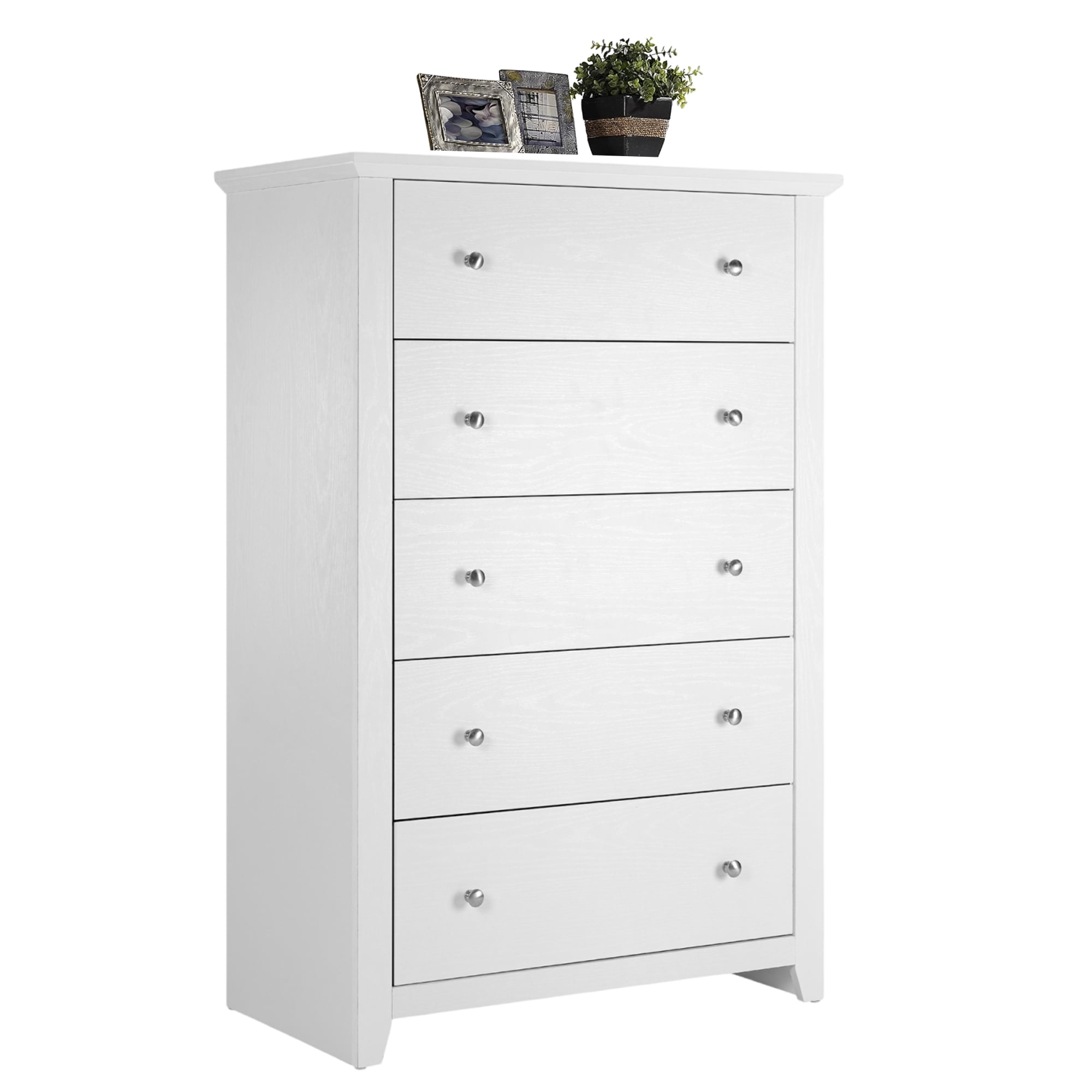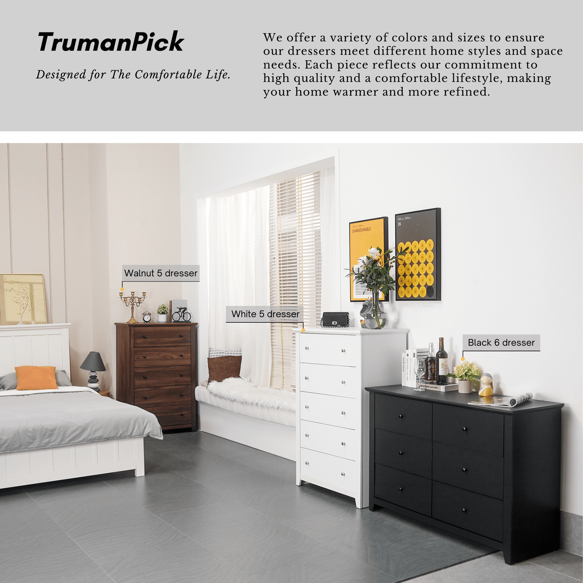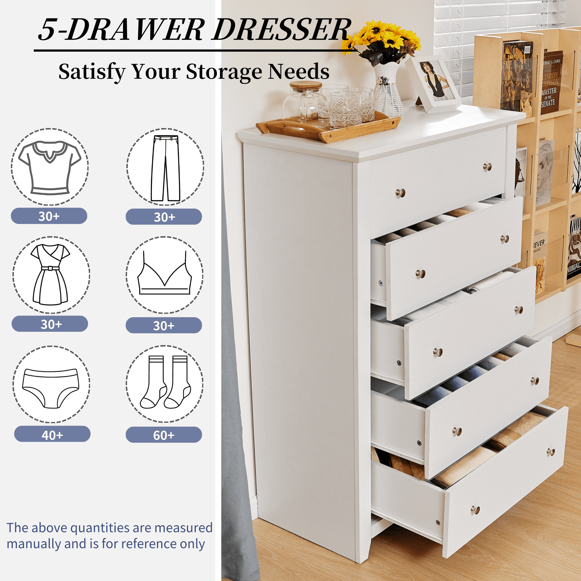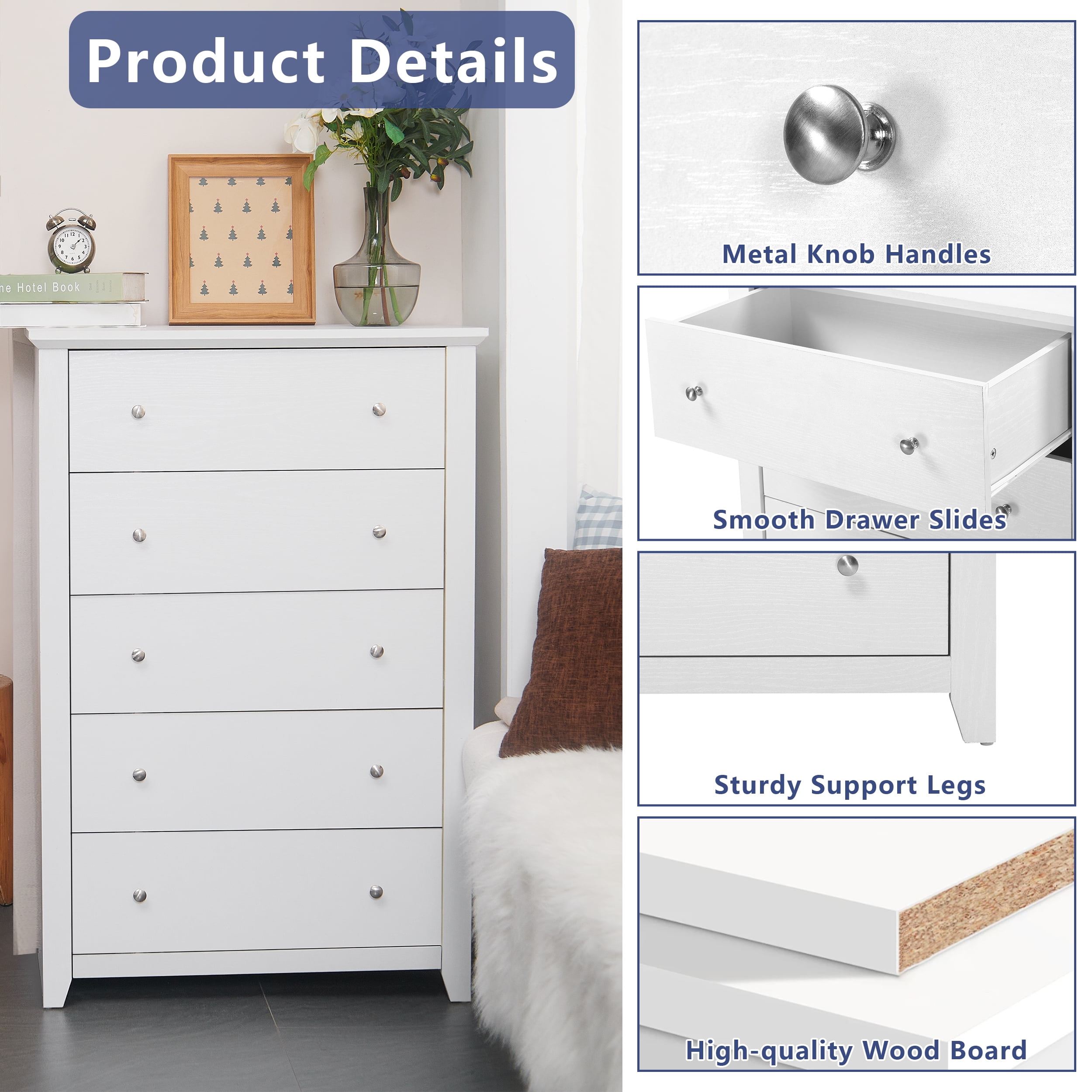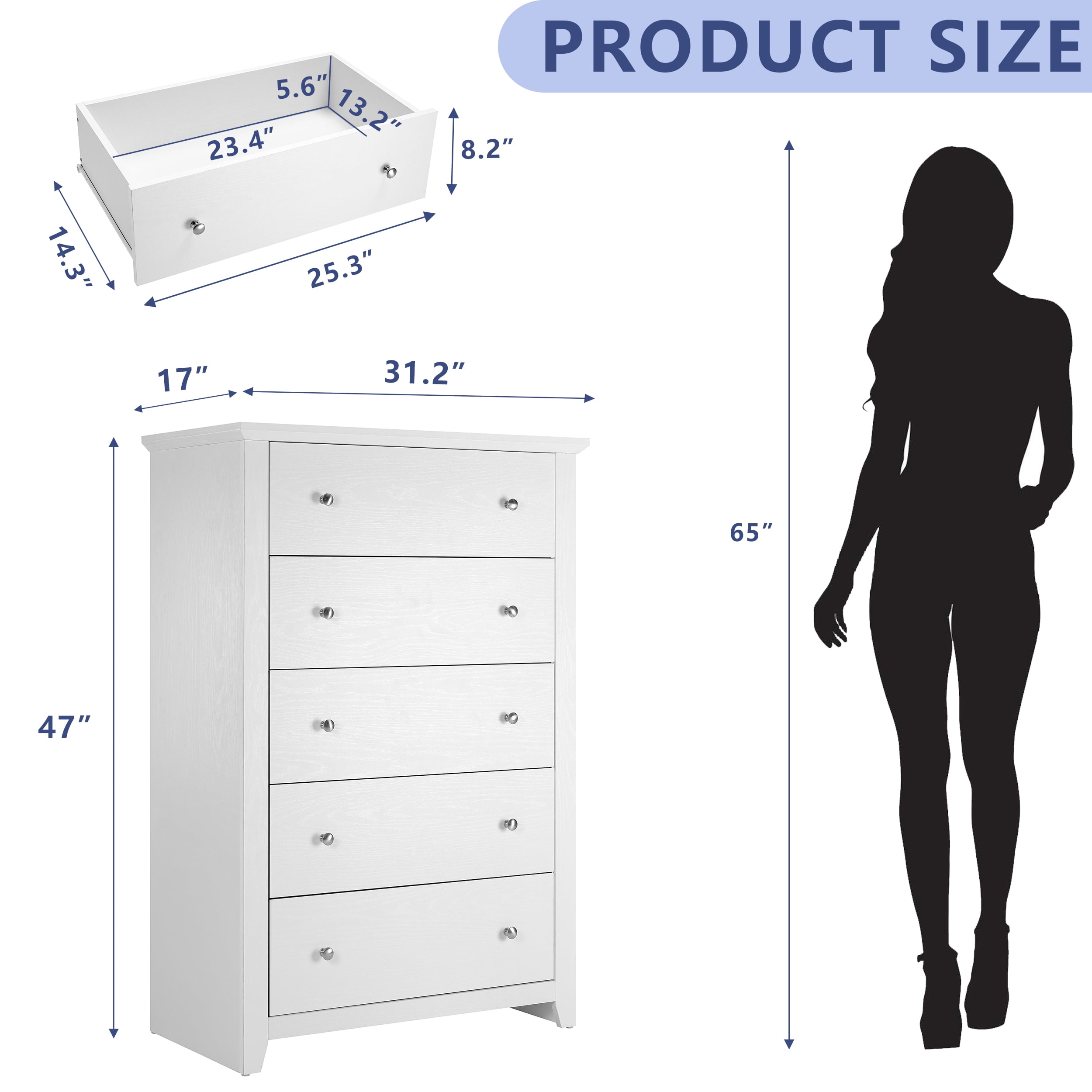 【Spacious Storage Space】With five large drawers, this white dresser provides ample space for classify clothes, cosmetics and other daily items, keeping your room tidy all the time. The spacious open tabletop serves as a great display area for decorative items and additional storage. 【Space-saving Design】The white bedroom dressers are expertly crafted to provide generous storage solutions while maximizing floor space efficiency. This wooden dresser is 31.2″D x 17″W x 47″H, ideal for small spaces like apartments and dormitories. 【High Quality Materials for Long-lasting】This chest of drawers is made from high-quality particle board certified by CARB P2 and TSCA, featuring a sturdy MDF back panel for added strength. The sturdy wooden frame is scratch-resistant, waterproof, and easy to clean. No feet design increases the stability and load-bearing capacity of the white storage cabinet. 【Versatile White Dresser】The modern dresser features a smooth metal sliding system, allowing drawers to open and close easily and quietly. As a space-saving solution, this 5 drawer white dresser meets your storage needs in the bedroom, living room, closet, hallway, entryway, nursery and family room. 【Anti-Tippling Device】This 5 drawer dresser comes with anti-tipping accessories to ensure the safety of your family, so you can have peace of mind. For better stability and years of reliable use, place lighter items on top and heavier items on the bottom. 【Classic Minimalist Aesthetic】One of the easiest matching wood storage cabinet with chic silver knobs complement any home décor. The classic look of this wood dresser for bedroom never goes out of style. 【EASY TO ASSMEBLE】 Click here link to watch the installation manual!TrumanPick 5 Drawer Dresser Installation Manual User-friendly instructions and included hardware make the dresser easy to assemble. For convenience and safety, we recommend two people install this dresser together. Quality customer service: Should you have any questions regarding the installation, product itself or the pieces, We will help you solve it within 24 hours @TrumanPick 【White Dresser Specification】 Material: E1 Grade MDF Wood, EPA-grade Particle board, High-quality Metal Number of Drawers: 5 Product Size: 31.2″L x 17″W x 47″H Drawer Dimension: 23.4″L x 13.2″W x 5.6″H Overall Product Weight: 91 lbs Package Contents: 1 x 5 White Drawer Dresser 1 x Accessory Kit 1 x Instructions Manual 【Explore More】 TrumanPick 5 Drawer Dresser Black Click Here TrumanPick 5 Drawer Dresser Walnut Click Here TrumanPick 6 Drawer Dresser Black Click Here TrumanPick 6 Drawer Dresser White Click Here