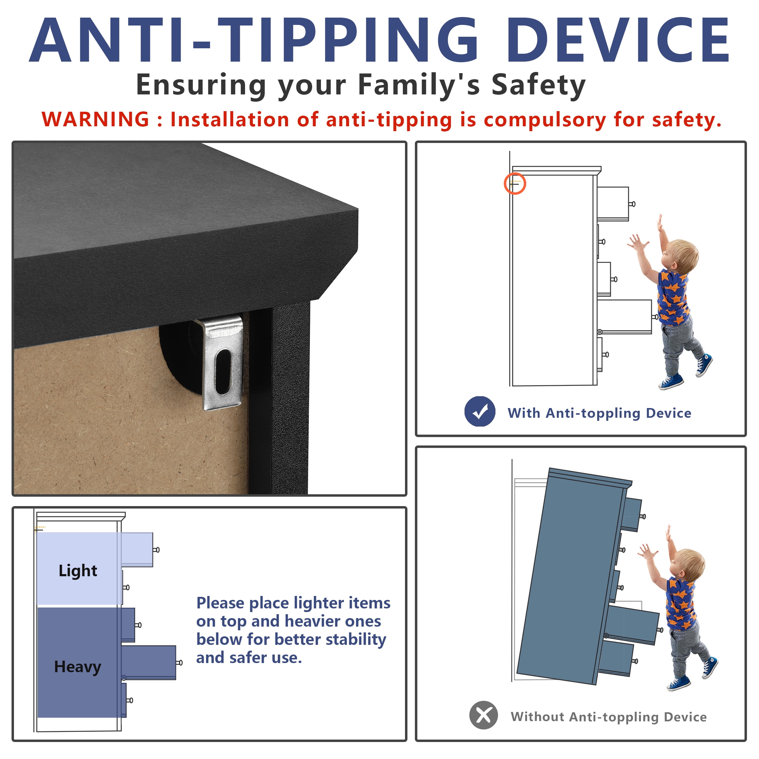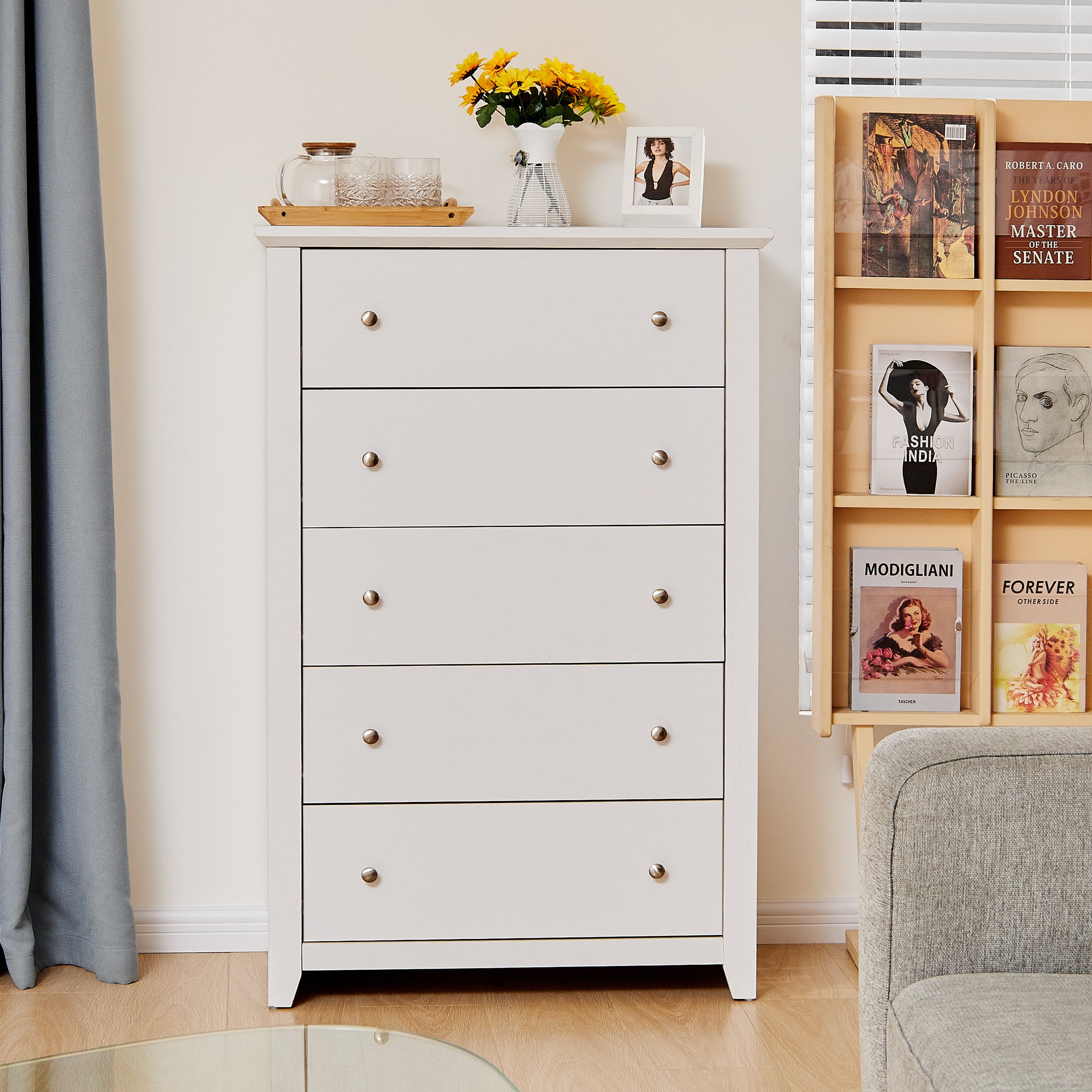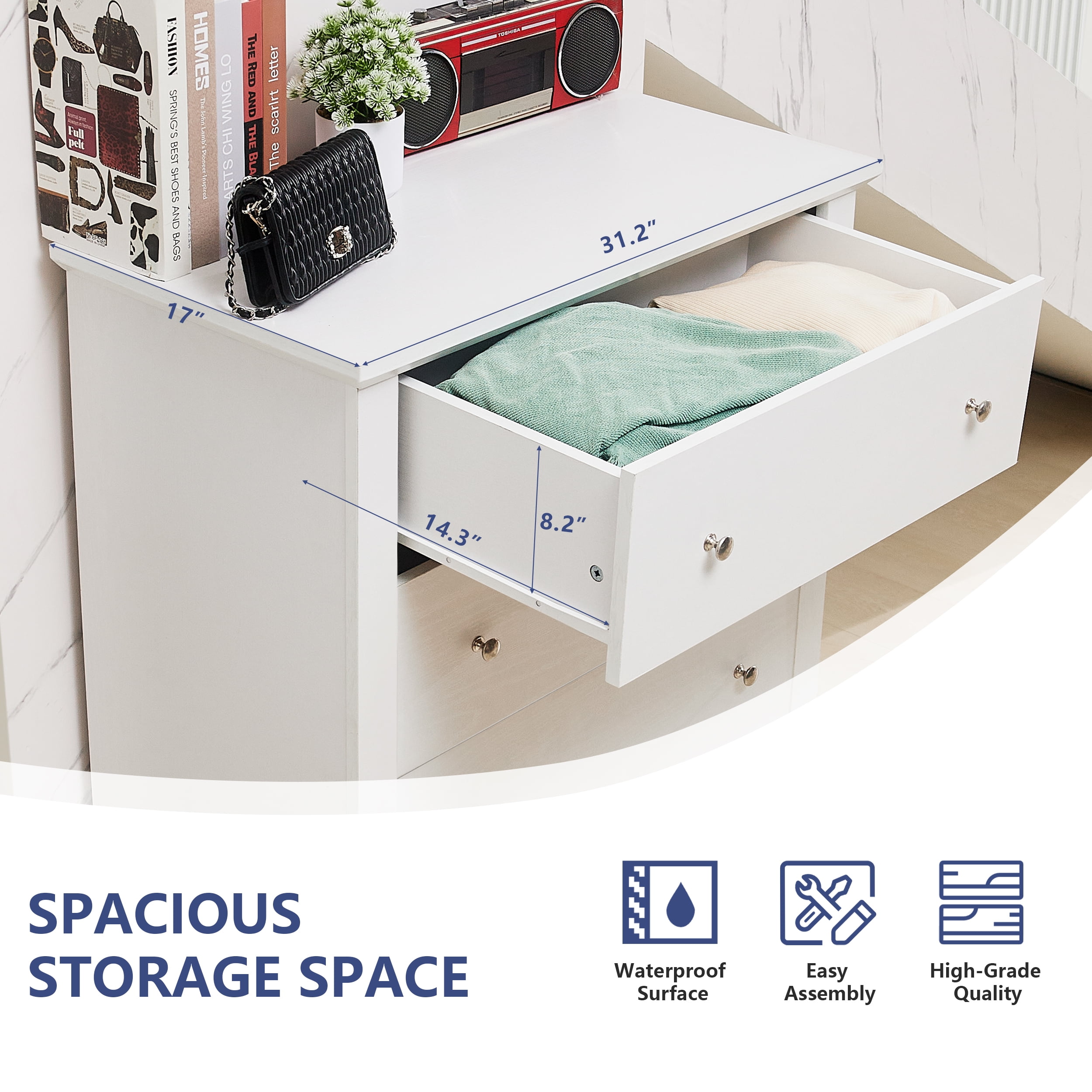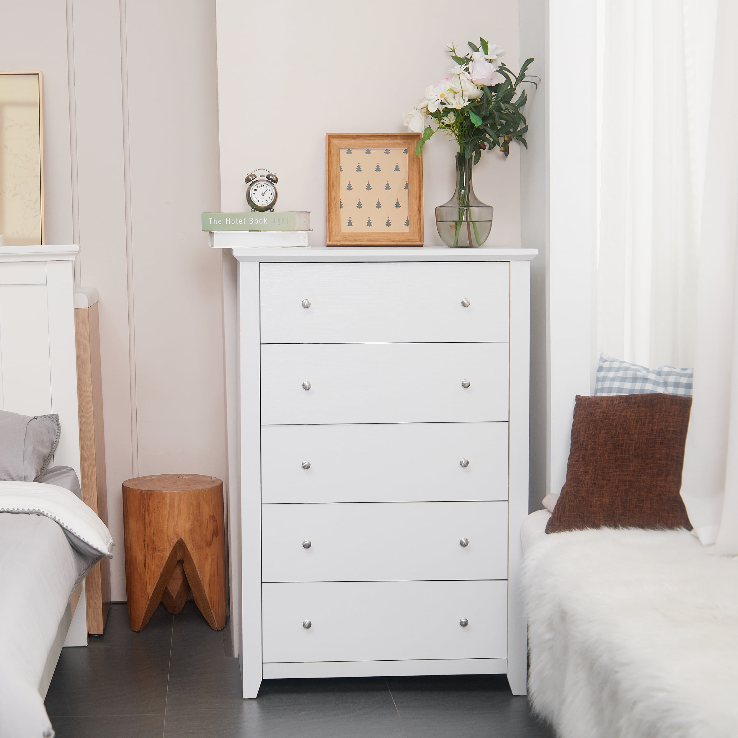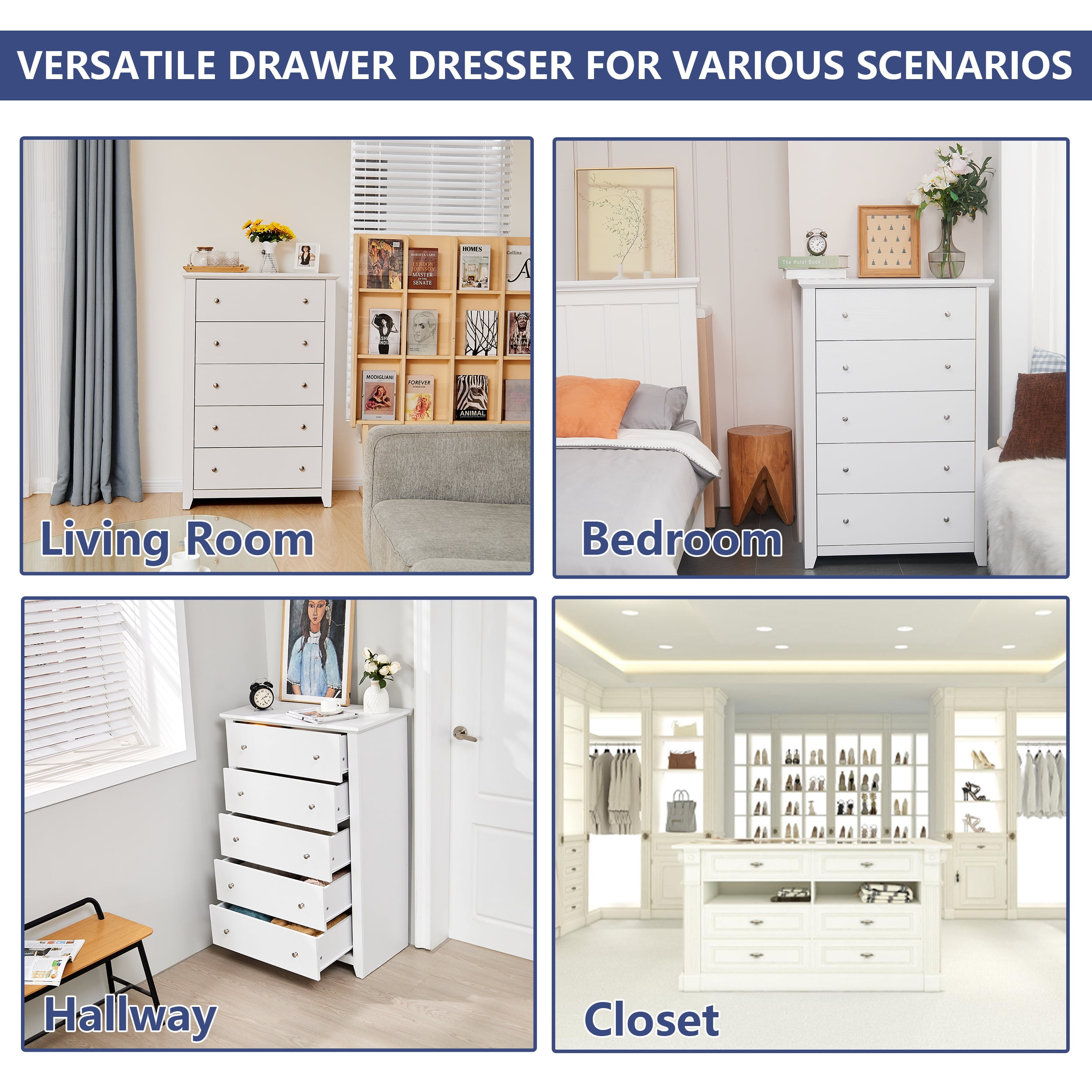 【Spacious Storage Space】With five large drawers, this white dresser provides ample space for classify clothes, cosmetics and other daily items, keeping your room tidy all the time. The spacious open tabletop serves as a great display area for decorative items and additional storage. 【Space-saving Design】The white bedroom dressers are expertly crafted to provide generous storage solutions while maximizing floor space efficiency. This wooden dresser is 31.2″D x 17″W x 47″H, ideal for small spaces like apartments and dormitories. 【High Quality Materials for Long-lasting】This chest of drawers is made from high-quality particle board certified by CARB P2 and TSCA, featuring a sturdy MDF back panel for added strength. The sturdy wooden frame is scratch-resistant, waterproof, and easy to clean. No feet design increases the stability and load-bearing capacity of the white storage cabinet. 【Versatile White Dresser】The modern dresser features a smooth metal sliding system, allowing drawers to open and close easily and quietly. As a space-saving solution, this 5 drawer white dresser meets your storage needs in the bedroom, living room, closet, hallway, entryway, nursery and family room. 【Anti-Tippling Device】This 5 drawer dresser comes with anti-tipping accessories to ensure the safety of your family, so you can have peace of mind. For better stability and years of reliable use, place lighter items on top and heavier items on the bottom. 【Classic Minimalist Aesthetic】One of the easiest matching wood storage cabinet with chic silver knobs complement any home décor. The classic look of this wood dresser for bedroom never goes out of style. 【EASY TO ASSMEBLE】 Click here link to watch the installation manual!TrumanPick 5 Drawer Dresser Installation Manual User-friendly instructions and included hardware make the dresser easy to assemble. For convenience and safety, we recommend two people install this dresser together. Quality customer service: Should you have any questions regarding the installation, product itself or the pieces, We will help you solve it within 24 hours @TrumanPick 【White Dresser Specification】 Material: E1 Grade MDF Wood, EPA-grade Particle board, High-quality Metal Number of Drawers: 5 Product Size: 31.2″L x 17″W x 47″H Drawer Dimension: 23.4″L x 13.2″W x 5.6″H Overall Product Weight: 91 lbs Package Contents: 1 x 5 White Drawer Dresser 1 x Accessory Kit 1 x Instructions Manual 【Explore More】 TrumanPick 5 Drawer Dresser Black Click Here TrumanPick 5 Drawer Dresser Walnut Click Here TrumanPick 6 Drawer Dresser Black Click Here TrumanPick 6 Drawer Dresser White Click Here