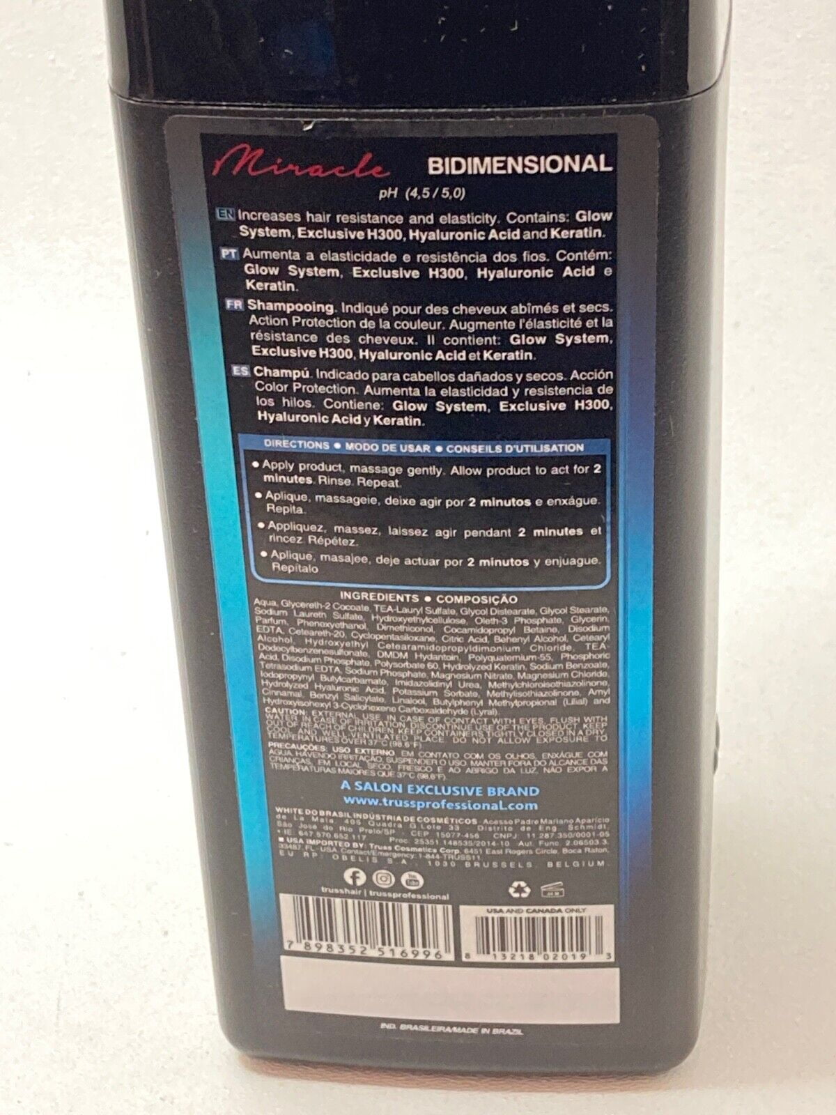 Truss Miracle Bidimensional Shampoo 33.81 Oz. Miracle Bidimensional Professional Truss Shampoo with pH (4.5-5.0) versatile and highly efficient, gentle and advanced formula.|Indicated to be used in the most diverse needs of the day to day Beauty Salon.|Active:Glow System: Intelligent technology asset that delivers extraordinary gloss in 3D effect gloss, nourishes and protects color