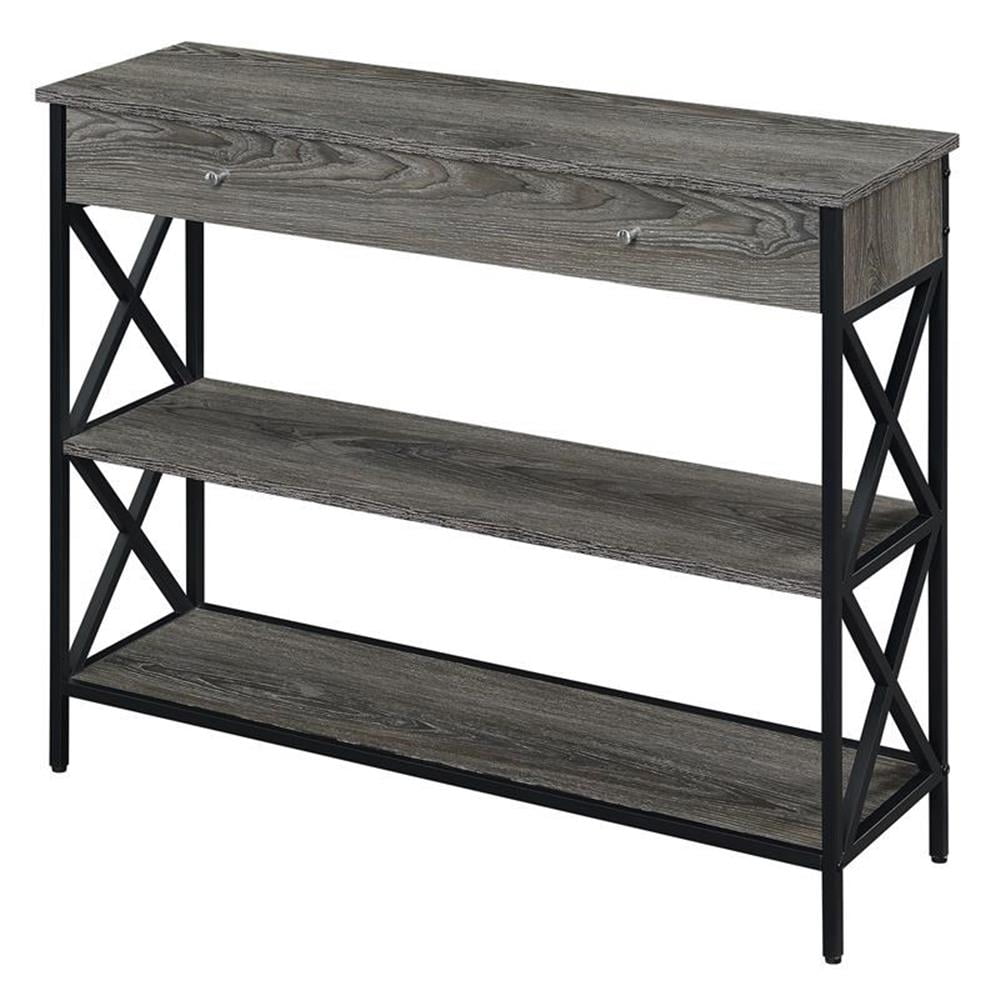 Tucson 1 Drawer Console Table, Weathered Gray Upgrade your living space with the modern touch of the Tucson 1 Drawer Console Table by Convenience Concepts. Featuring a pull-out drawer perfect to stow away keys, entertainment essentials and more. This table also includes generous top surface space, a middle shelf, and a bottom shelf. Ample space provides additional space to display decor, collectibles, and even books. The black crisscross frame is sure to make a statement in any room in your home. Available in a variety of finishes, this table is crafted from particle board and powder coated metal for long term use. Shop coordinating pieces from the Tucson Collection by Convenience Concepts, each sold separately. Specifications: Featuring a pull-out drawer perfect to stow away keys, entertainment essentials and more Part of the Tucson Collection Available in Multiple Finishes 1 Drawer for Concealed Storage Bottom Shelf for Additional Storage