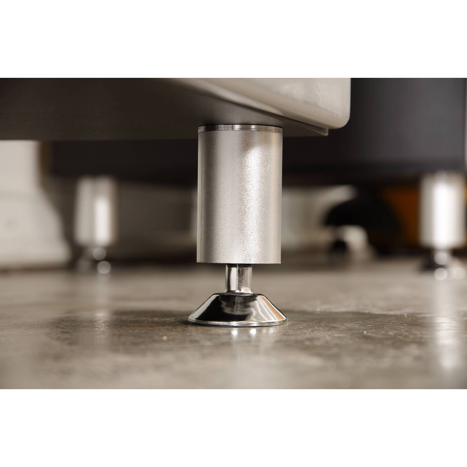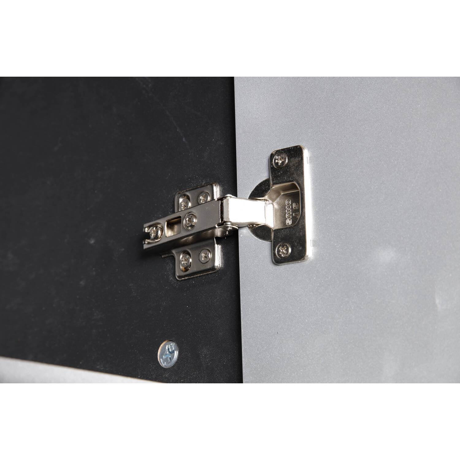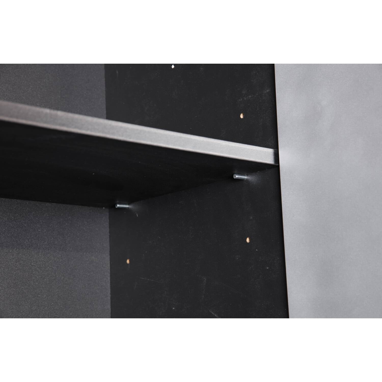Materials: Paper laminate wood Finish: Black with silver metallic fronts Durable black vinyl laminated cabinet resists scratches and stains. Attractive aluminum extruded and adjustable feet keep cabinet above the floor and free from water and road grime. Oversized, industrial style aluminum pulls are both attractive and easy to access. Two attractive painted doors with soft closing European hardware. One adjustable or removable shelf to maximize your storage options. Three sturdy drawers with solid medium density fiberboard laminated bottoms. Tough steel, ball bearing full extension drawer guides. Three molded drawer fronts painted with high gloss metallic paint.