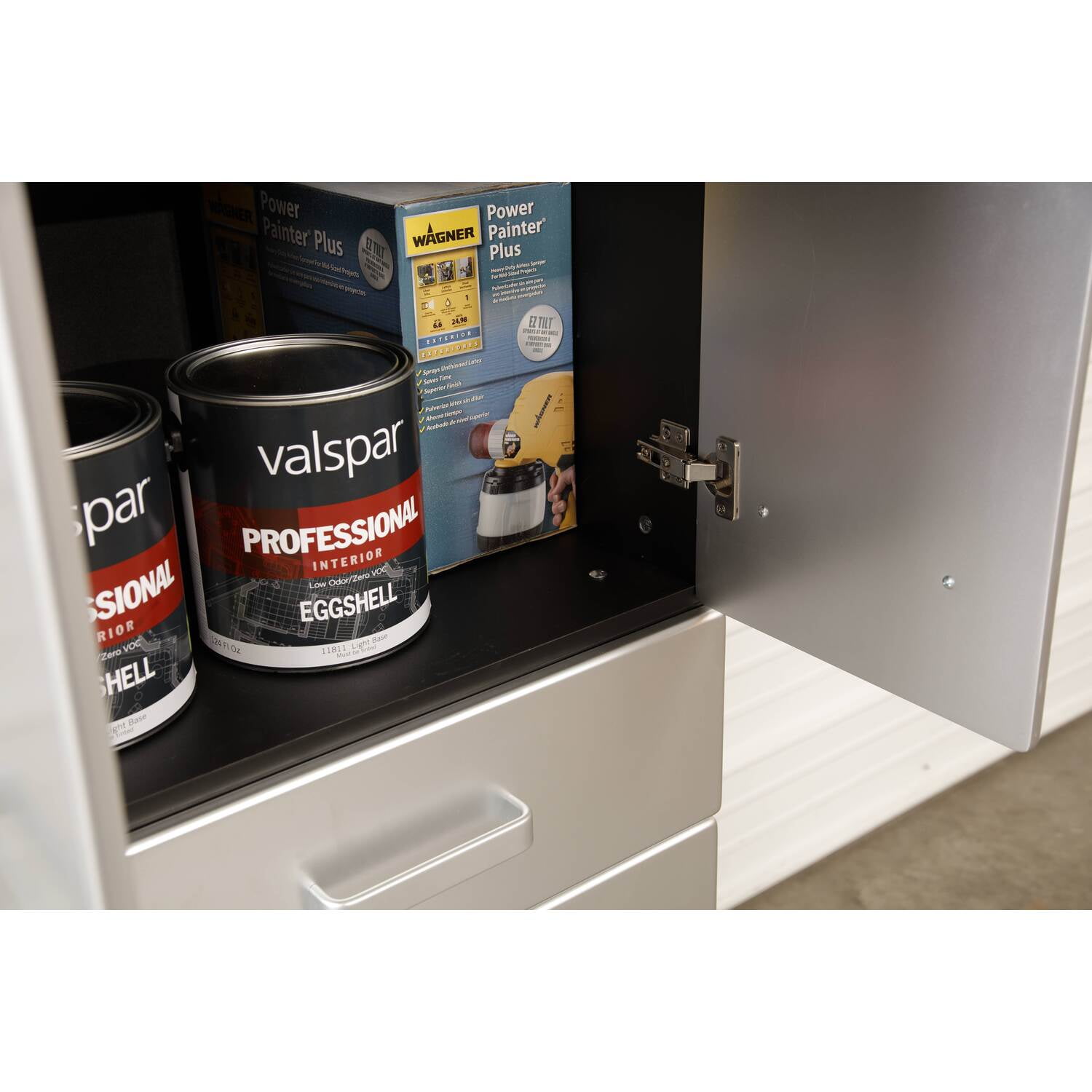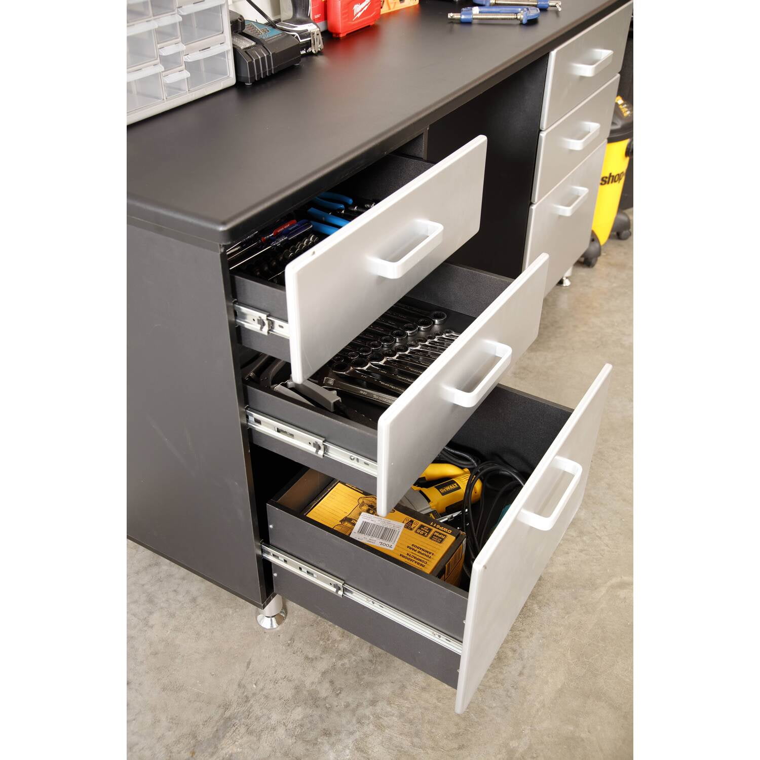 The Tuff-Stor Garage Storage Cabinet combines versatility, durability, and attractive design to create a clean and organized storage system. With two sturdy shelves measuring 22 inches wide by 19 inches deep you will be able to store almost everything, even larger items. One of the shelves is removable or adjustable. Since many garage floors are not totally level, each item comes with four attractive aluminum extruded and adjustable feet that elevate and allow you to level your system and keep it safe from water and road grime. The oversized, industrial aluminum door pulls are both sturdy and easily accessed. The doors are painted with an attractive silver, metallic finish. The three drawers feature metal ball bearing full extension slides and a solid medium density fiber board bottom. Features : Materials: Paper laminate wood Finish: Black with silver metallic fronts Durable black vinyl laminated cabinet resists scratches and stains. Attractive aluminum extruded and adjustable feet keep cabinet above the floor and free from water and road grime. Oversized, industrial style aluminum pulls are both attractive and easy to access. Two attractive painted doors with soft closing European hardware. One adjustable or removable shelf to maximize your storage options. Three sturdy drawers with solid medium density fiberboard laminated bottoms. Tough steel, ball bearing full extension drawer guides. Three molded drawer fronts painted with high gloss metallic paint. Specifications : Product Dimensions : 70.75″H x 23.5″W x 21″D Product Weight : 128 lbs