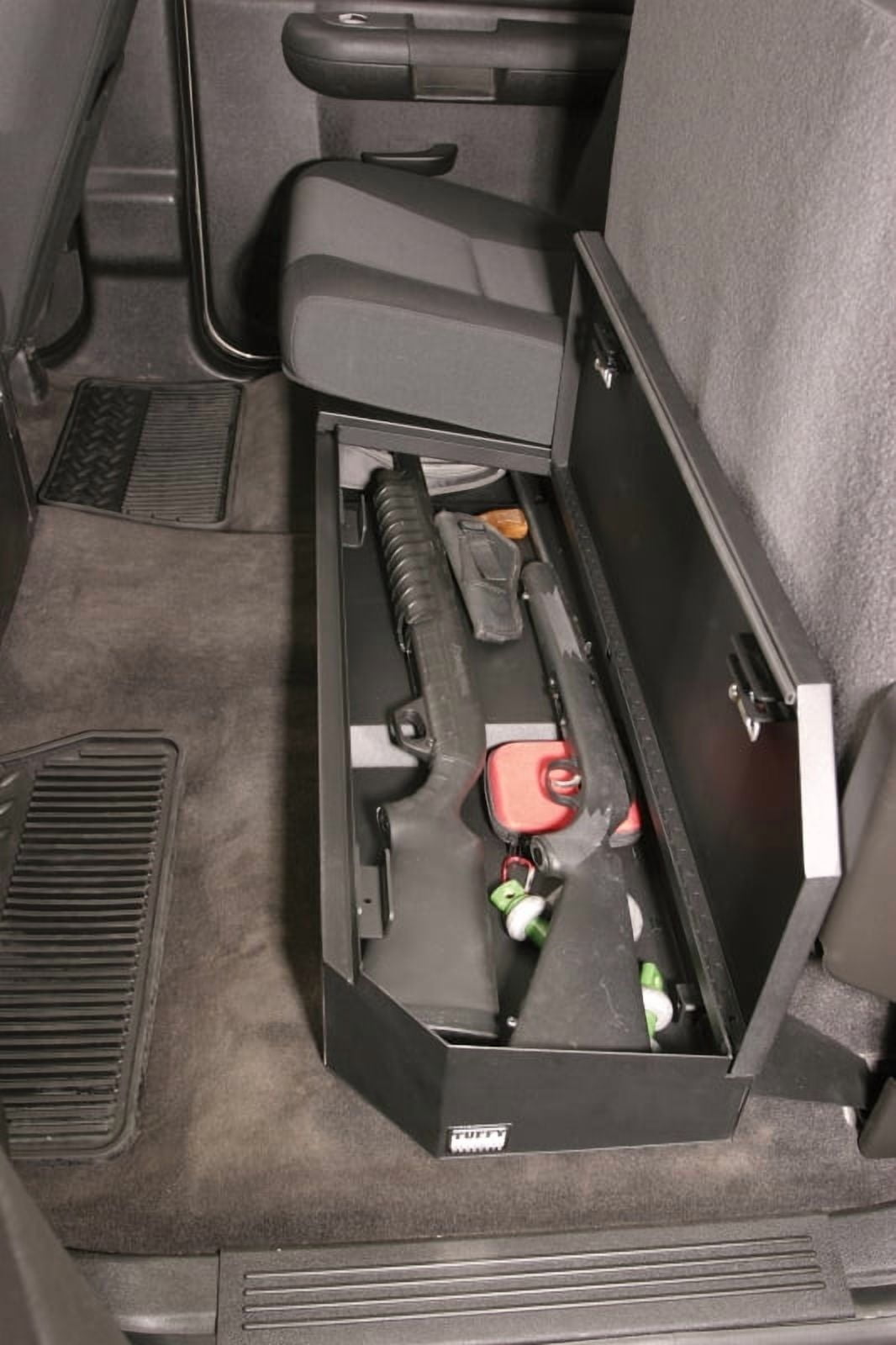 This high security 16 gauge steel security lockbox mounts under the rear seat in a GM Crew Cab Truck. The full width formfitting design of the Tuffy lockbox has over 3500 cubic inches of lockable storage. It’s secured contents are easily accessed by flipping either or both of the rear seat(s) up and opening the corresponding lid(s). The unique design allows the full width to be used to stow firearms or other long items. Featuring Tuffy’s Pry-Guard Locking System with a 10 tumbler double bitted security lock with built in weather seals. Chamfered corners are incorporated into the design for easier passenger access. The innovative mounting system is only accessed from inside the box. When additional floor space is needed the entire lockbox can be removed in seconds without the need for any tools.