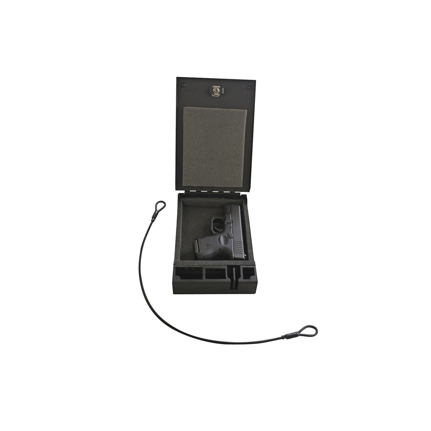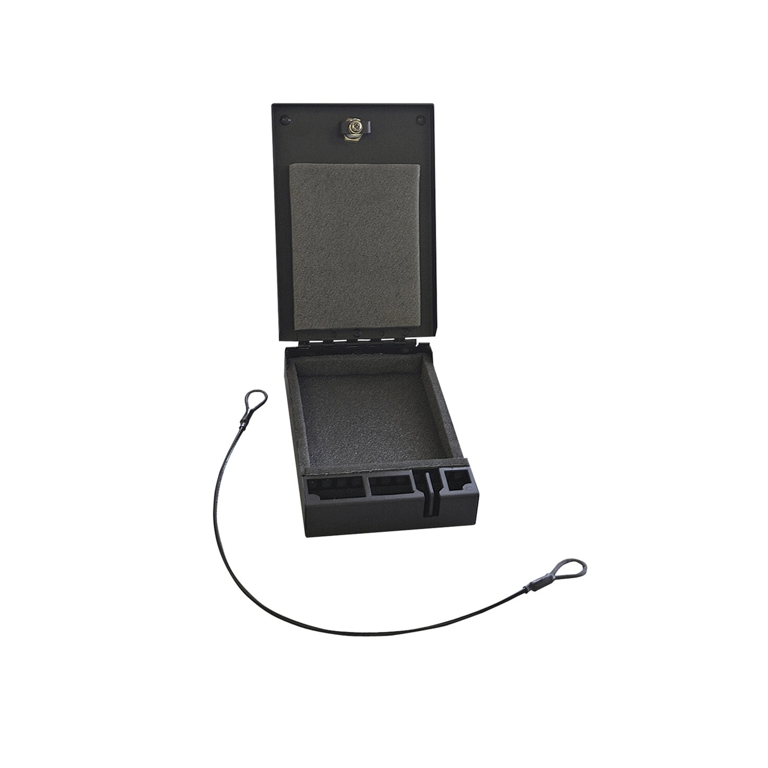 Weighing less than 3 lbs., this lockable welded steel storage box can be used to secure a firearm and protect valuables while carrying it by hand between locations, during travel, inside a vehicle, home or office. Keyless entry is provided by Tuffy’s 3 digit combination lock with a two-point steel cam for added security. The included 2 ft. long, 2000 pound test, steel security cable secures the safe to any sturdy mounting surface by attaching to the 1/8 inch steel security cable anchor point. The inside is lined with low-density foam to protect the contents, while compression bumpers keep the lid vibration-free when closed.