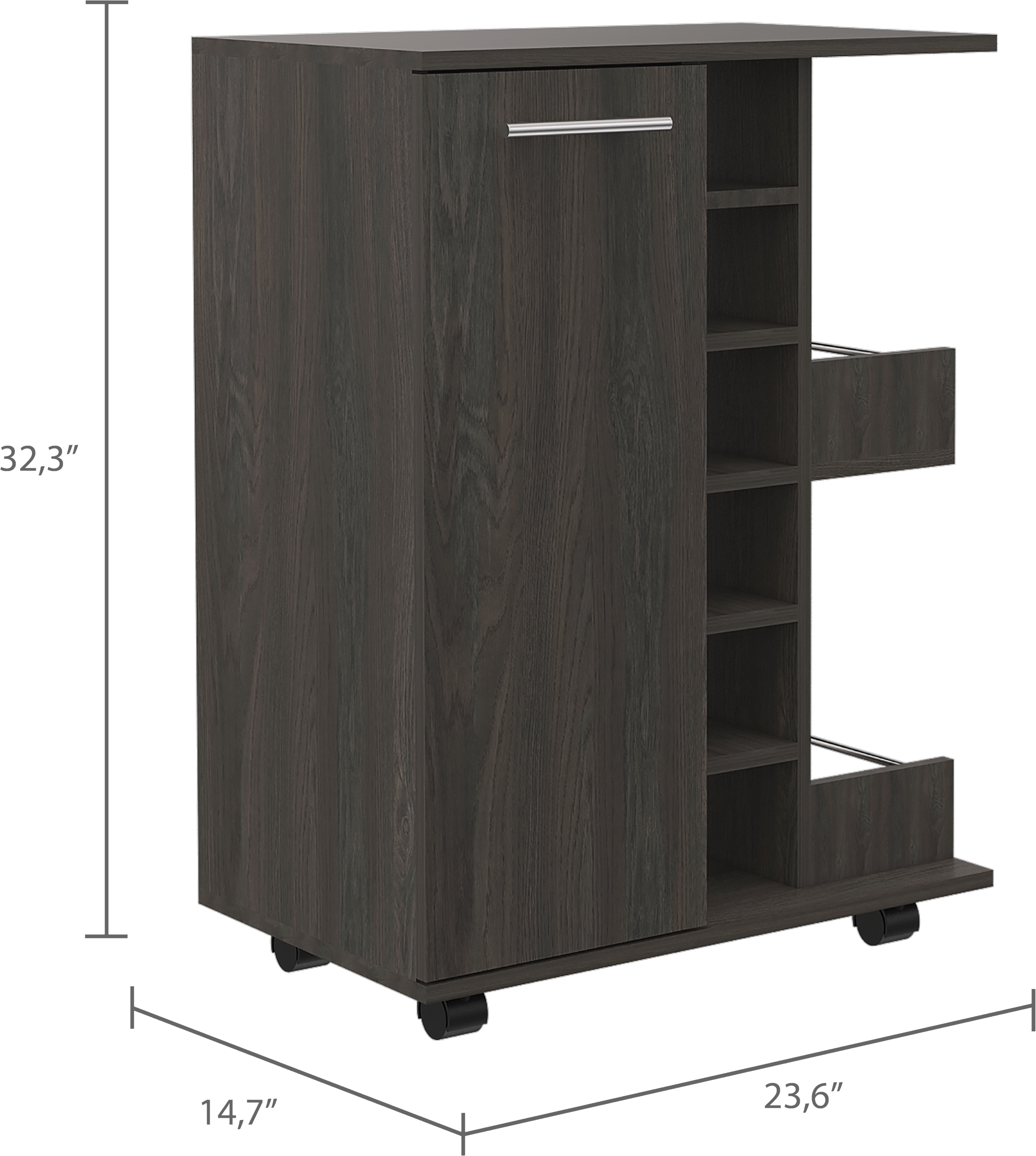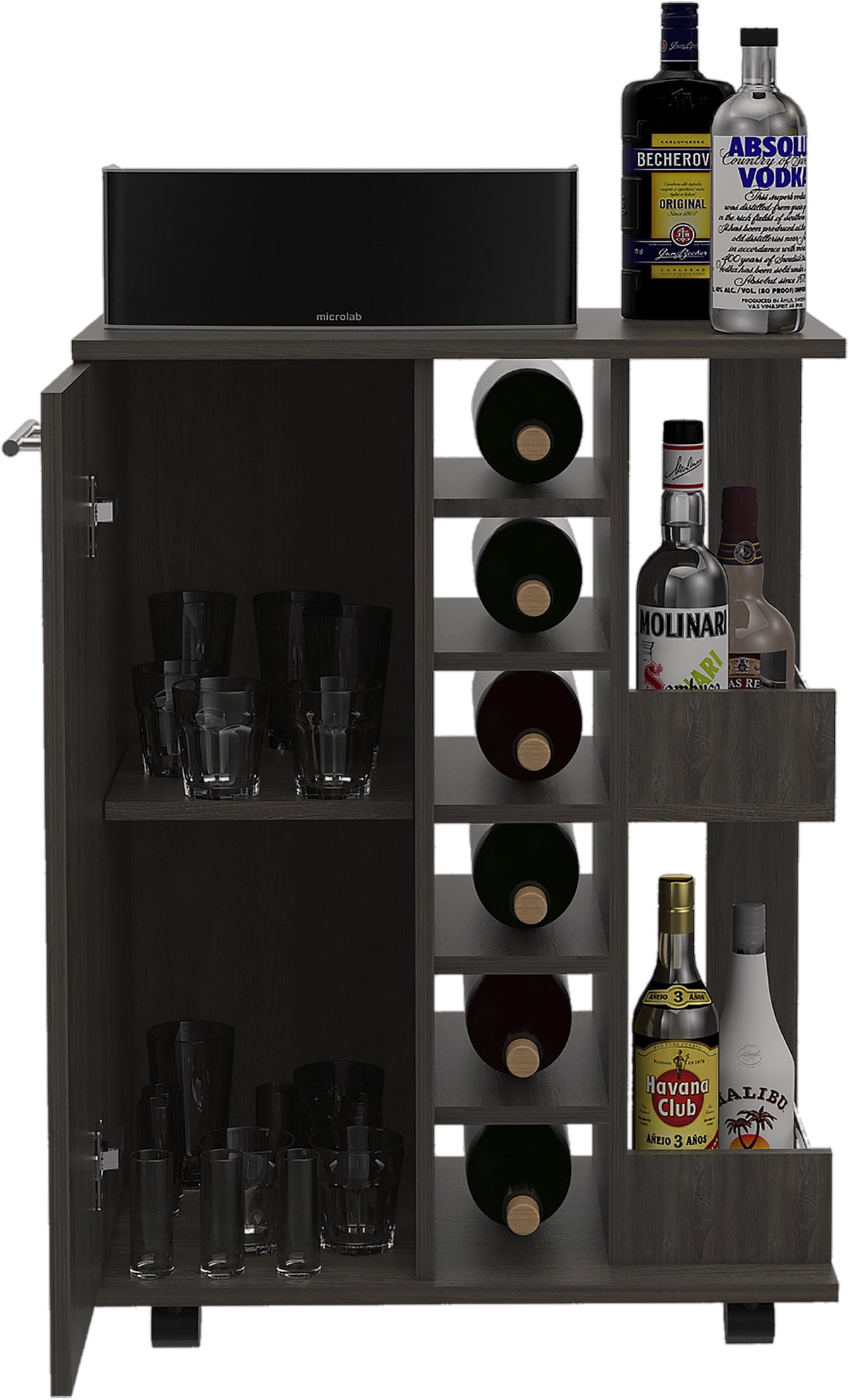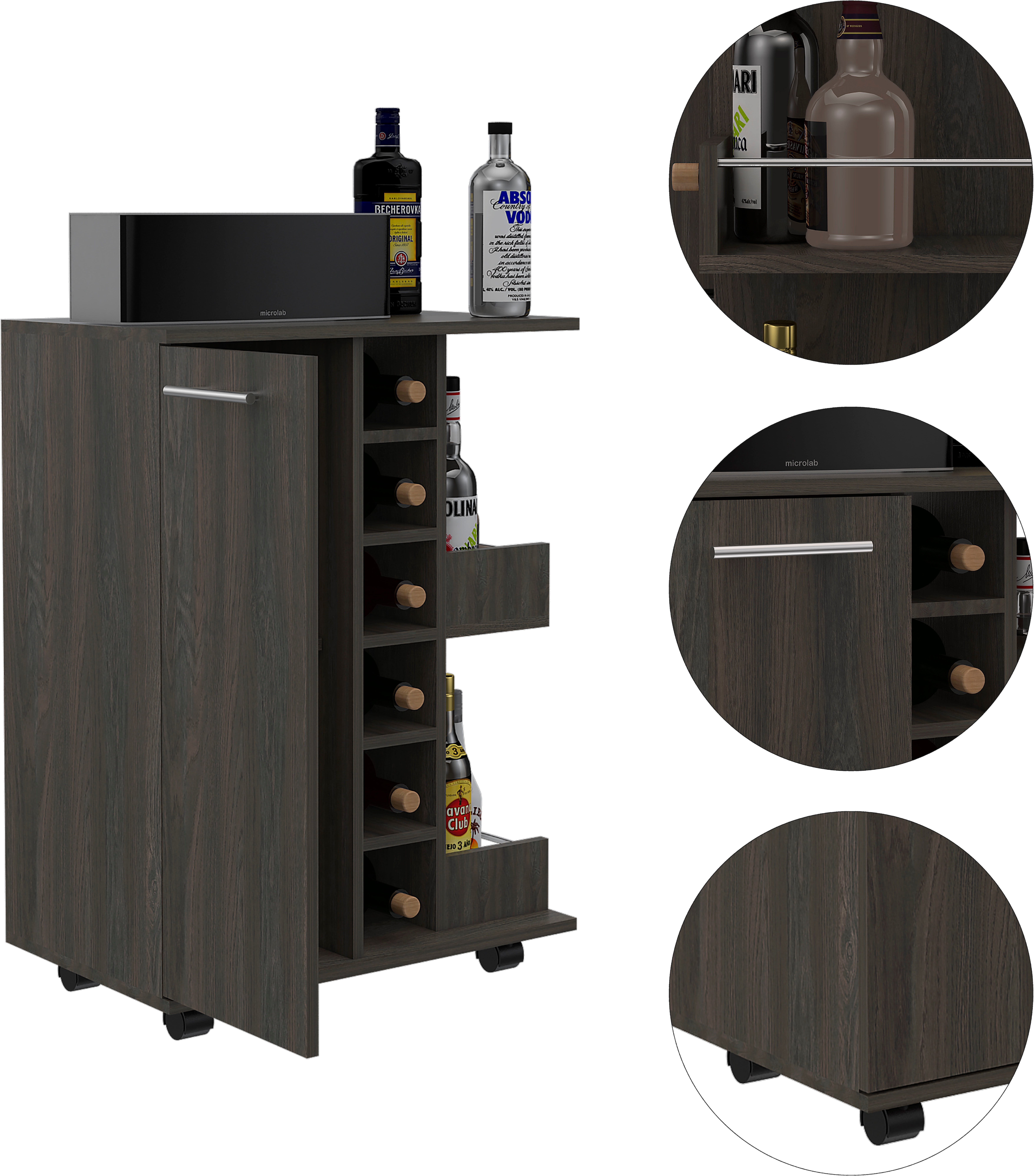 The top counter space is perfect for preparing and serving drinks for you and your friends Perfect for preparing cocktails and displaying your favorite bottles of wine and liquor 6 cubbies that line the center of this bar cart to store wine bottles or liquor bottles elegantly Open shelves and a spacious cabinet for storage and display