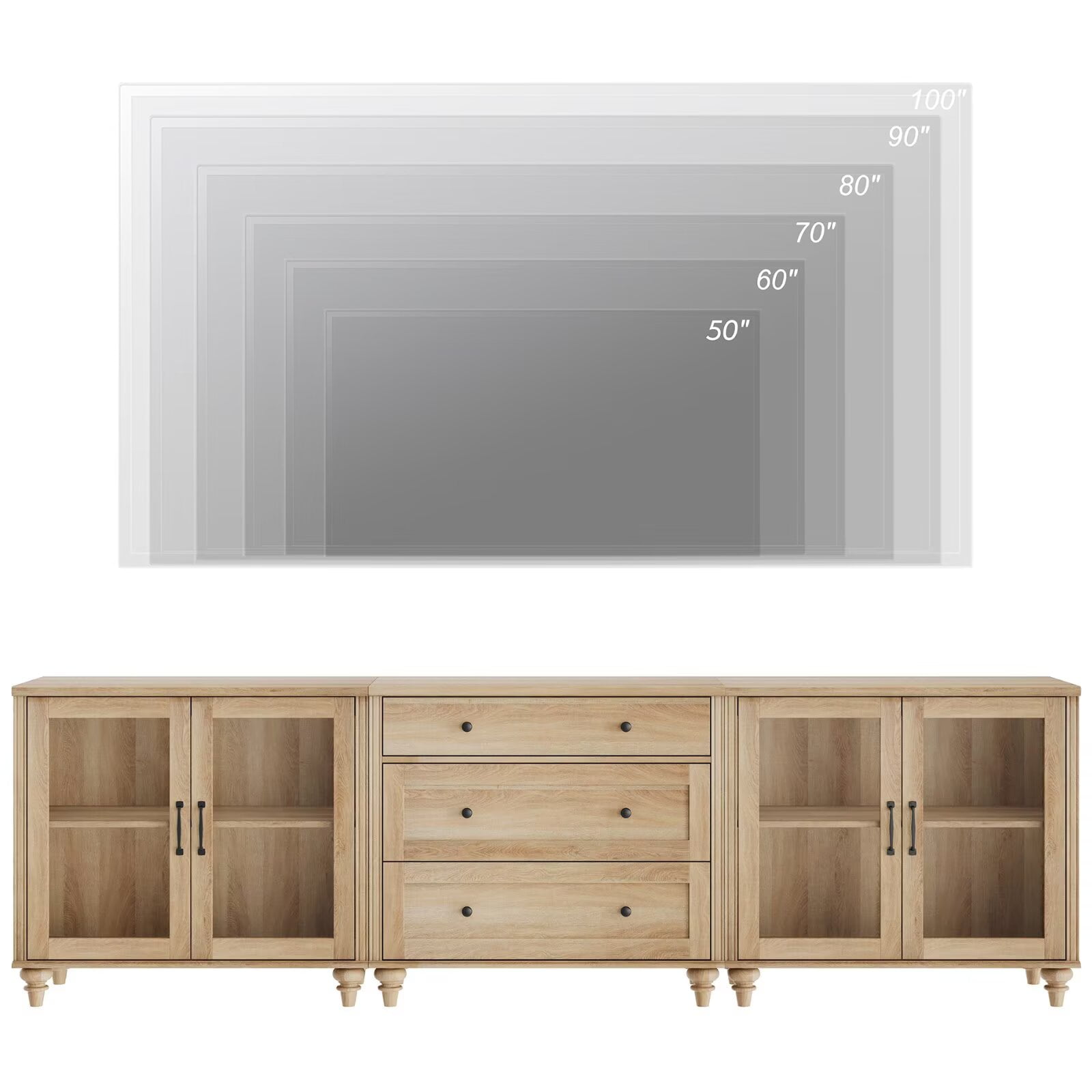 TV Stand for 100-Inch TV, 3-in-1 TV Console Table for 75/80/85/90-Inch TVs, Entertainment Center with Glass Door & Drawer, Oak Kitchen Sideboard Buffet Cabinet for Dining Room
