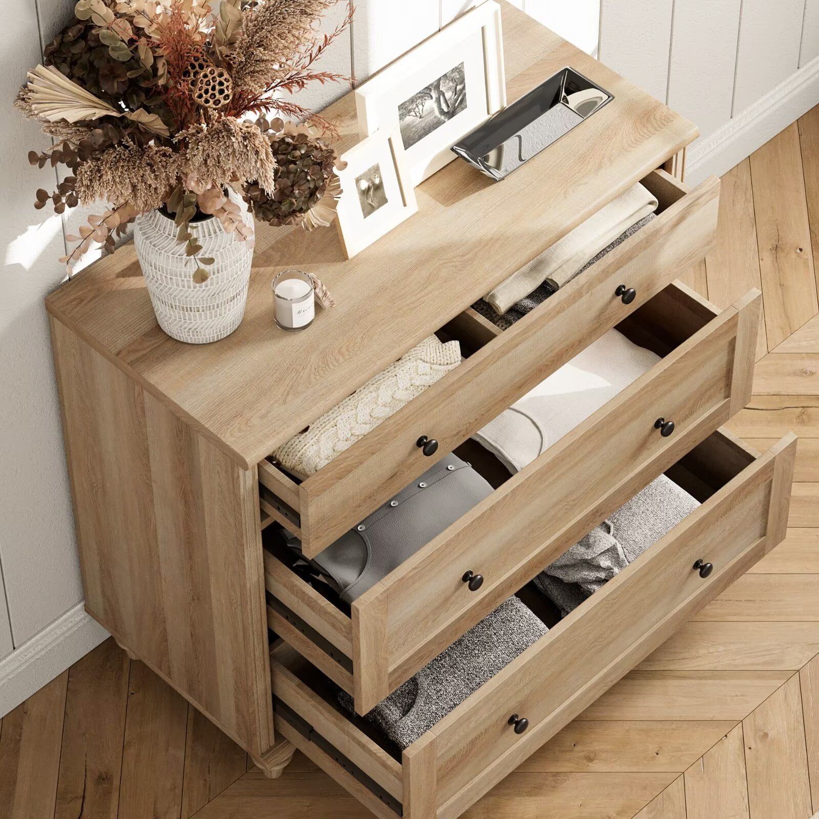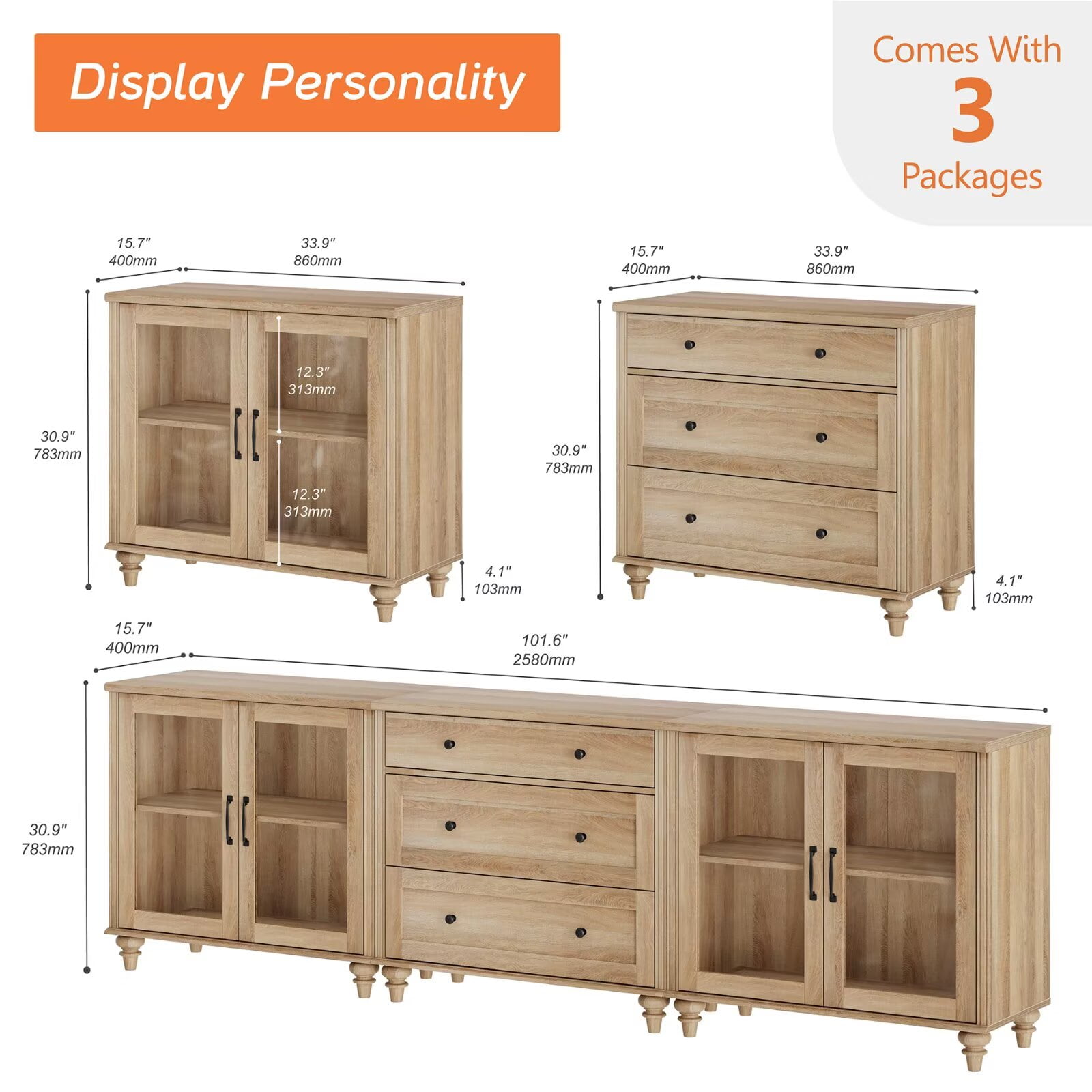【3-in-1 Multipurpose TV Cabinet】The 3-in-1 large tv stand can be used separately as two glass cabinets and one dresser. In addition to entertainment center, it can be placed in the dining room as a kitchen buffet cabinet or in the entryway as a console table. Dimension of Glass Cabinet: 33.9″×15.7″×30.9″(L×W×H). Dimension of Dresser: 33.9″×15.7″×30.9″(L×W×H). They are sent separately in three packages, so you may receive them at different times. 【Elegant & Stylish Appearance】Featuring oak distressed wood surface and mid century style, the tv stand for 100 inch tv is a perfect choice to add a touch of high-end and elegant charm to your room. It will be harmoniously coordinated with any home style and show your great taste. 【Adjustable Shelf & Glass Door】Designed with height adjustable shelf, you could manage the storage space according to the item size. It maximizes the available space of the room while providing functional storage. Additionally, the transparent tempered glass door of the oak tv stand make it easy for you to find items you need. 【Stable Frame & Use-friendly Detail】Combining high quality materials with exquisite craftsmanship, this coffee bar cabinet is solid enough to hold various kinds of daily essentials and offer long lasting using satisfaction. It must be mentioned that smooth metal slides make the drawers easy to pull out. Weight Capacity of Glass Cabinet: 100 lbs.Weight Capacity of Dresser: 88 lbs. 【Quick Assembly & Easy Cleaning】The oak tv cabinet is effortless to assemble with detailed instruction. And its smooth waterproof surface is convenient to clean with a soft damp cloth. If you have any questions, please feel free to contact us, we will try our best to provide professional service.