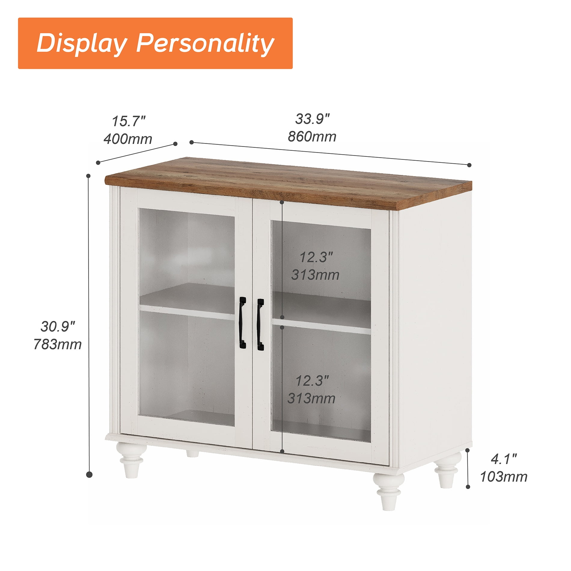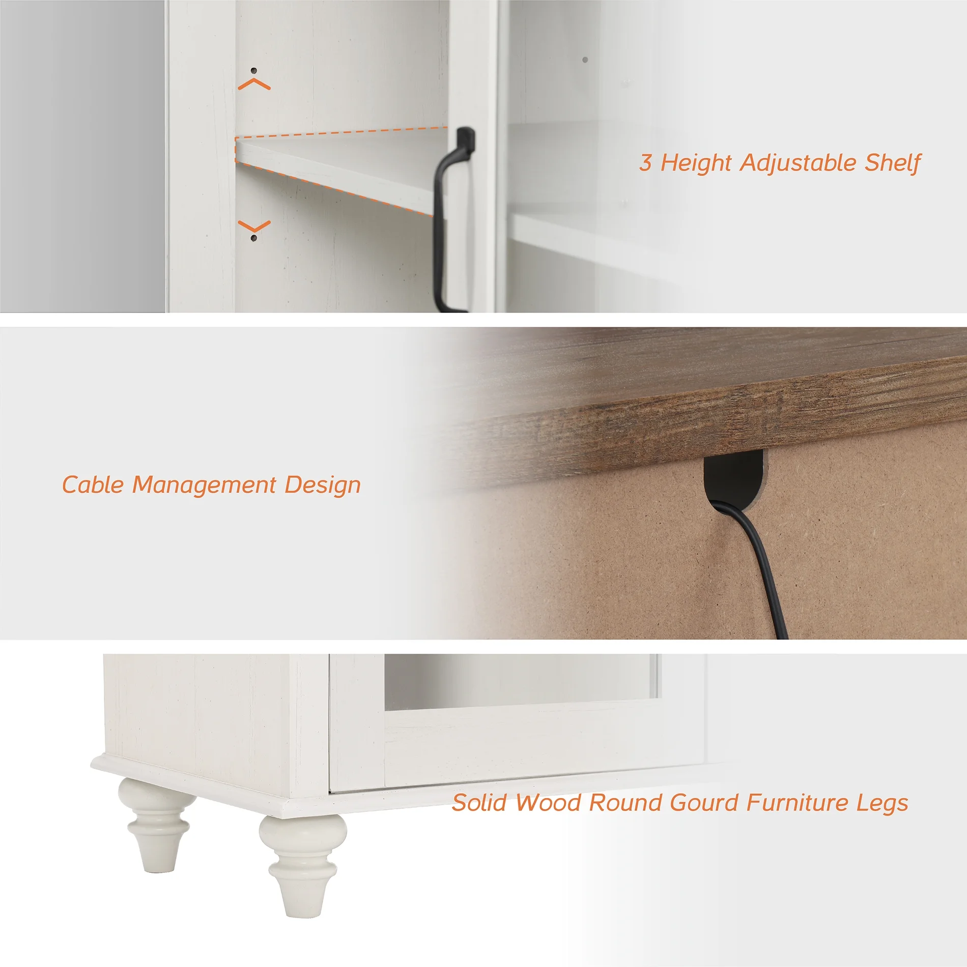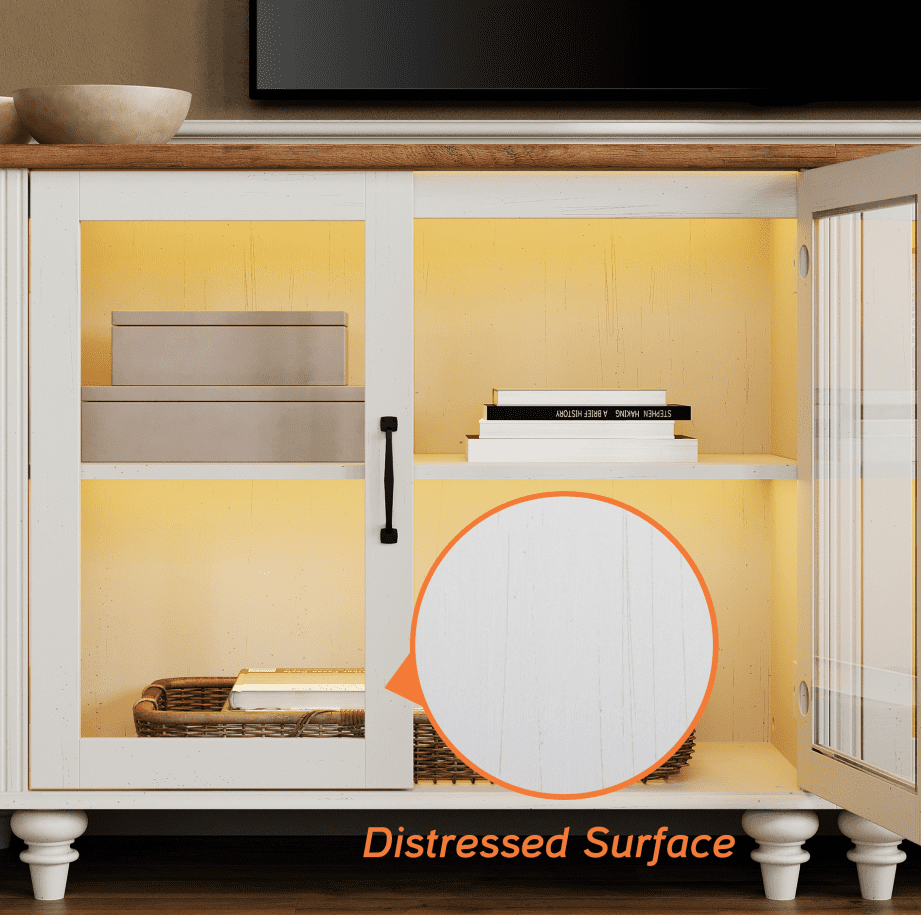 Elegant Appearance:Featuring off white distressed wood surface and mid century style, the tv stand for 43 inch tv is a perfect choice to add a touch of high-end and elegant charm to your room. Plus, the sideboard cabinet comes with a yellow led light so that you could DIY it to get more warmth. Multipurpose TV Stand:In addition to entertainment center, it can be placed in the dining room as a kitchen buffet cabinet or in the entryway as a console table. Overall Dimension: 33.9″×15.7″×30.9″(L×W×H). Adjustable Shelf & Glass Door: Designed with height adjustable shelf, you could manage the storage space according to the item size. It maximizes the available space of the room while providing functional storage. Additionally, the transparent tempered glass door of the white tv stand make it easy for you to find items you need.Weight Capacity of Glass Cabinet: 100 lbs. Easy to Assemble:The white tv stand is effortless to assemble with detailed instruction. And its surface is convenient to clean with a soft damp cloth. If you have any questions, please feel free to contact us, we will try our best to provide professional service.